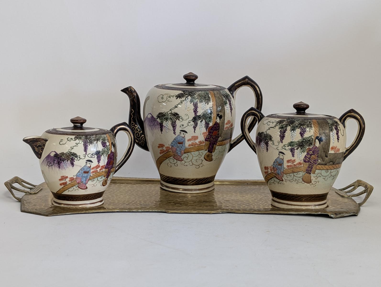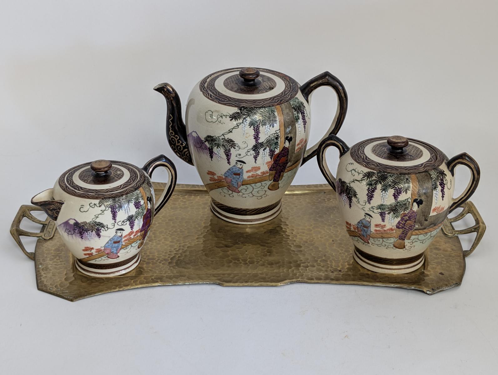 Antique 3 Piece Satsuma Tea Set with Brass Tray