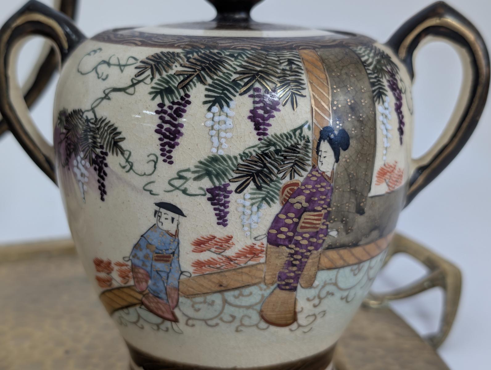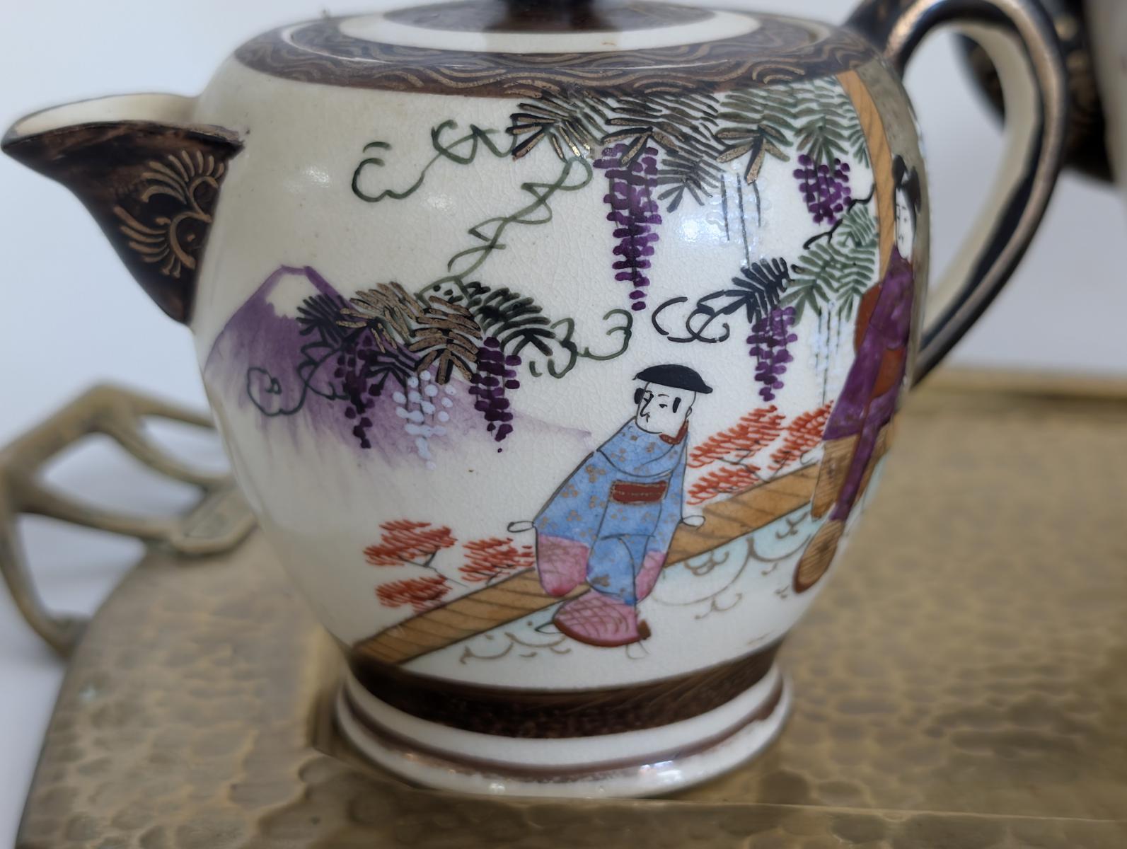 Antique 3 Piece Satsuma Tea Set with Brass Tray, PA6894MT