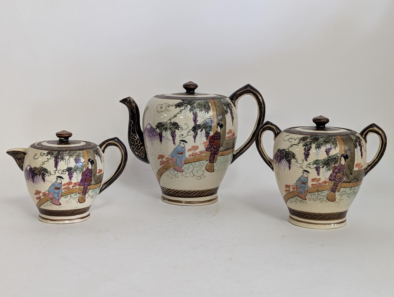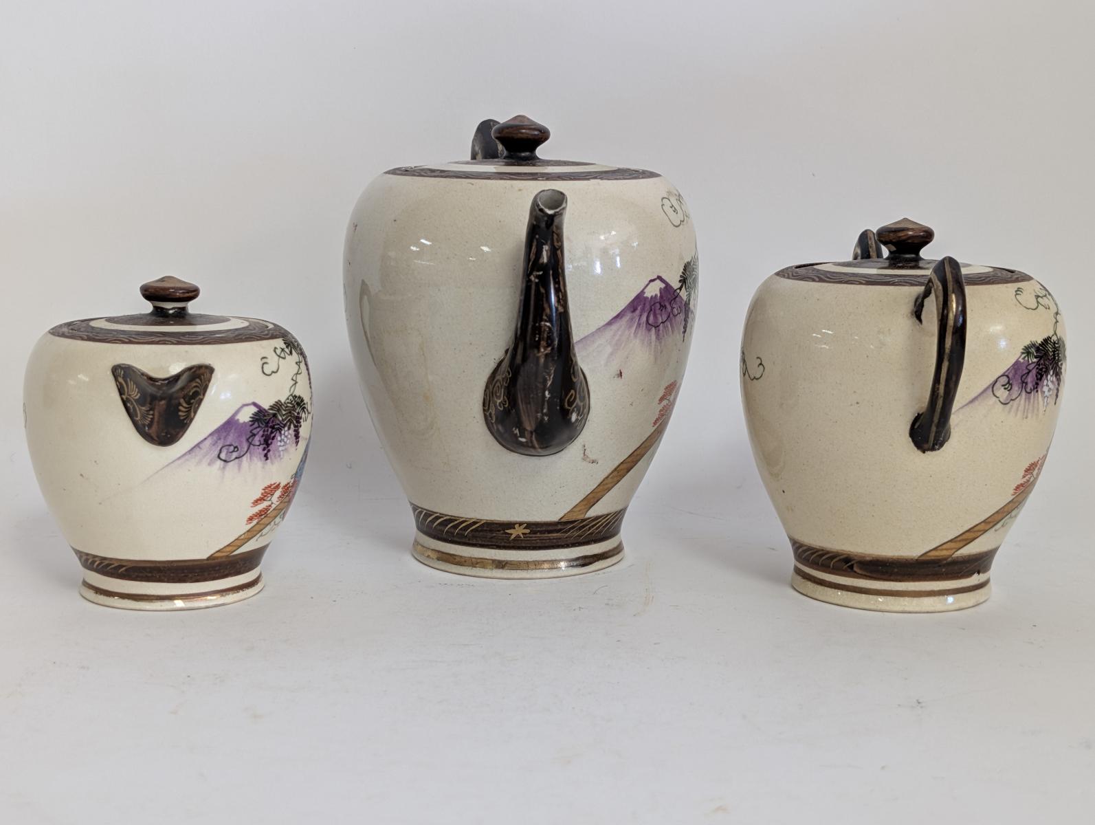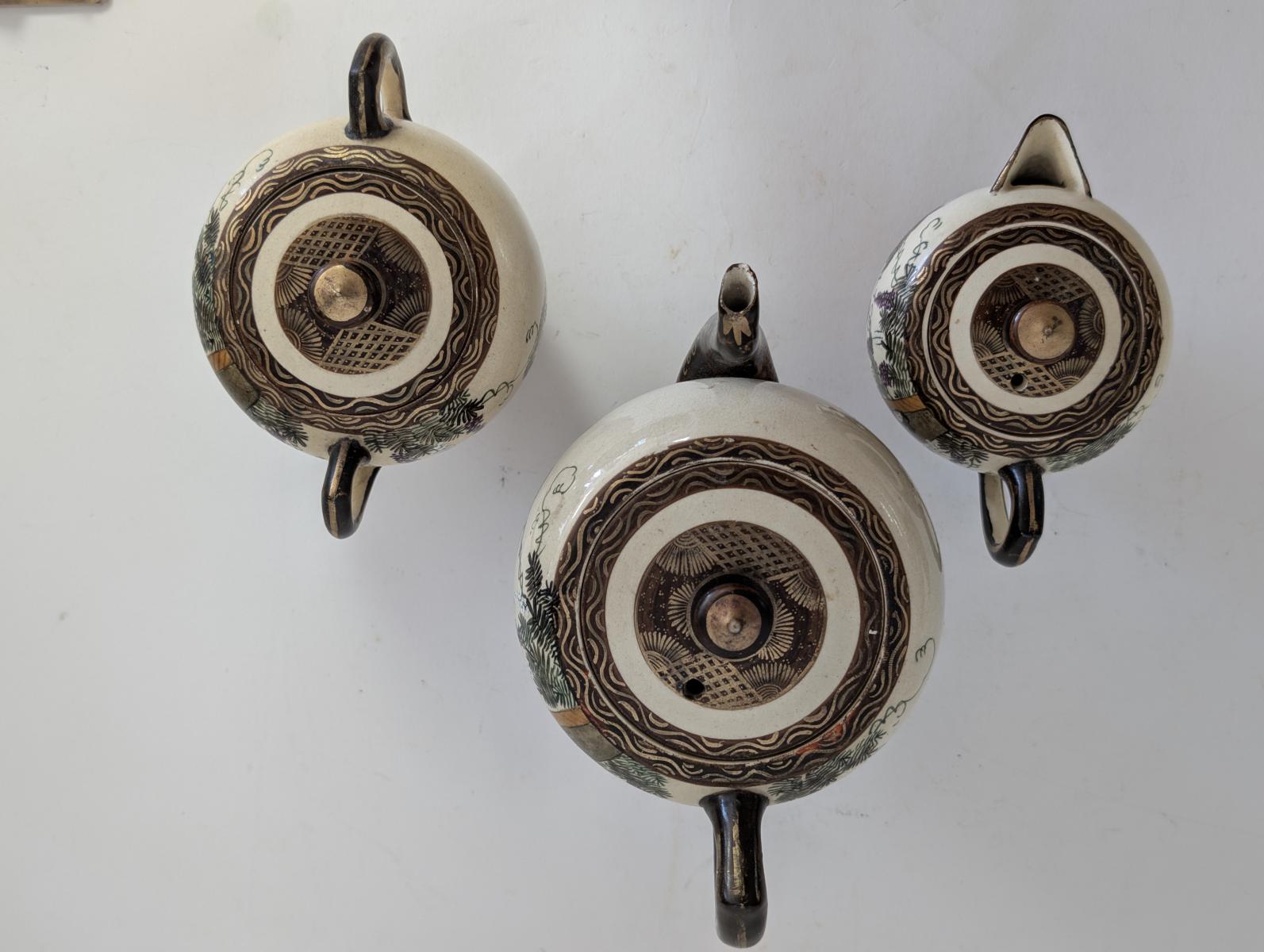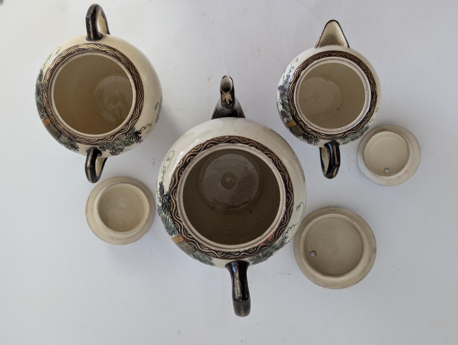 | FEATURES: | Antique 3 Piece Satsuma Tea Set with Brass Tray |