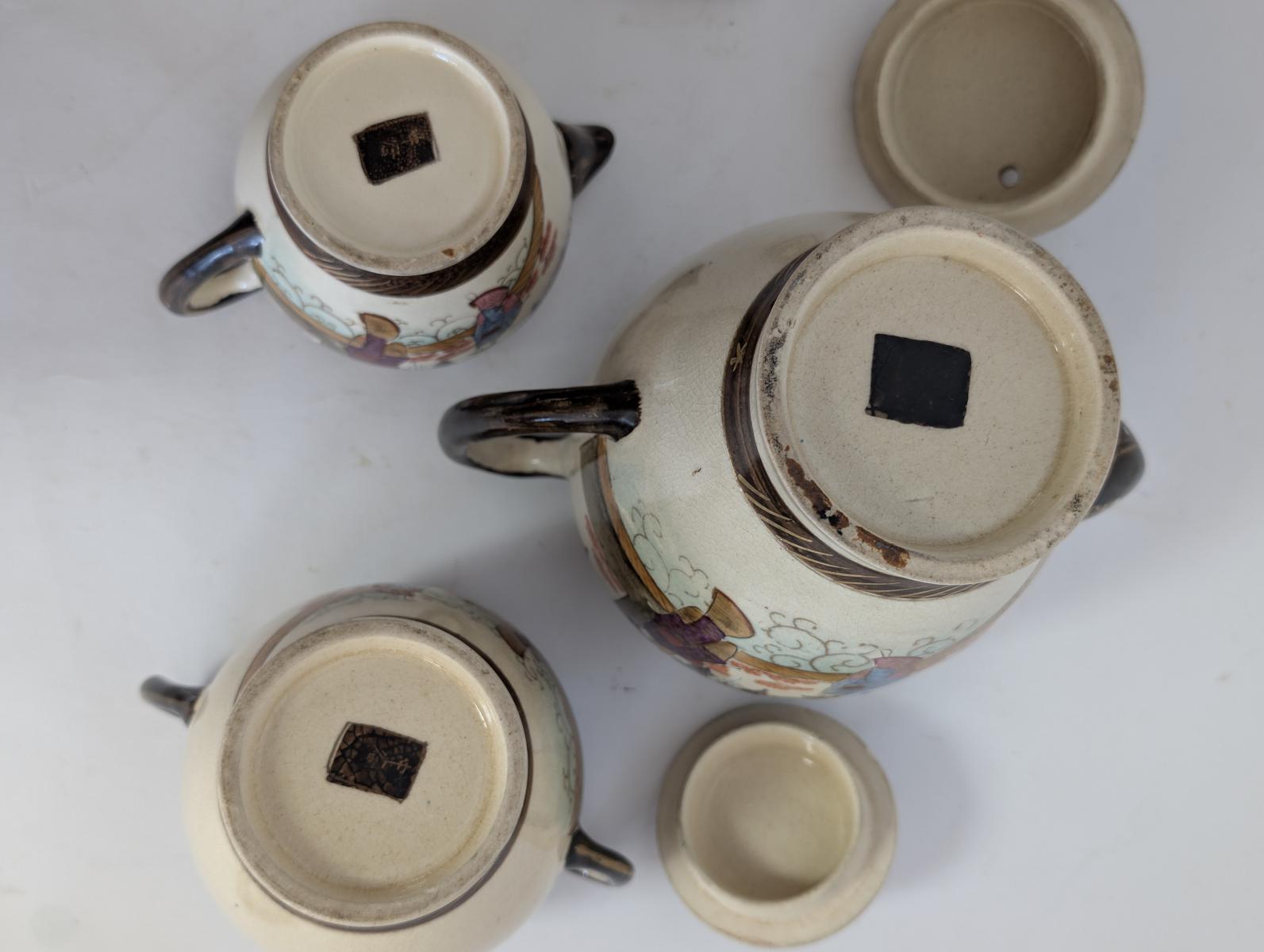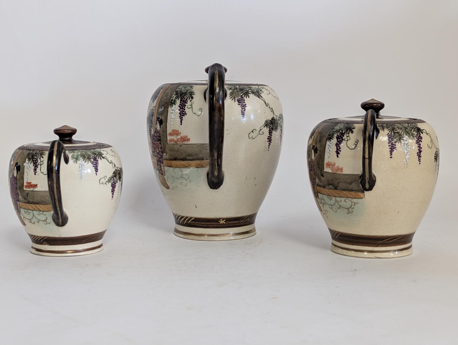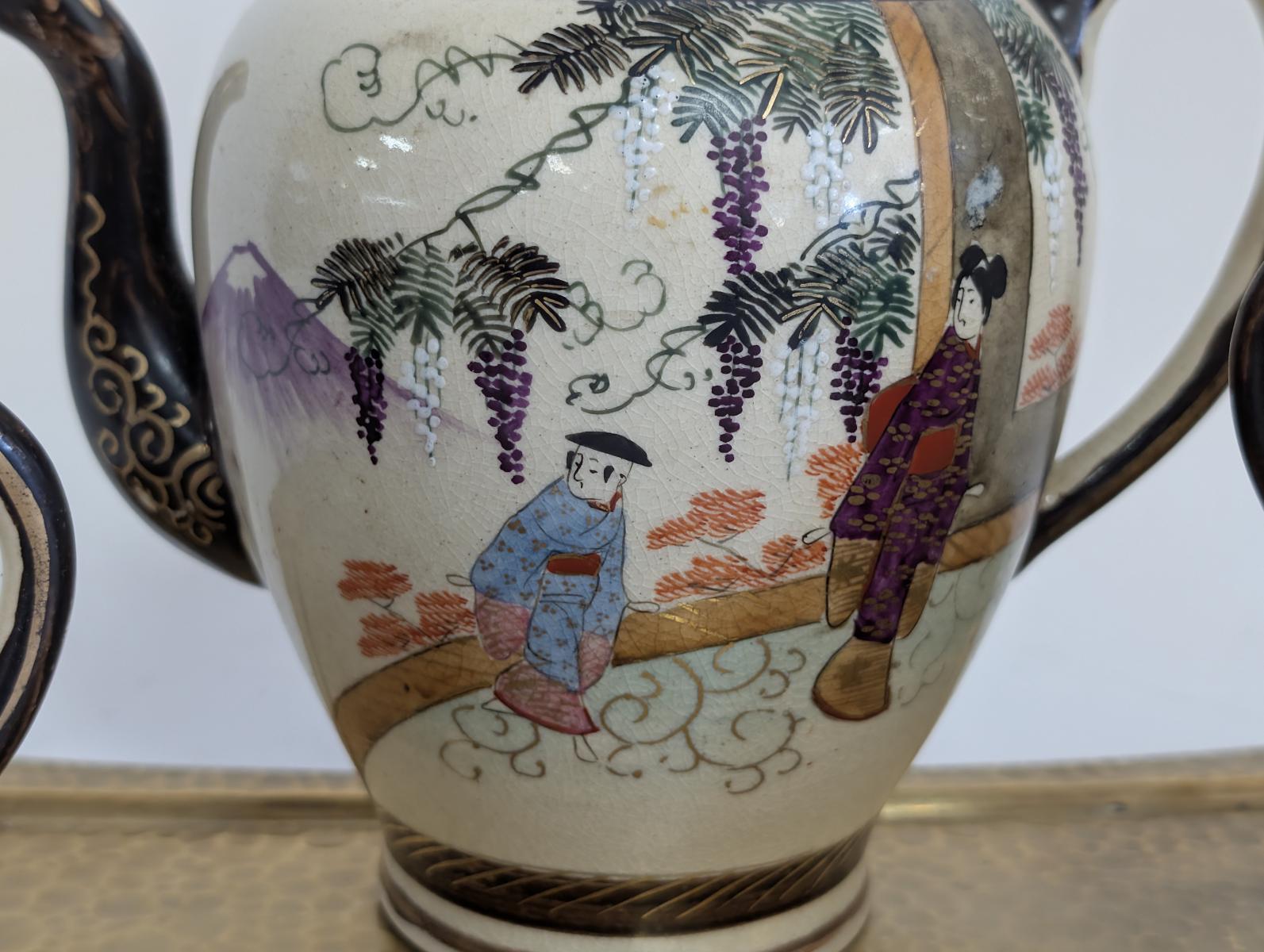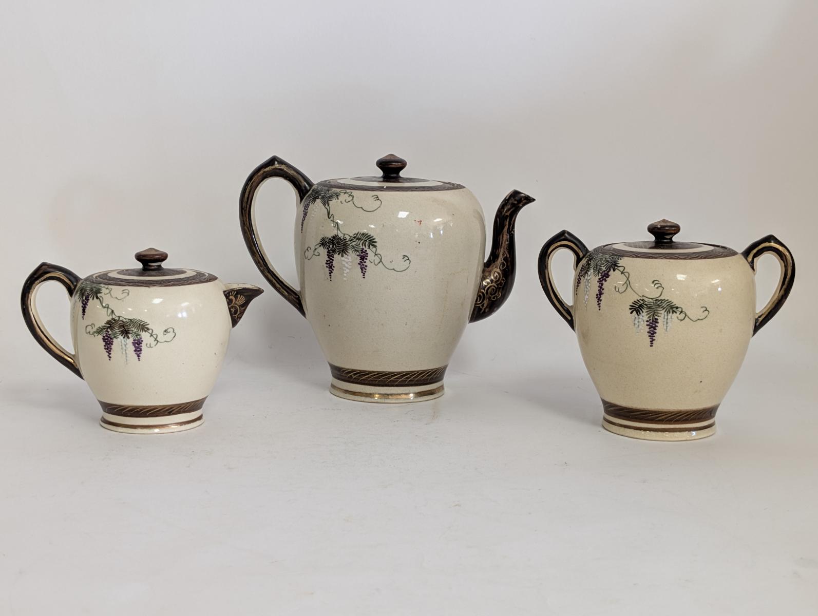| FEATURES: | Antique 3 Piece Satsuma Tea Set with Brass Tray |