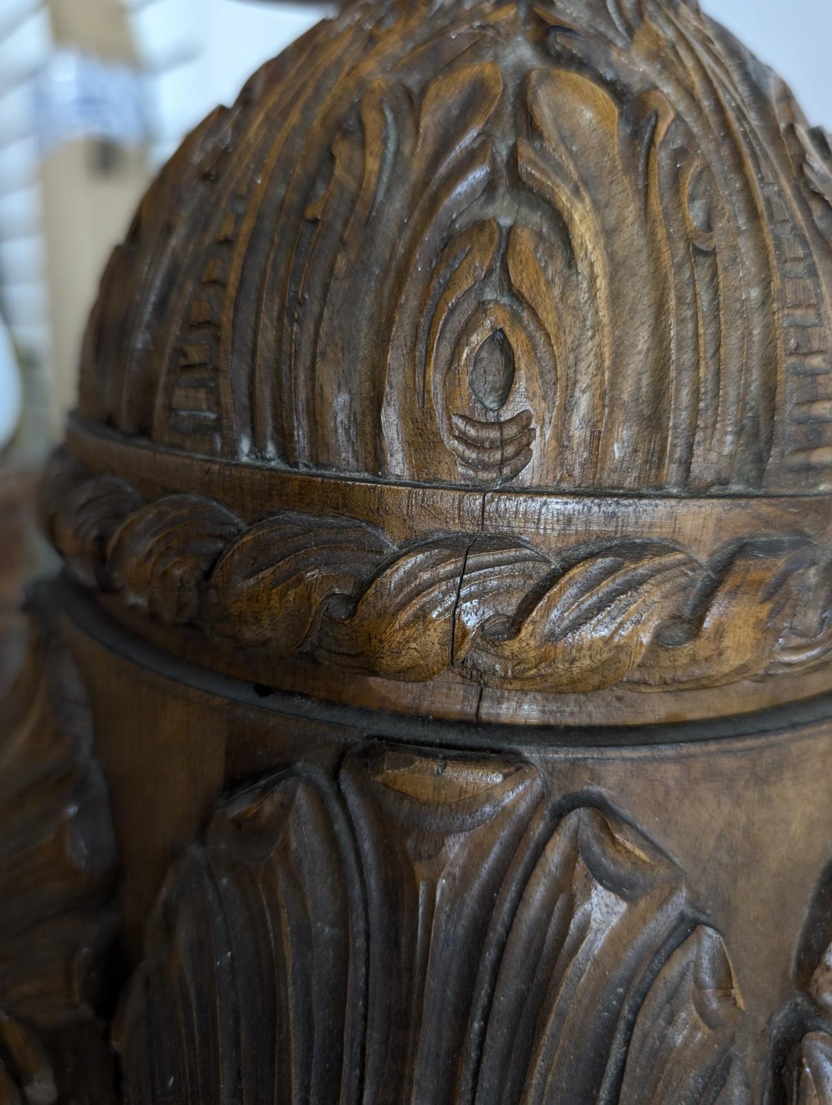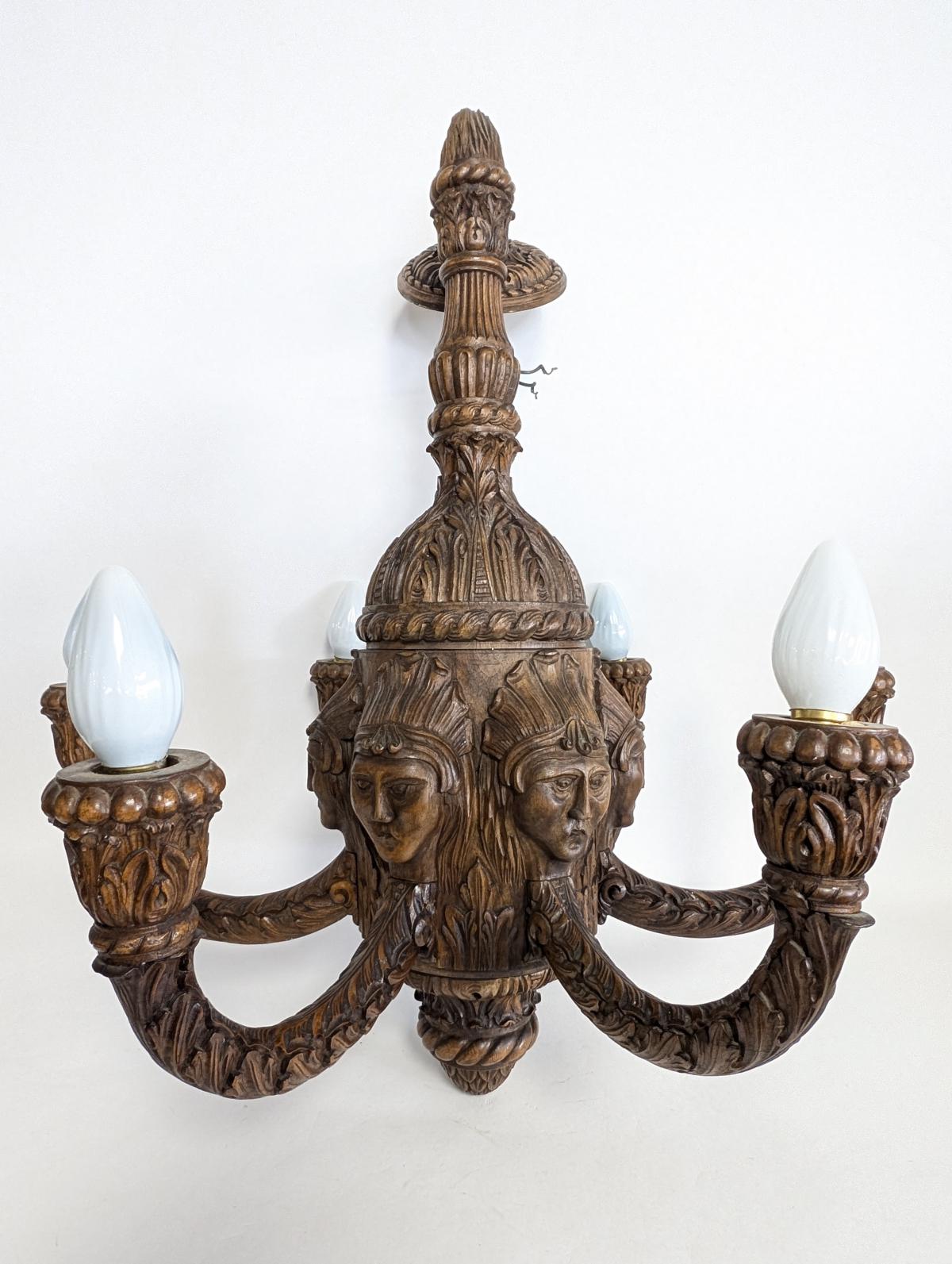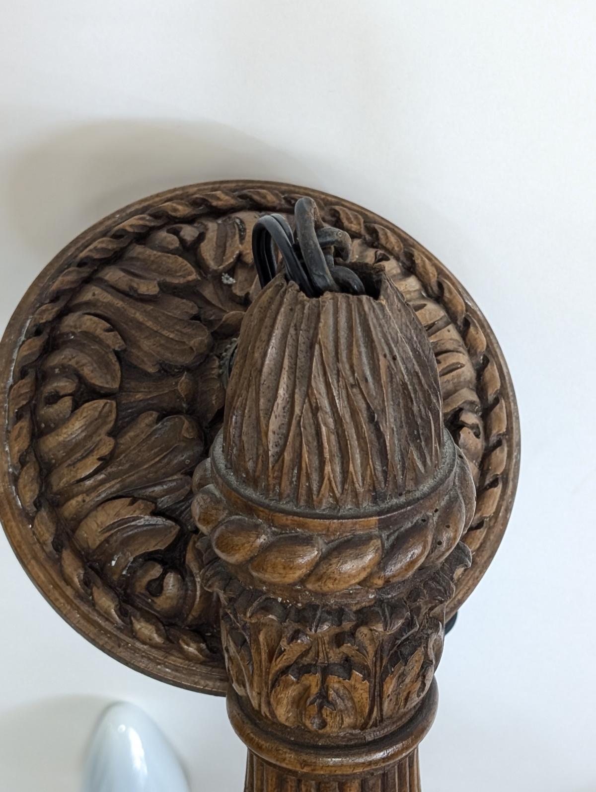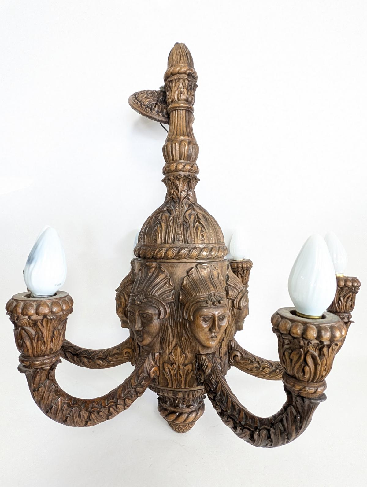 | FEATURES: | Magnificent Antique Carved Wood 6 Arm Chandelier, 30.5"H |
