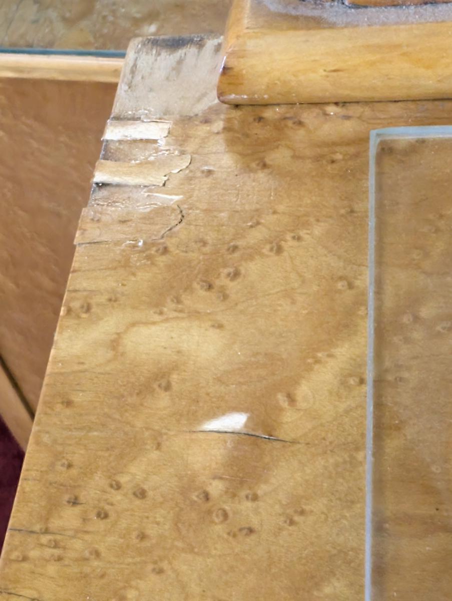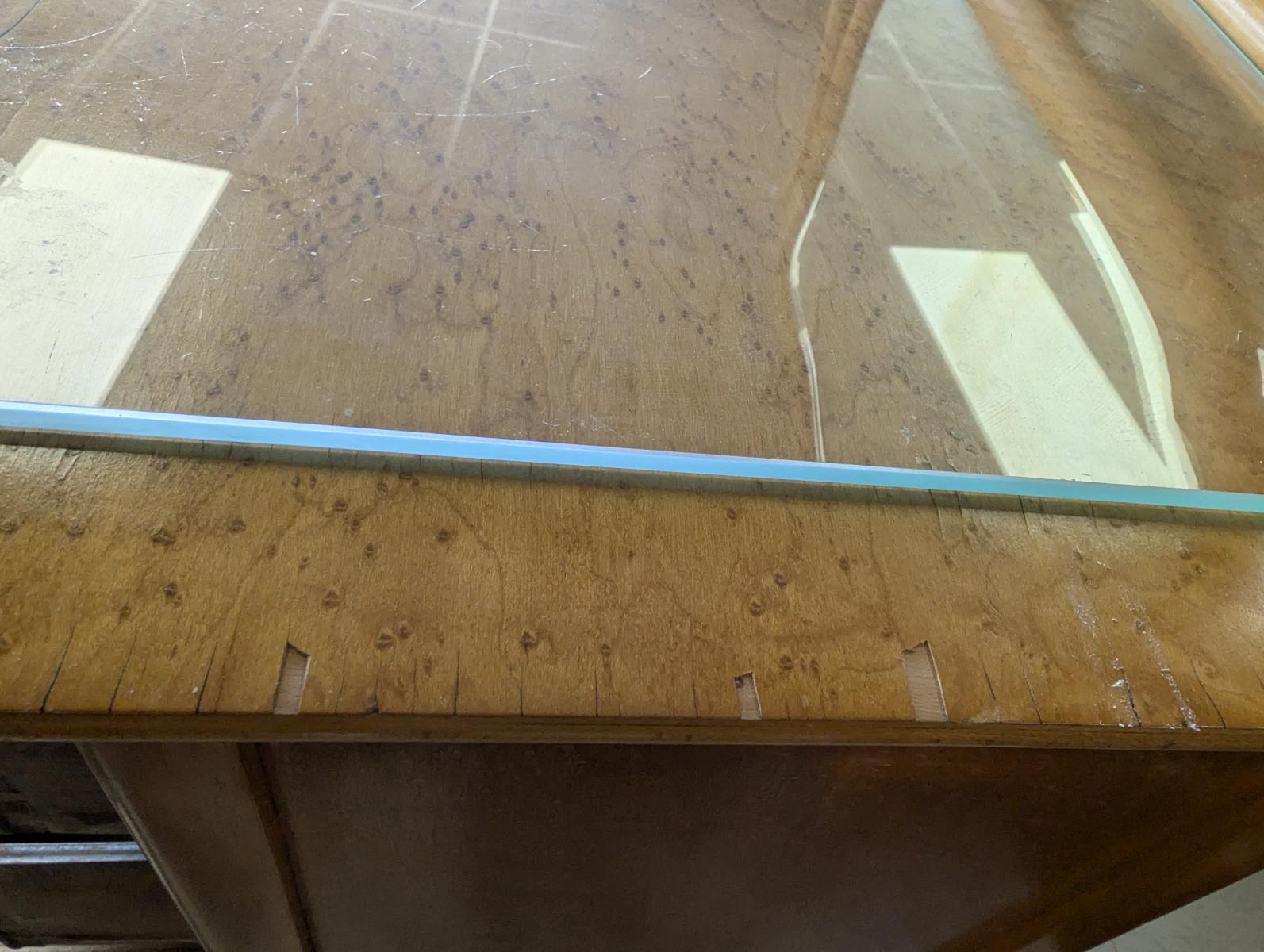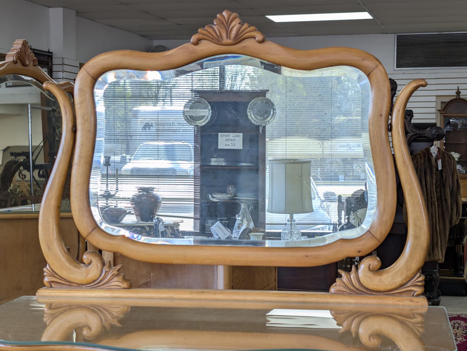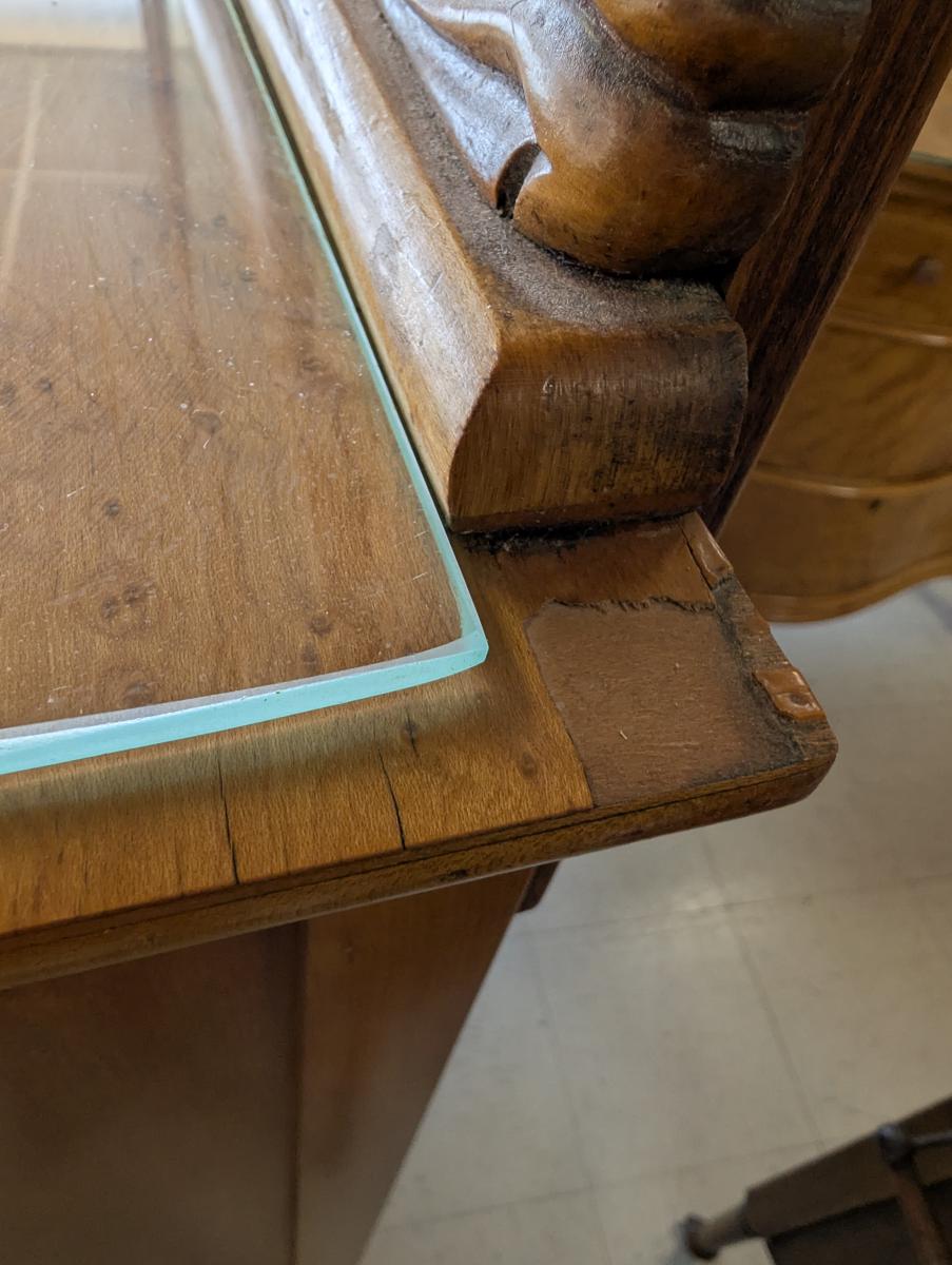 Good vintage condition with age-appropriate wear. Notable veneer losses and small repairs to the top edges, visible surface scratches and finish wear, minor separation lines consistent with age, and general use marks throughout. Drawers show expected wear but retain dovetail construction and function. Mirror glass shows light age-related waviness. Please view all photos for condition.