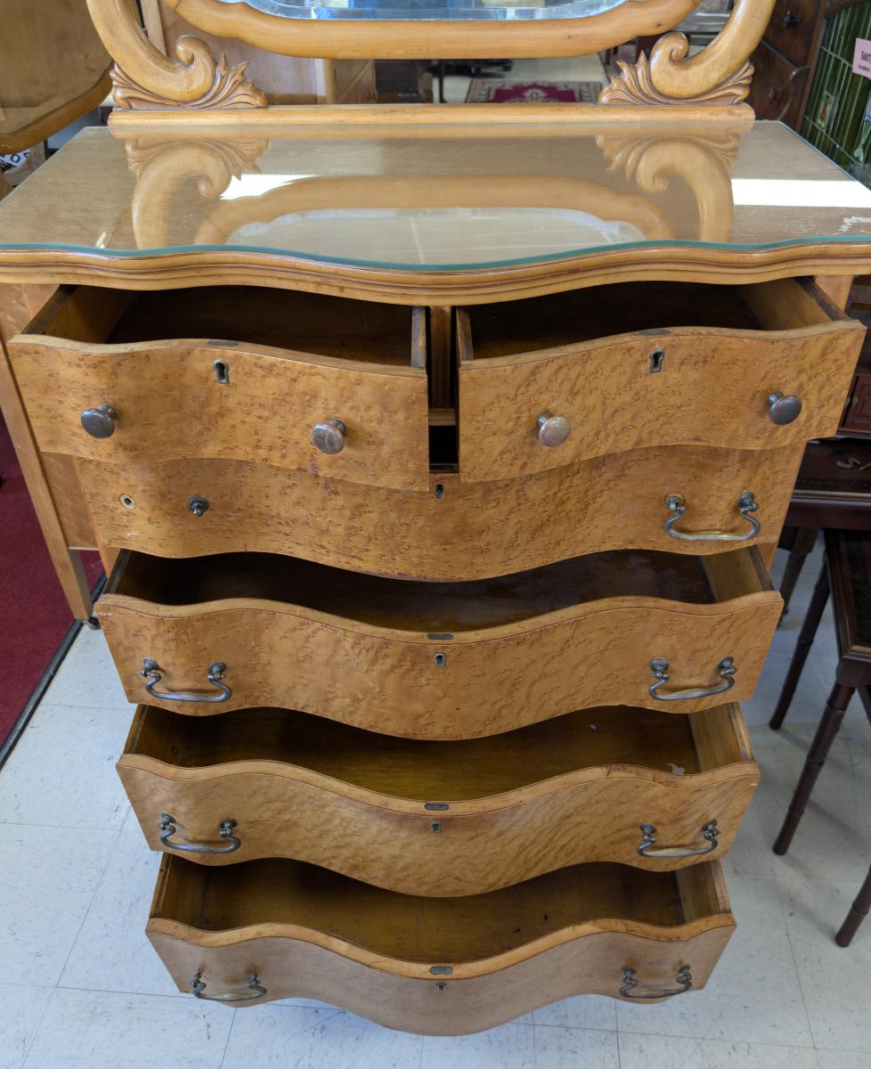 | FEATURES: | Antique French Provincial Burlwood Dresser with Mirror |