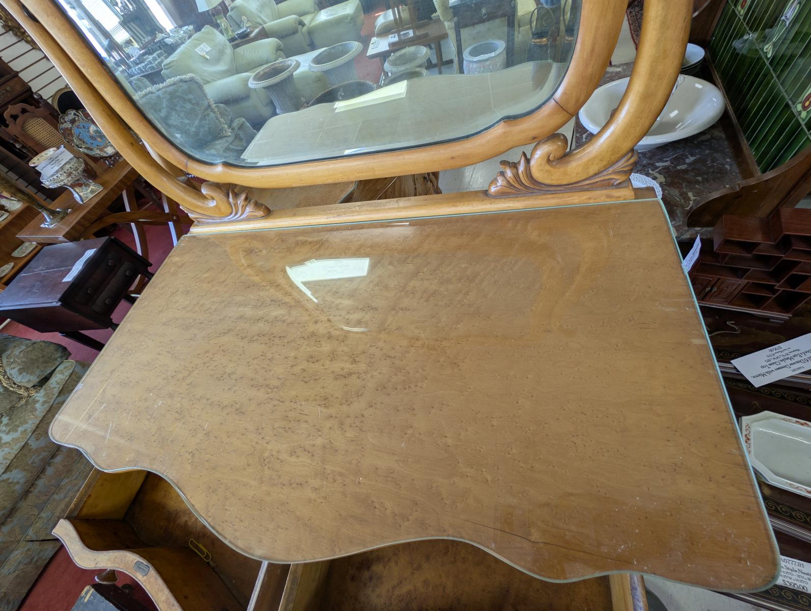 The dresser is raised on carved cabriole legs terminating in stylized claw-and-ball feet, adding a touch of formality and movement. Above, the original framed mirror is supported by shaped uprights with carved shell and scroll accents, completing the refined silhouette. The top is fitted with a protective glass surface, making it both practical and visually crisp.