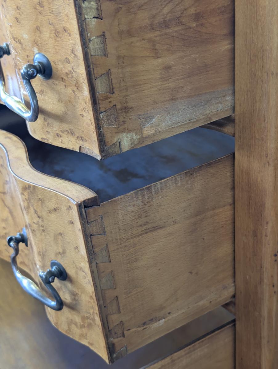 A beautifully styled vintage dresser in the French Provincial taste, showcasing richly figured burlwood veneers across a gracefully serpentine façade. The case features two small upper drawers over four long, undulating drawers, each fitted with period-style brass pulls and escutcheons. The warm honey-toned finish highlights the natural burl grain, giving the piece a lively and elegant surface presence.
