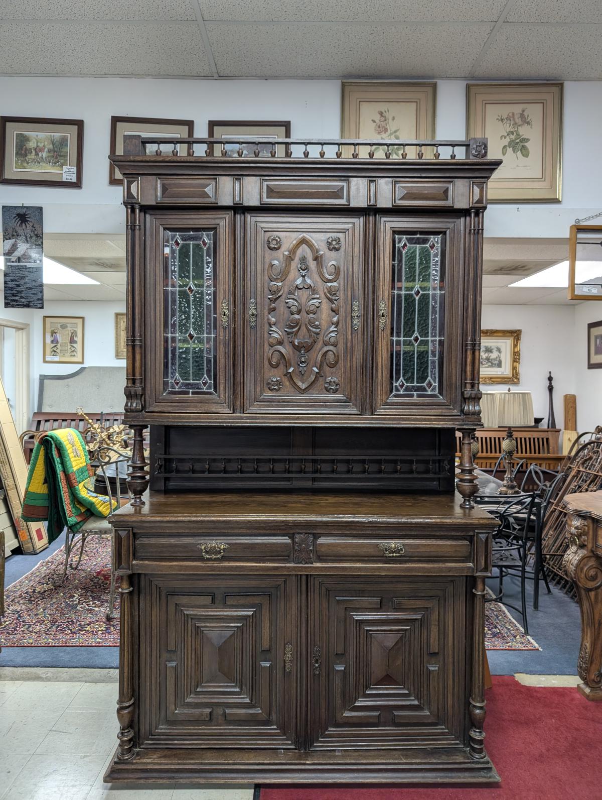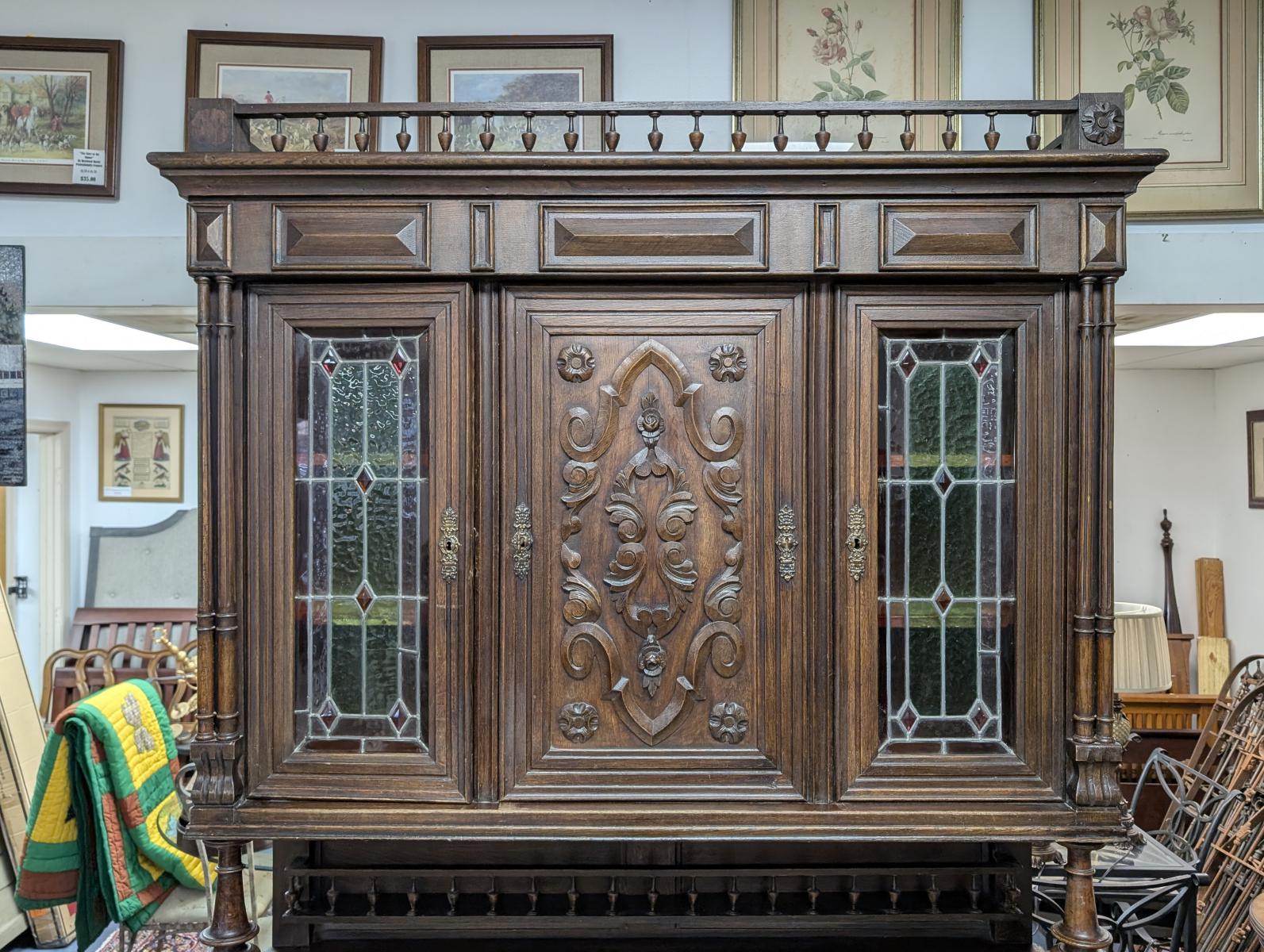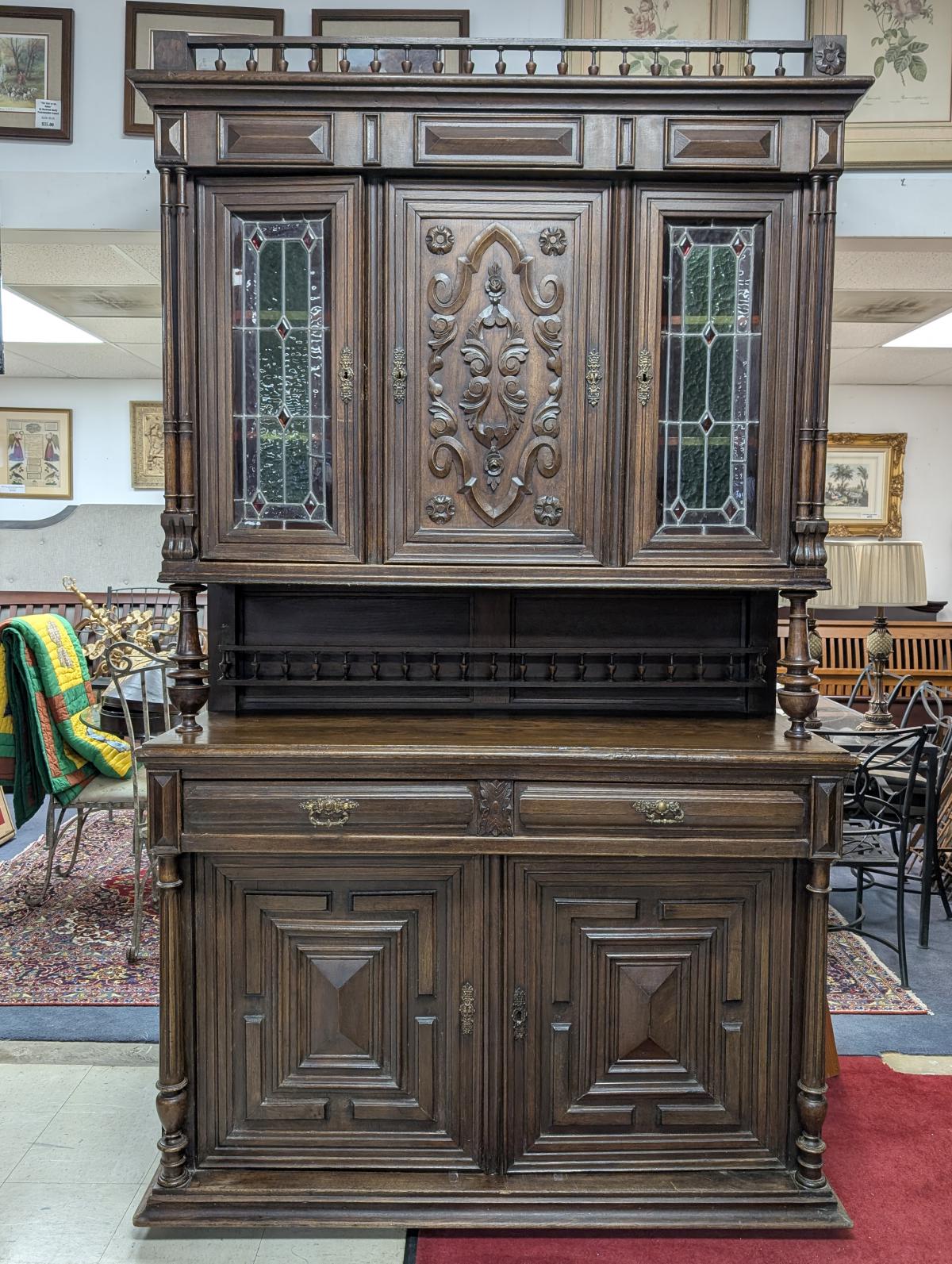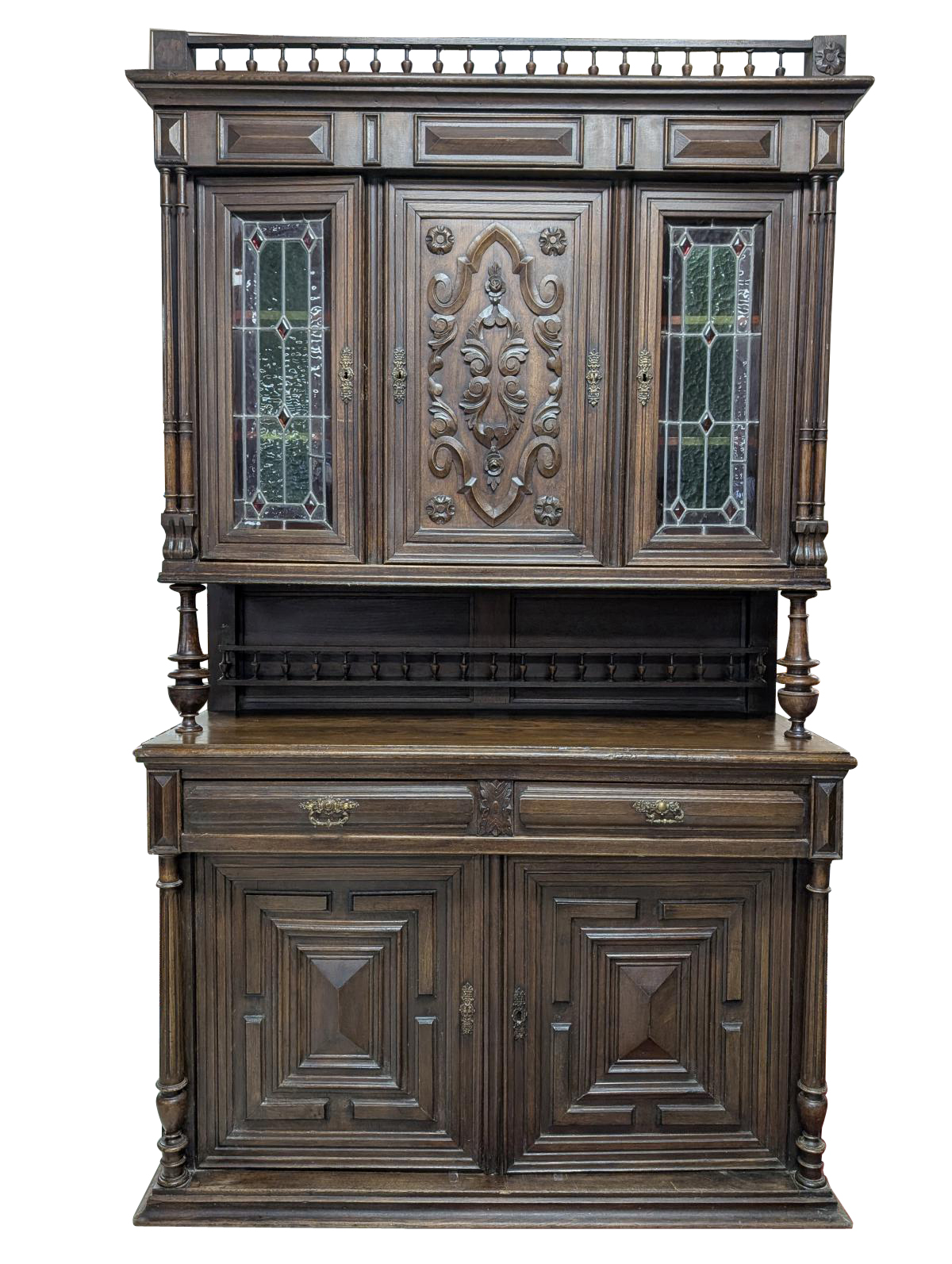 Antique Cupboard, Buffet Cabinet, Oak, 19th Century, Beautifully Carved 5 door cabinet, Spindle trim top, Top has two stained glass front doors and one carved wood door, Top is supported with 2 carved spindles, bottom has 2 drawers, Two doors open to large storage area with one shelf. Some of the hardware has been replaced, Comes with one key. Overall good condition, does show signs of wear due to age , Stained glass bulges slightly inward, Each piece has a small crack (please see photos). Extraordinary piece! Measures Overall: 96.5″H x 57″W x 23″D. Top Measures: 44″H x 55.5″W x 19″D. Bottom Measures: 52.5″H x 57″W x 23″D.