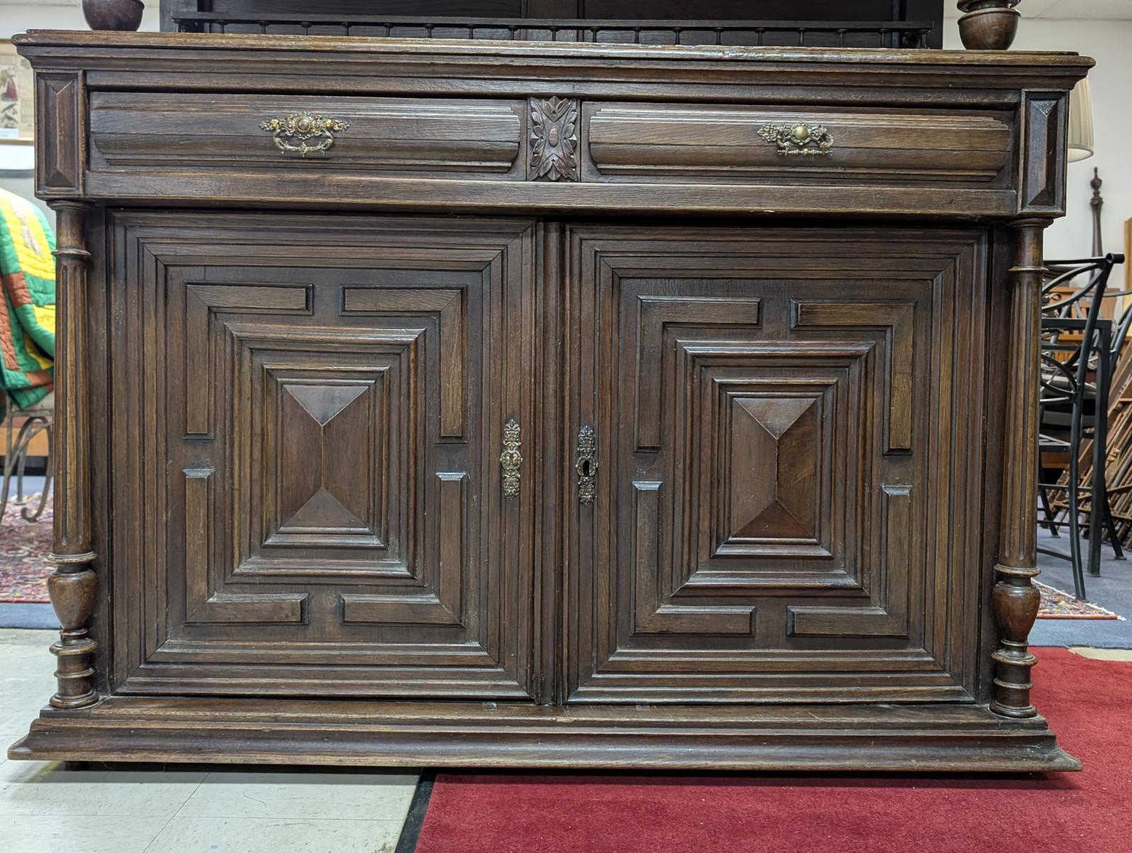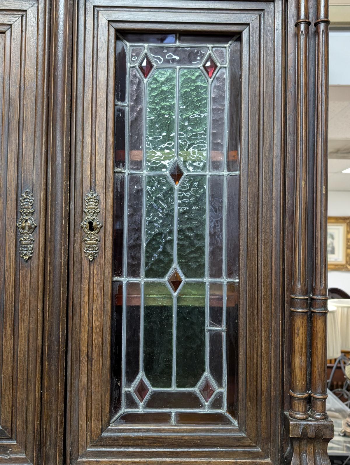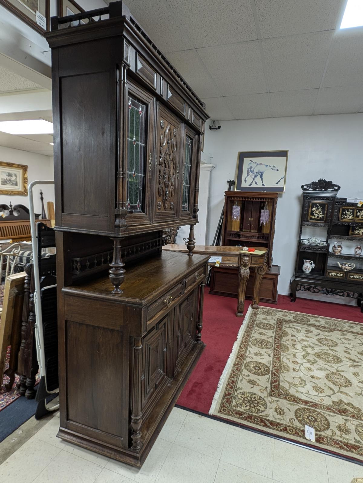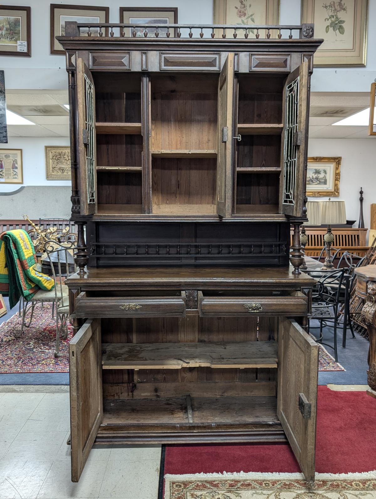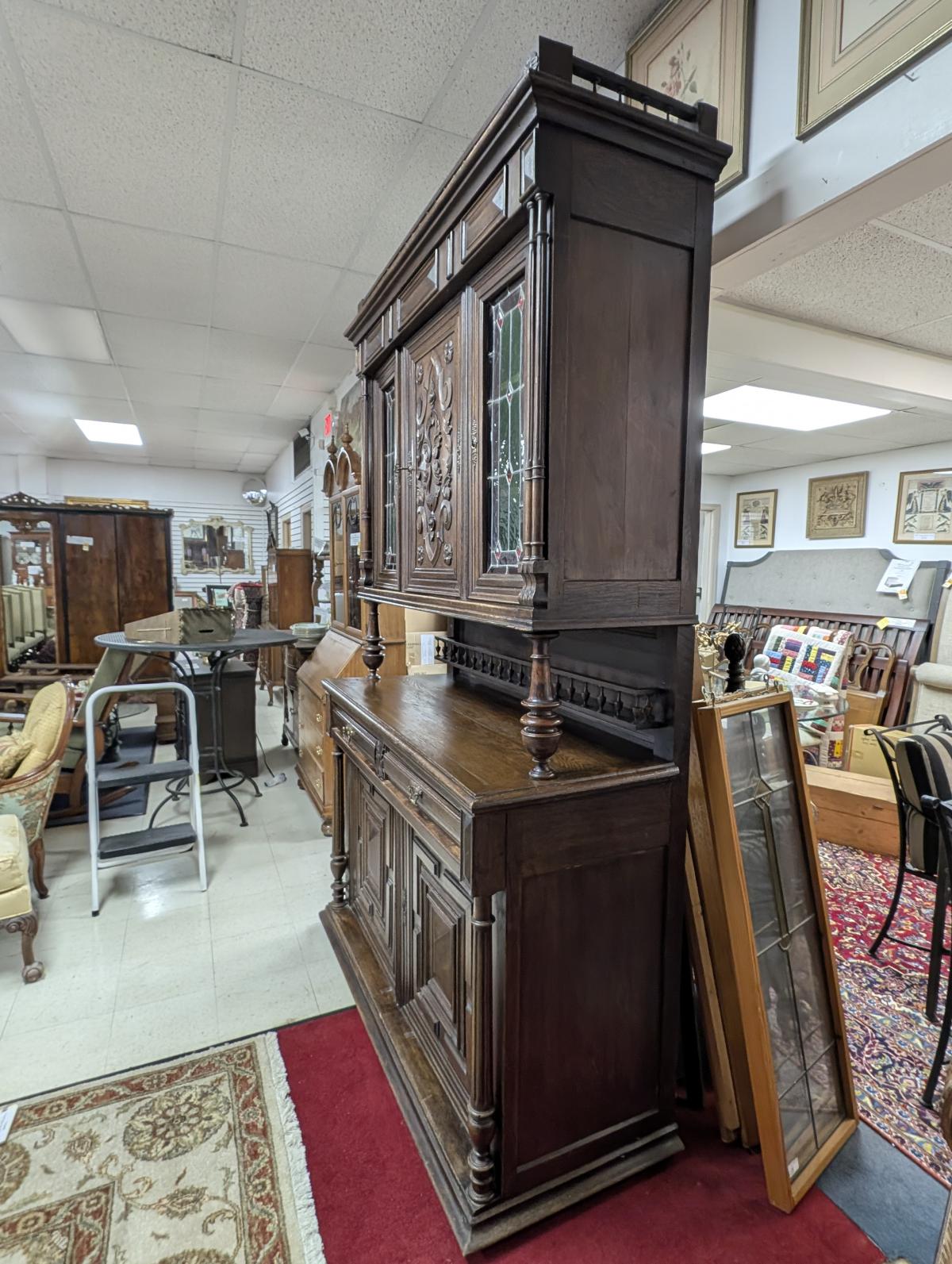 Antique Cupboard, Buffet Cabinet, Oak, 19th Century, Beautifully Carved 5 door cabinet, Spindle trim top, Top has two stained glass front doors and one carved wood door, Top is supported with 2 carved spindles, bottom has 2 drawers, Two doors open to large storage area with one shelf. Some of the hardware has been replaced, Comes with one key. Overall good condition, does show signs of wear due to age , Stained glass bulges slightly inward, Each piece has a small crack (please see photos). Extraordinary piece! Measures Overall: 96.5″H x 57″W x 23″D. Top Measures: 44″H x 55.5″W x 19″D. Bottom Measures: 52.5″H x 57″W x 23″D.