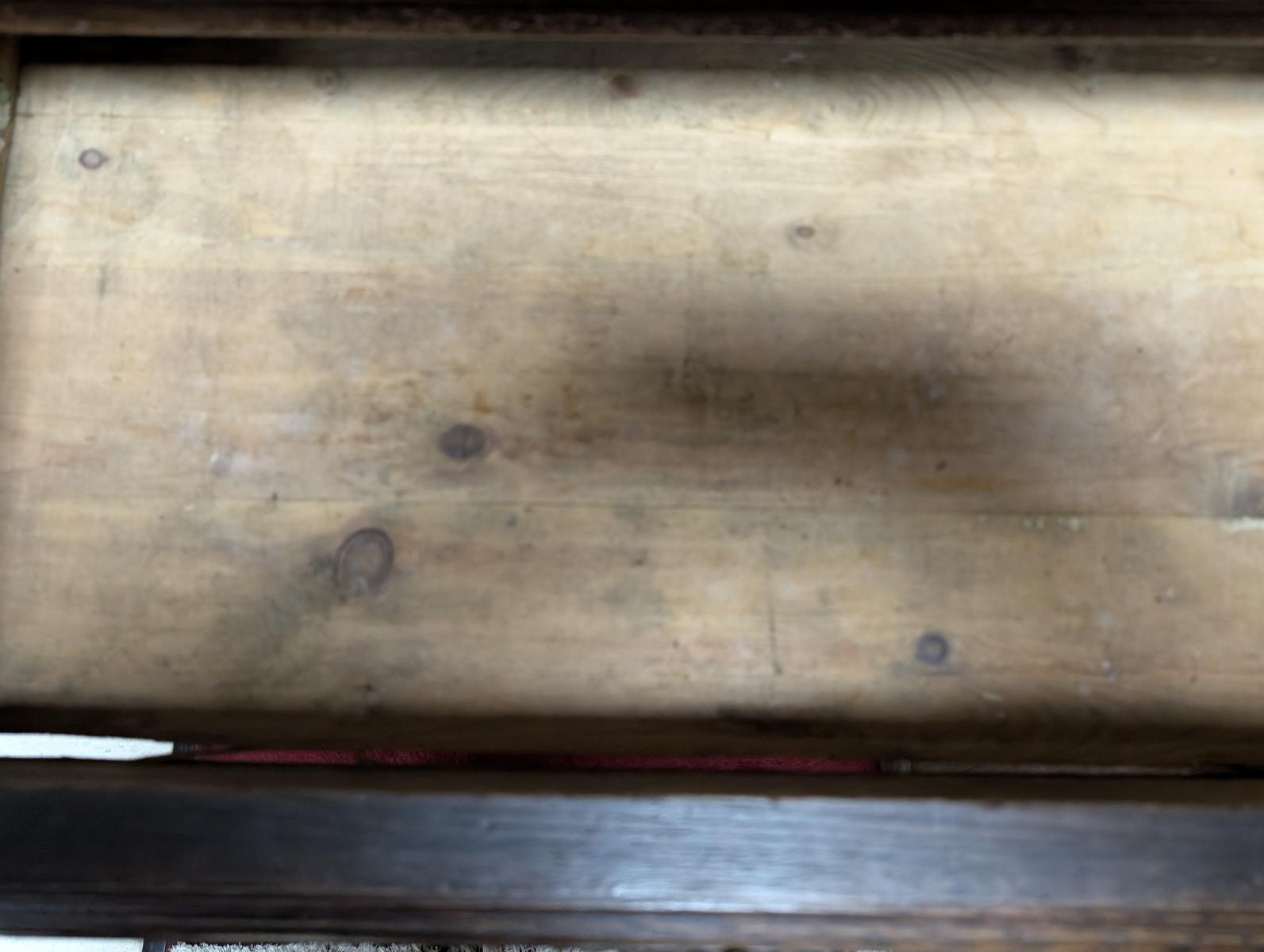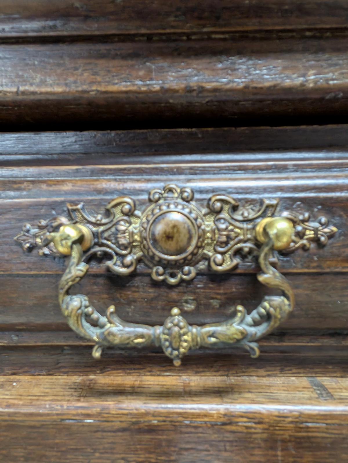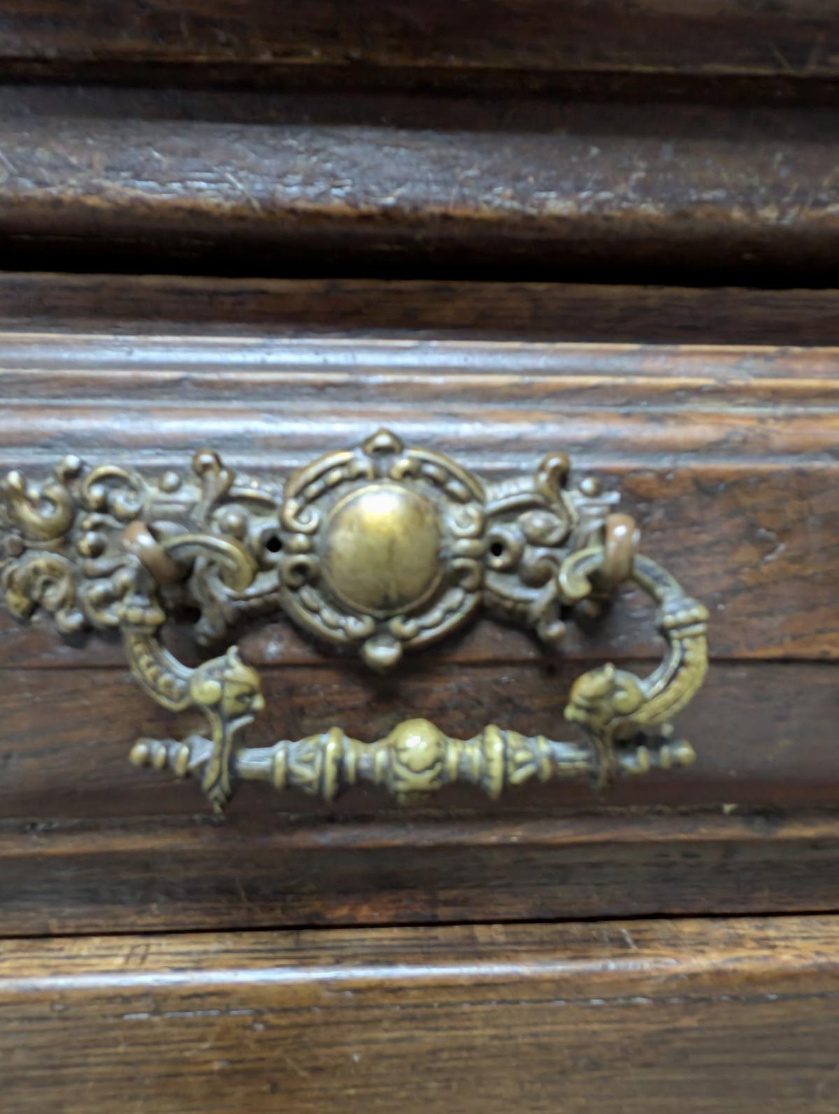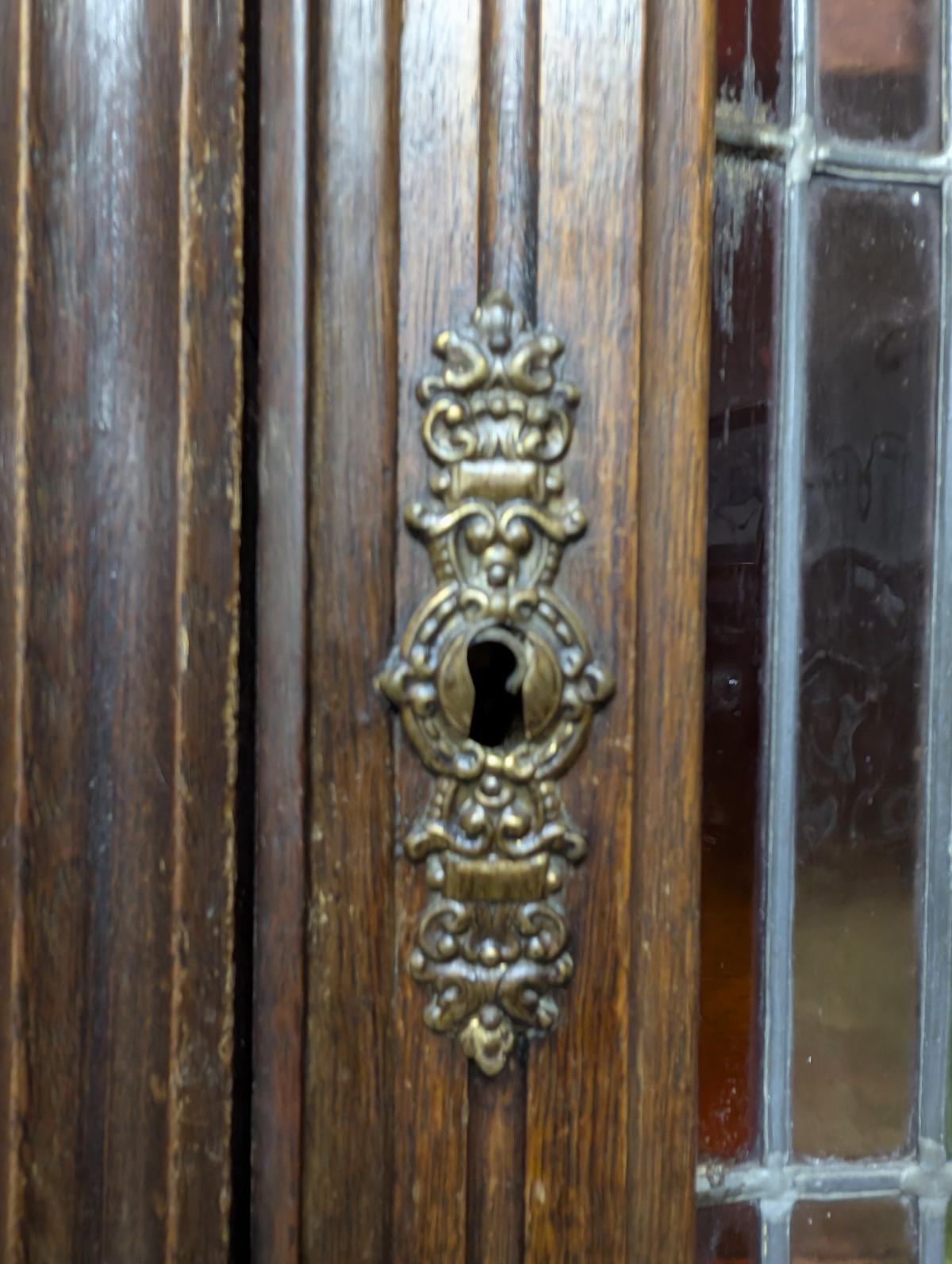 Antique Cupboard, Buffet Cabinet, Oak, 19th Century, Beautifully Carved 5 door cabinet, Spindle trim top, Top has two stained glass front doors and one carved wood door, Top is supported with 2 carved spindles, bottom has 2 drawers, Two doors open to large storage area with one shelf. Some of the hardware has been replaced, Comes with one key. Overall good condition, does show signs of wear due to age , Stained glass bulges slightly inward, Each piece has a small crack (please see photos). Extraordinary piece! Measures Overall: 96.5″H x 57″W x 23″D. Top Measures: 44″H x 55.5″W x 19″D. Bottom Measures: 52.5″H x 57″W x 23″D.