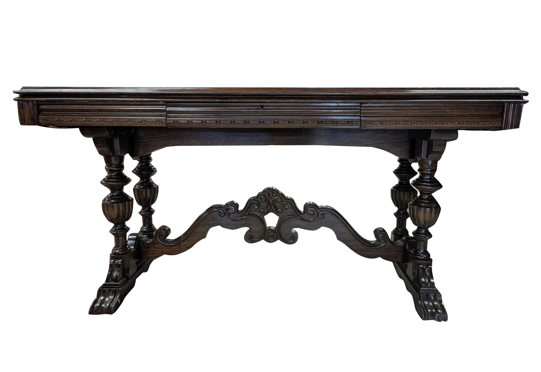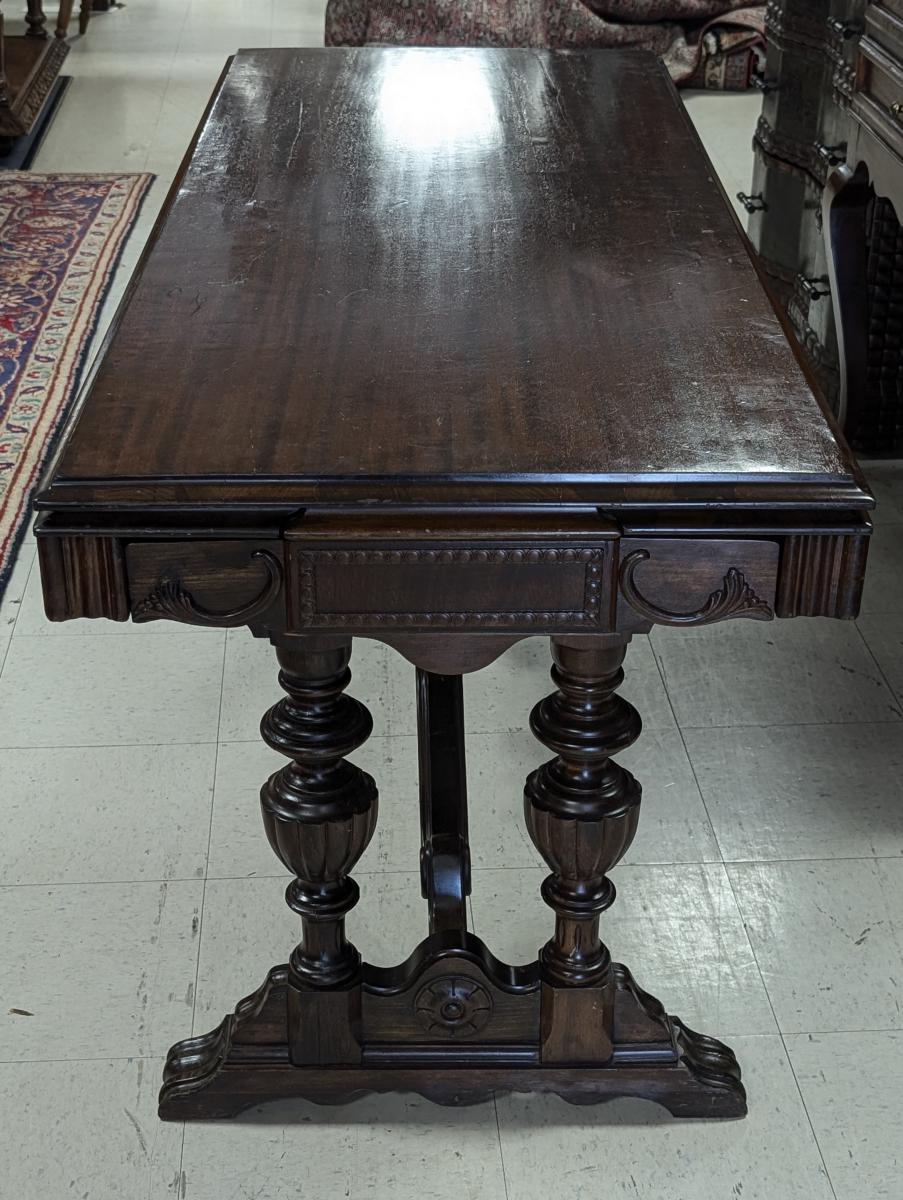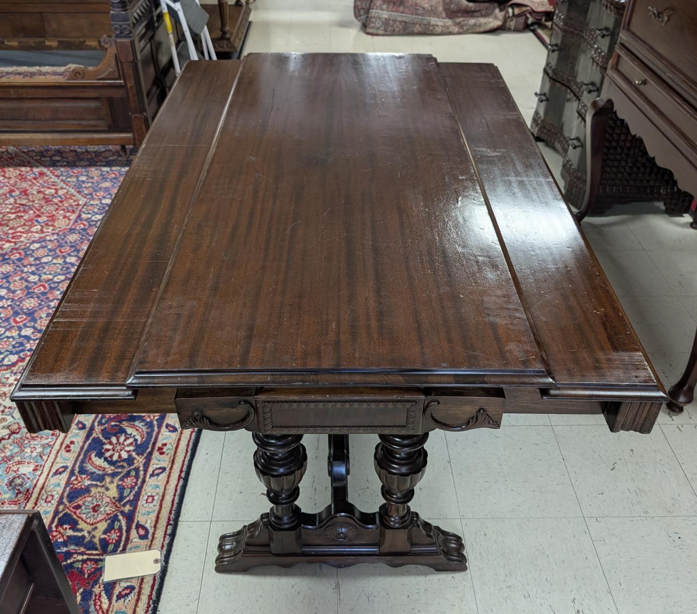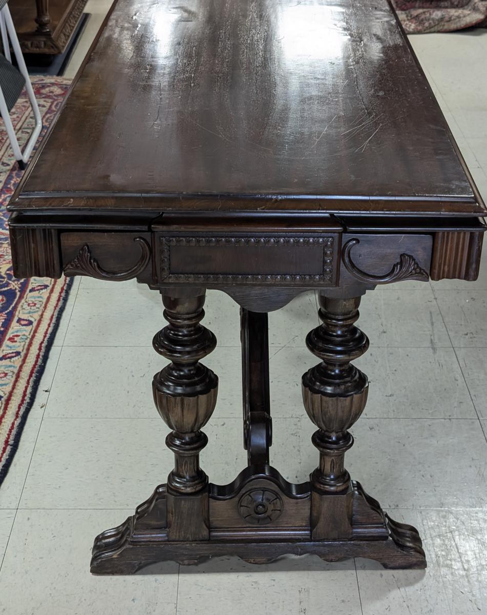 Antique, Jacobean Style, Mahogany, Smooth top, Carved edges, Table lets out on either side for more surface space, Drawer on one side with dividers, carved trestle base. Very good overall condition, does have signs of age and use wear, Some veneer issues. Sides are a little hard to pull out. See all photos for condition. Measures: Closed 30″H x 25.5″W x 60″Long. Open: 30″H x 39″W x 60″Long.