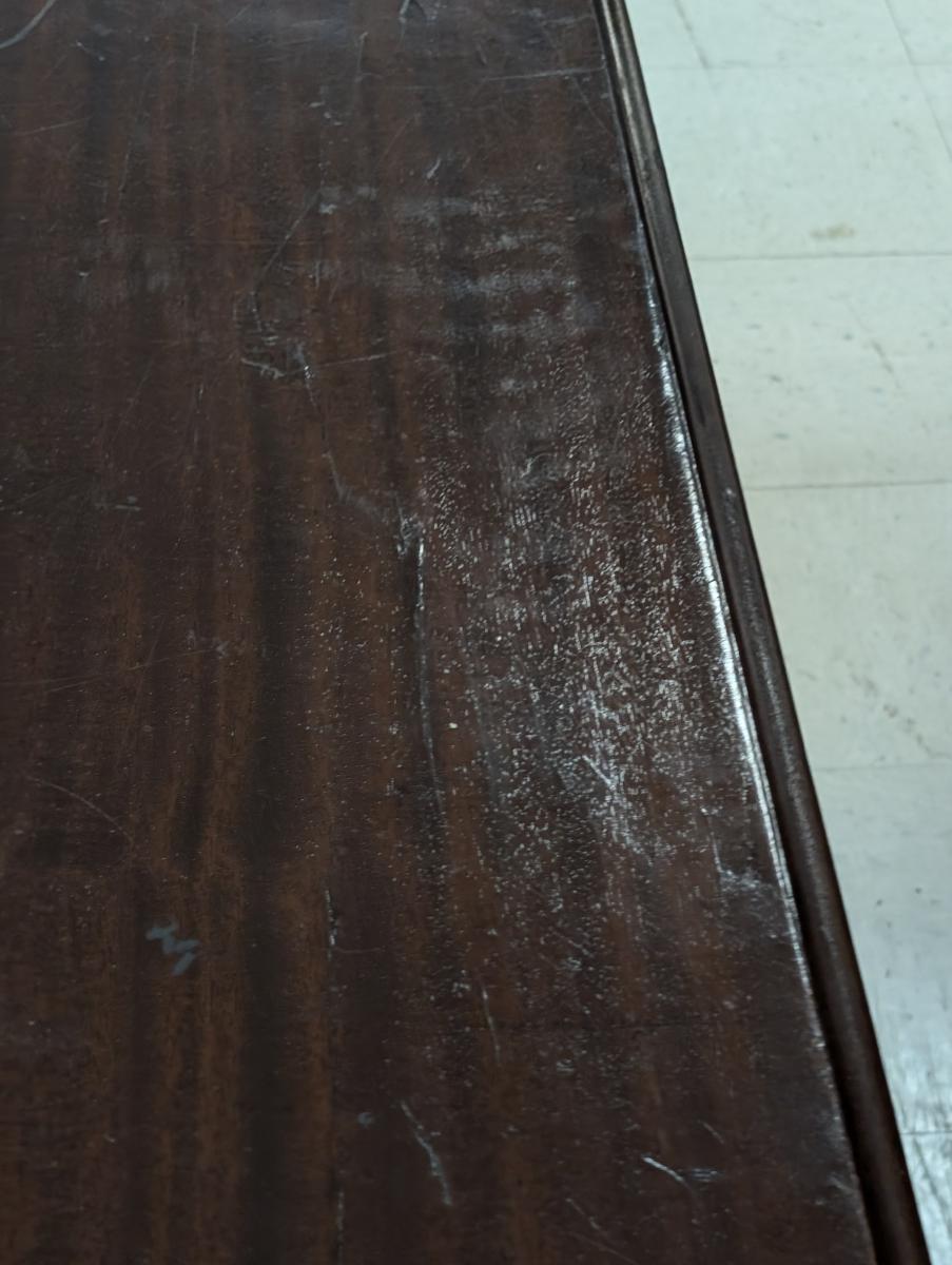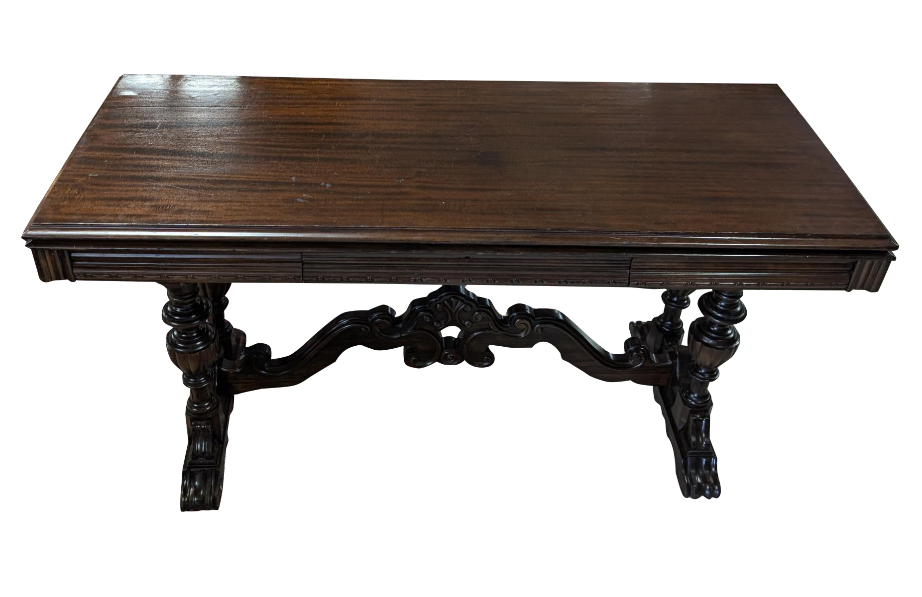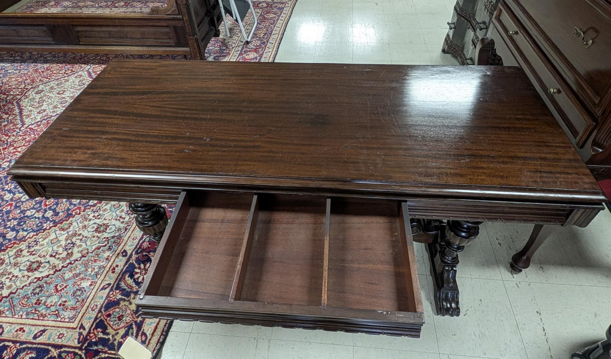 Antique, Jacobean Style, Mahogany, Smooth top, Carved edges, Table lets out on either side for more surface space, Drawer on one side with dividers, carved trestle base. Very good overall condition, does have signs of age and use wear, Some veneer issues. Sides are a little hard to pull out. See all photos for condition. Measures: Closed 30″H x 25.5″W x 60″Long. Open: 30″H x 39″W x 60″Long.