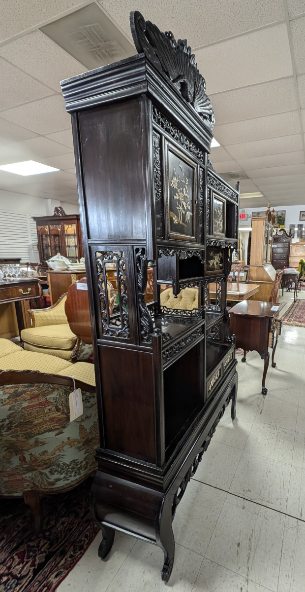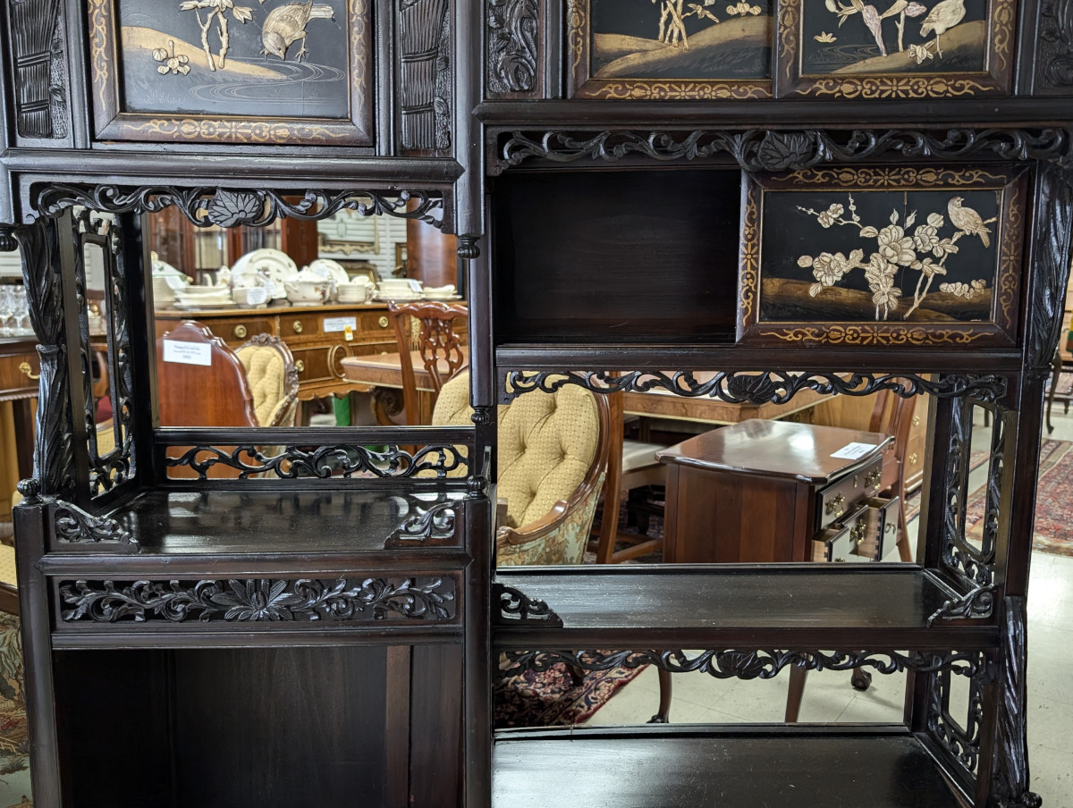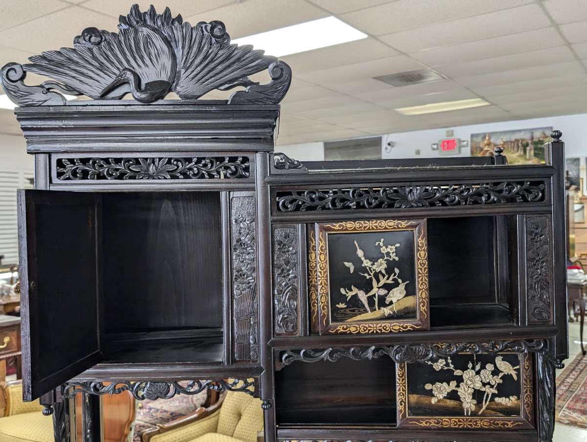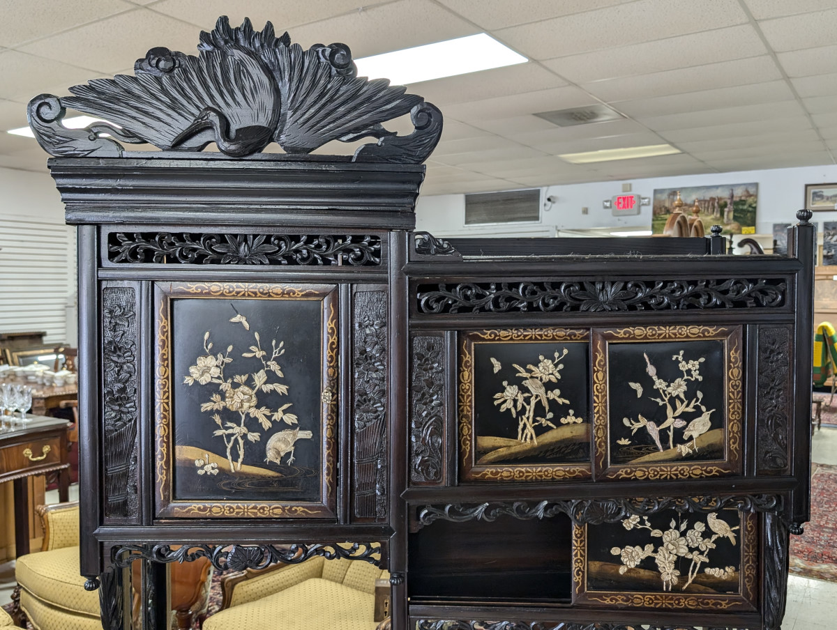 Outstanding Meijing Shibayama cabinet, Hand-carved wood, Sliding doors, Made in Japan, Carved top piece, Carved relief floral, butterfly and bird arrangements on all of the doors, Carvings appear to be bone, A true masterpiece that will become the focal point of any room or could also be mixed in a mid-century modern organic living room or kitchen. Great overall appearance with some age cracks, some missing pieces. See all photos for condition. Measures: 78″H x 43.5″W x 12.5″D.