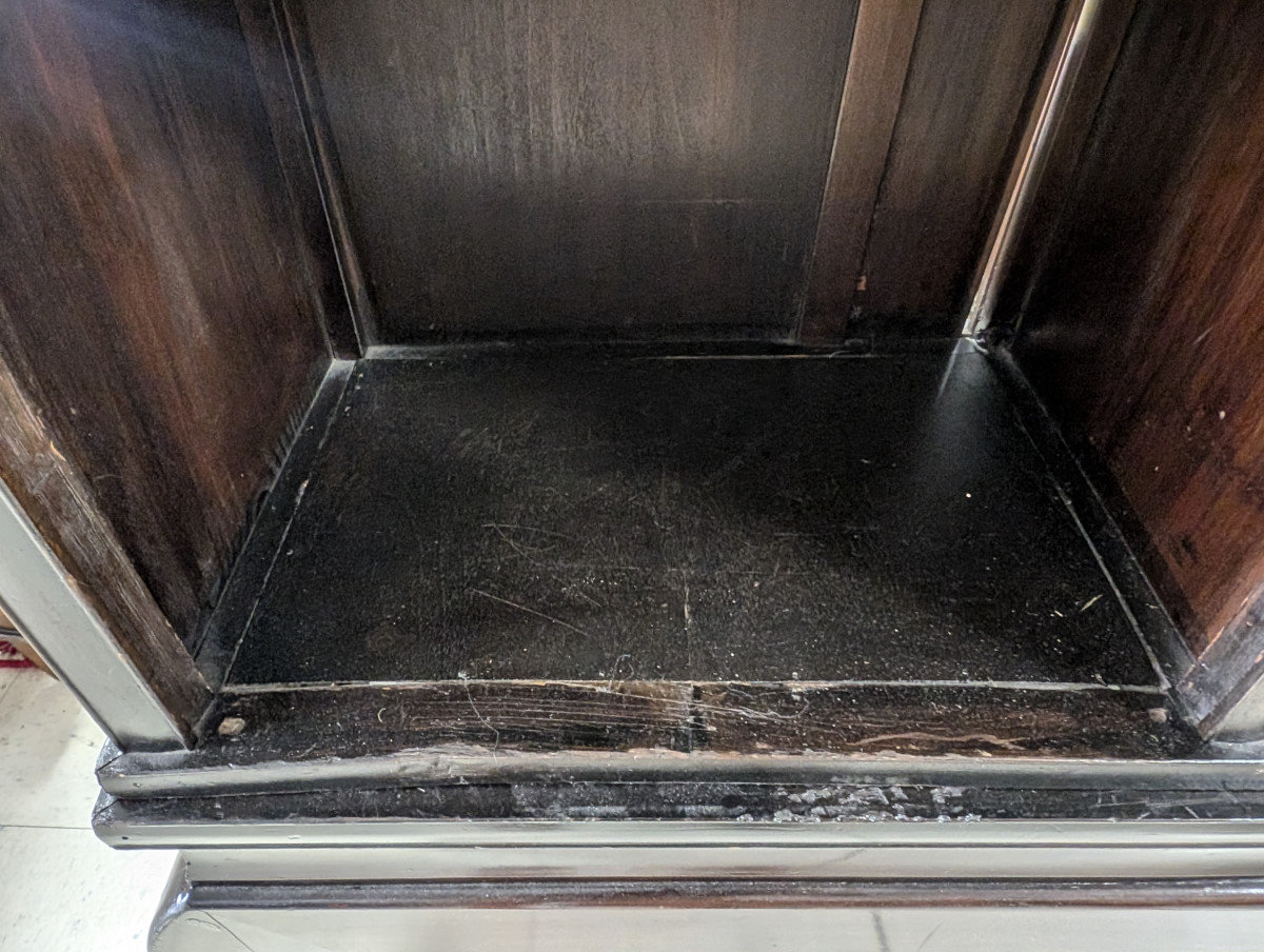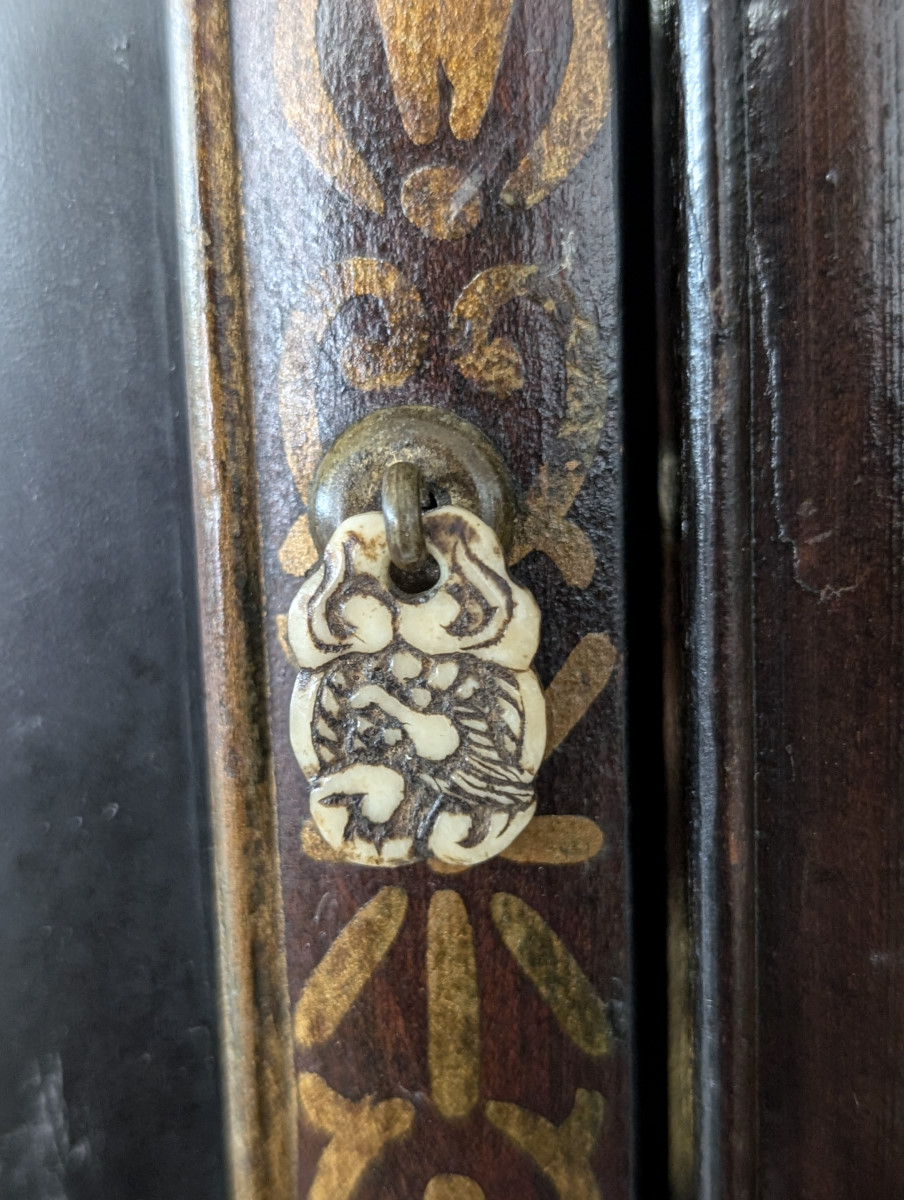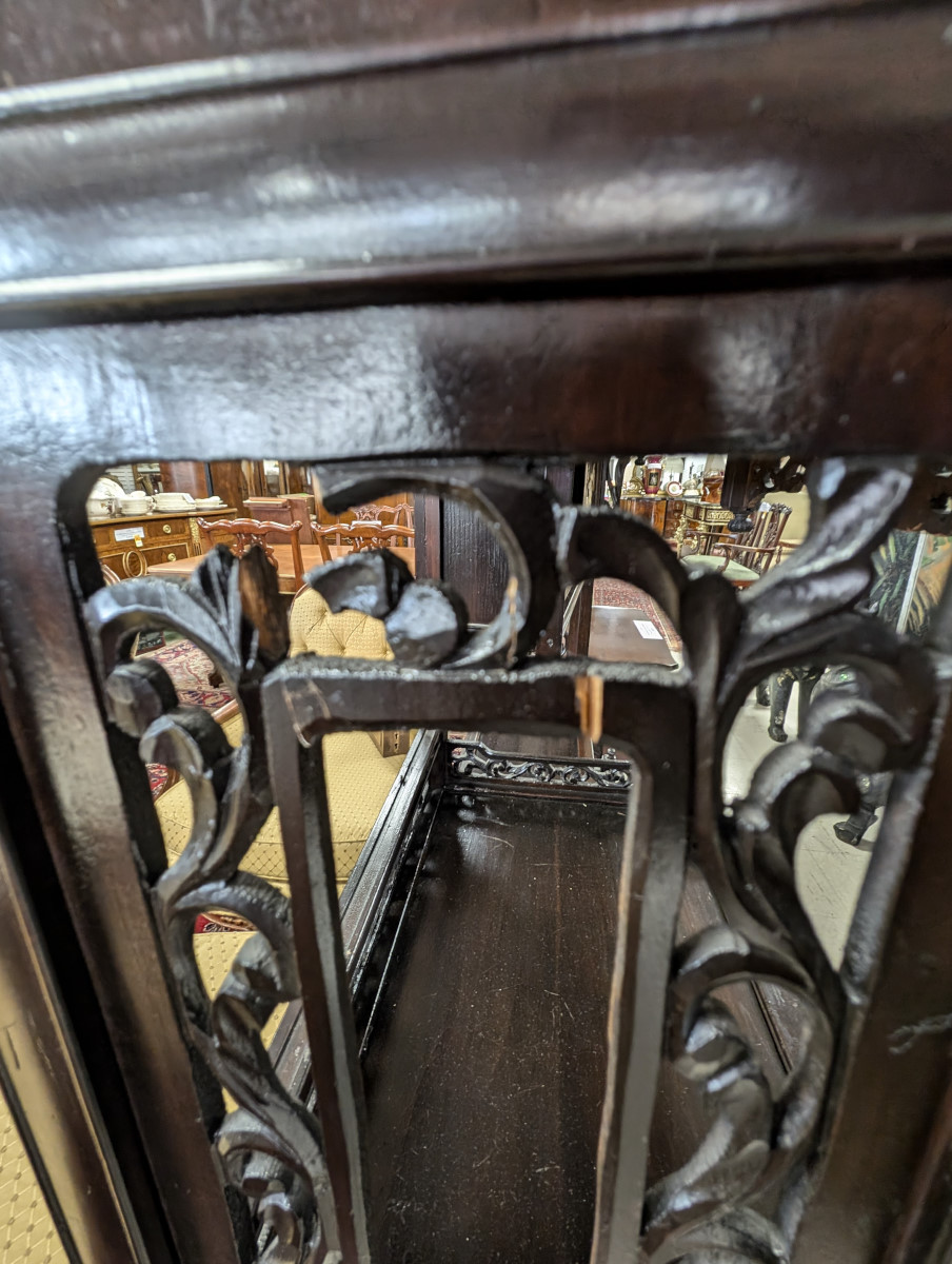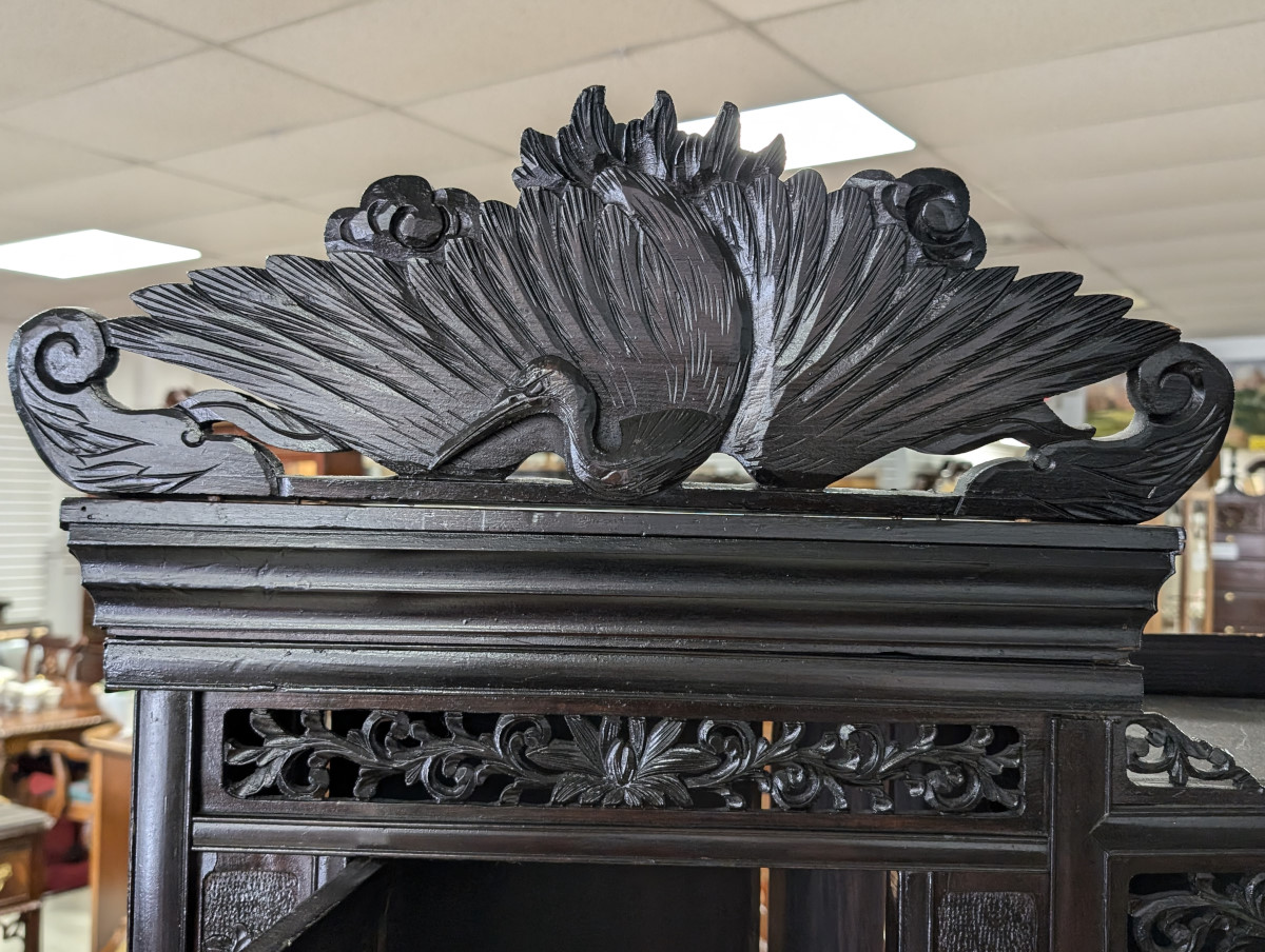 Outstanding Meijing Shibayama cabinet, Hand-carved wood, Sliding doors, Made in Japan, Carved top piece, Carved relief floral, butterfly and bird arrangements on all of the doors, Carvings appear to be bone, A true masterpiece that will become the focal point of any room or could also be mixed in a mid-century modern organic living room or kitchen. Great overall appearance with some age cracks, some missing pieces. See all photos for condition. Measures: 78″H x 43.5″W x 12.5″D.