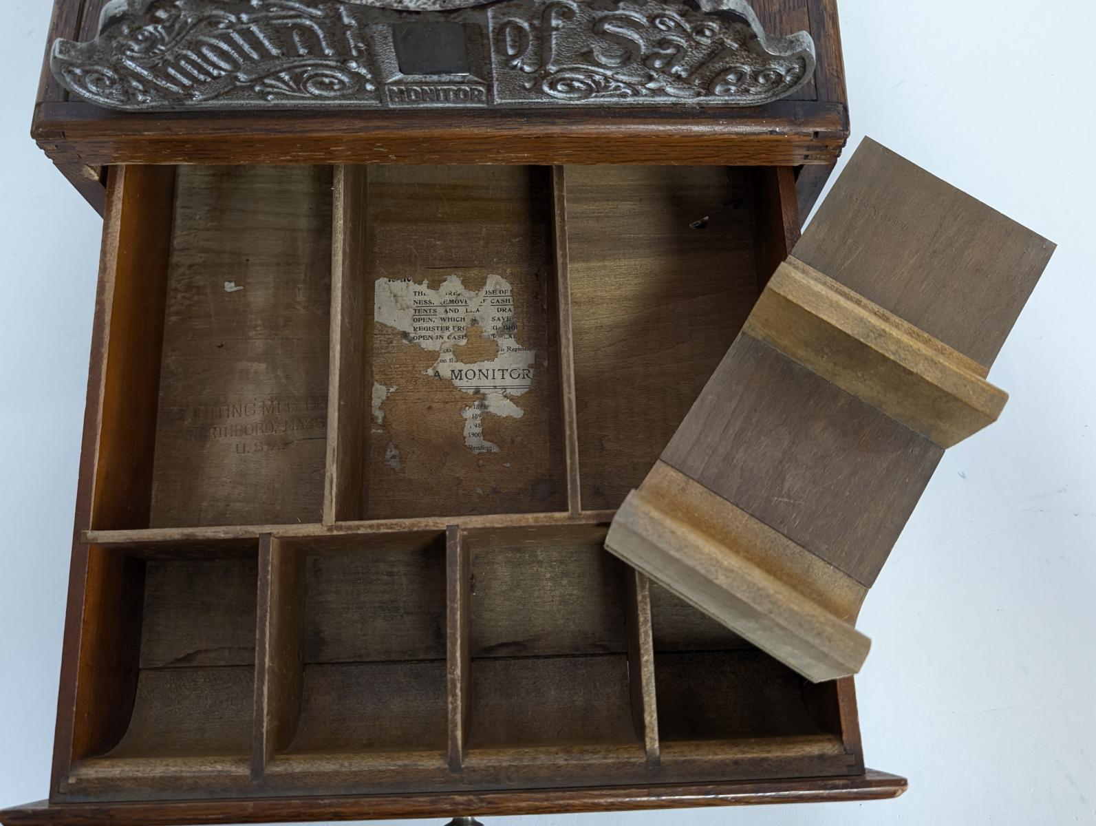Circa 1900’s, By Monitor, Oak, Cash Drawer, Topped with original metal top plate, Drawer has 8 compartments. These were popular in barber shops and other small businesses in the early 1900s. Very good antique condition, See all photos. measures: 8.5″Hx13.25″Wx14″D. Shipping $89 within the US if not picking up. No shipping outside the US.