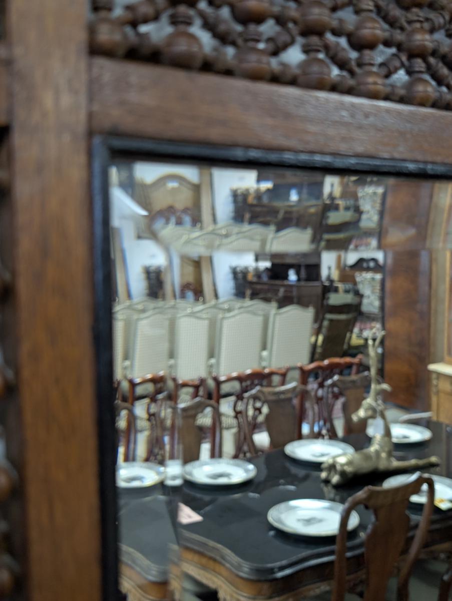 Absolutely stunning, Late 19th Century, Ornate wood frame, Bone inlay, Beveled mirror, Ballustrades. In great condition, minor wear. See all photos for condition. Measures Overall 38″ x 25″.