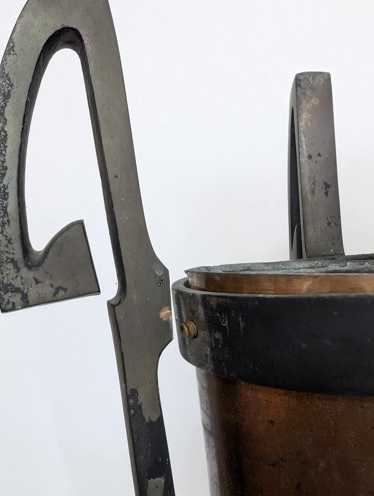 Very cool, Sold as a pair, Bronze stands, Copper vases, Art Deco, great use with floral arrangement in each. Good condition, one loose arm, one has a dent in the stand, expected age wear and patina from being outside. Measures: 36.5″H x 10.5″D.