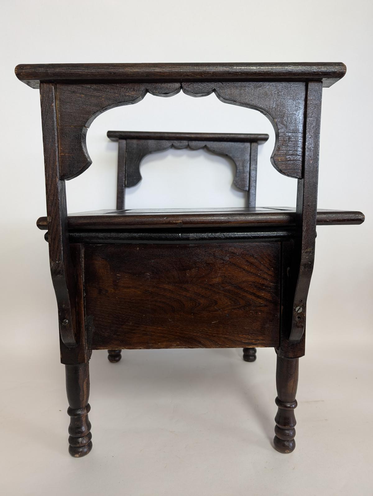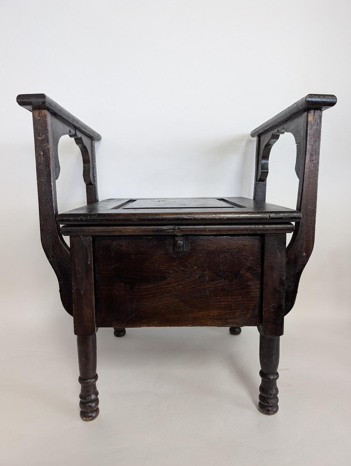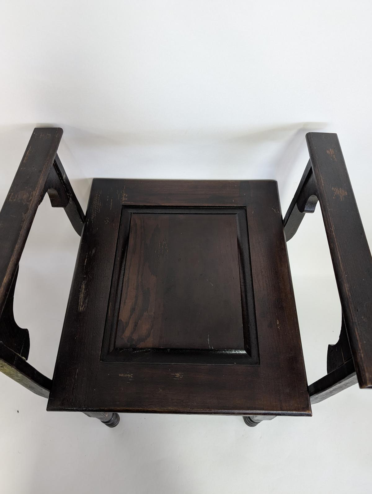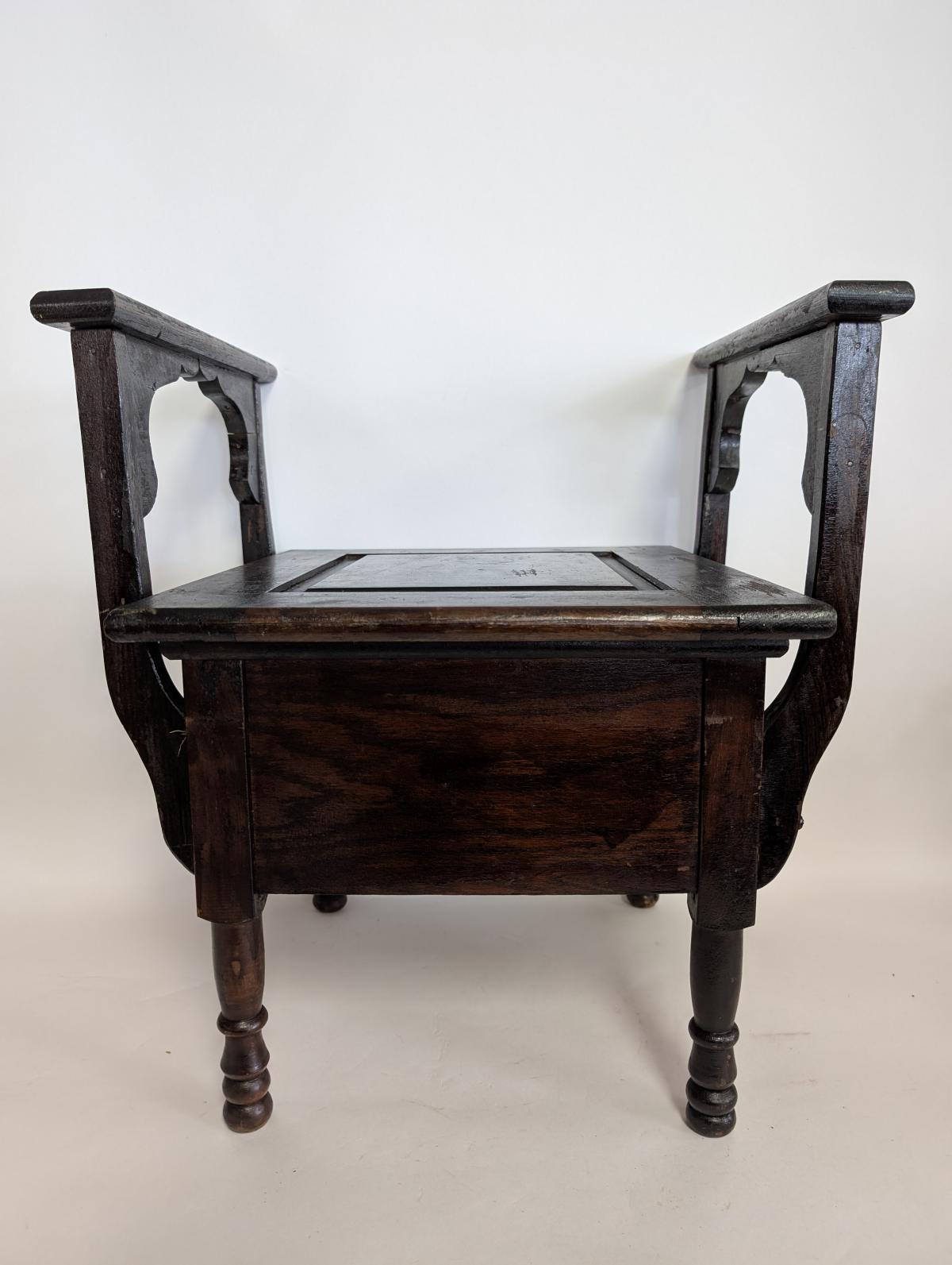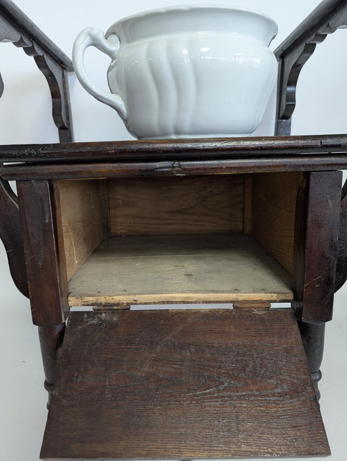 Antique, Primitive, Chamber seat, Commode, Wood, Arms on either side, Seat lid lifts up to access pot, Front of seat opens to remove pot, Comes with porcelain pot. In good, antique condition, expected age wear, some scratches and wear. See all photos for condition. Measures: 23.25″H x 21″W x 19″D.
