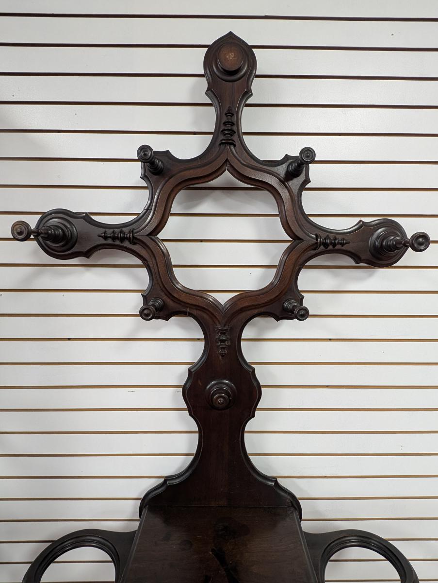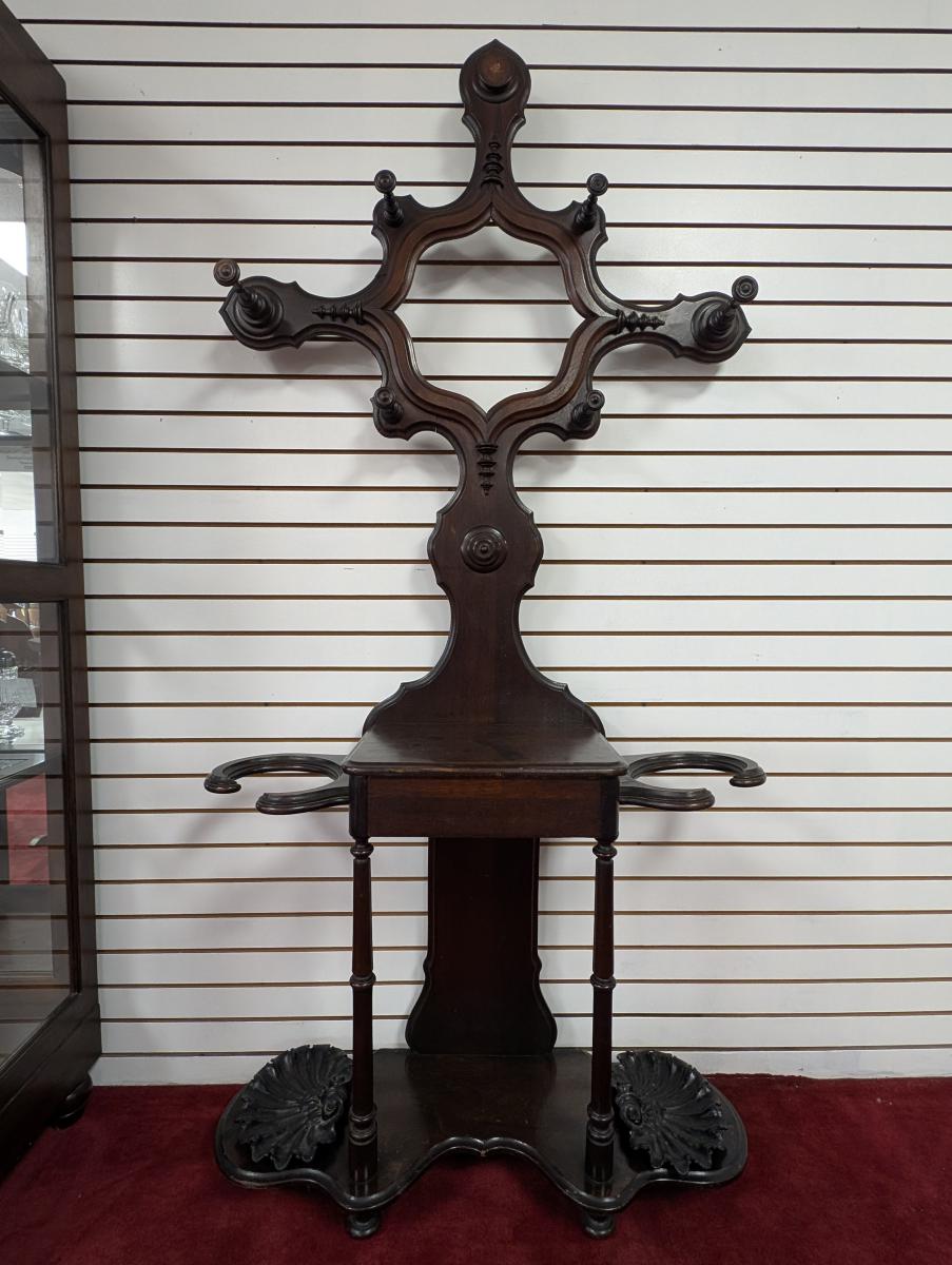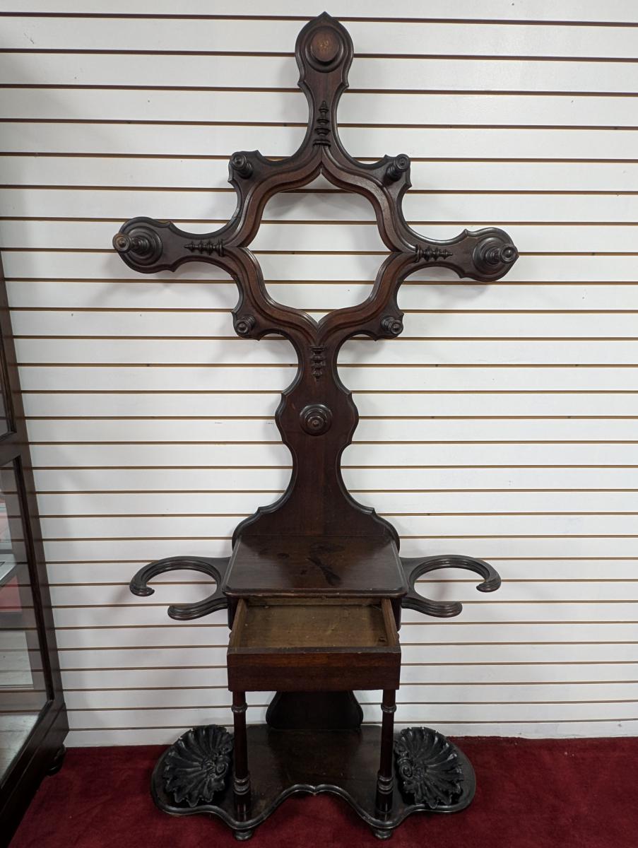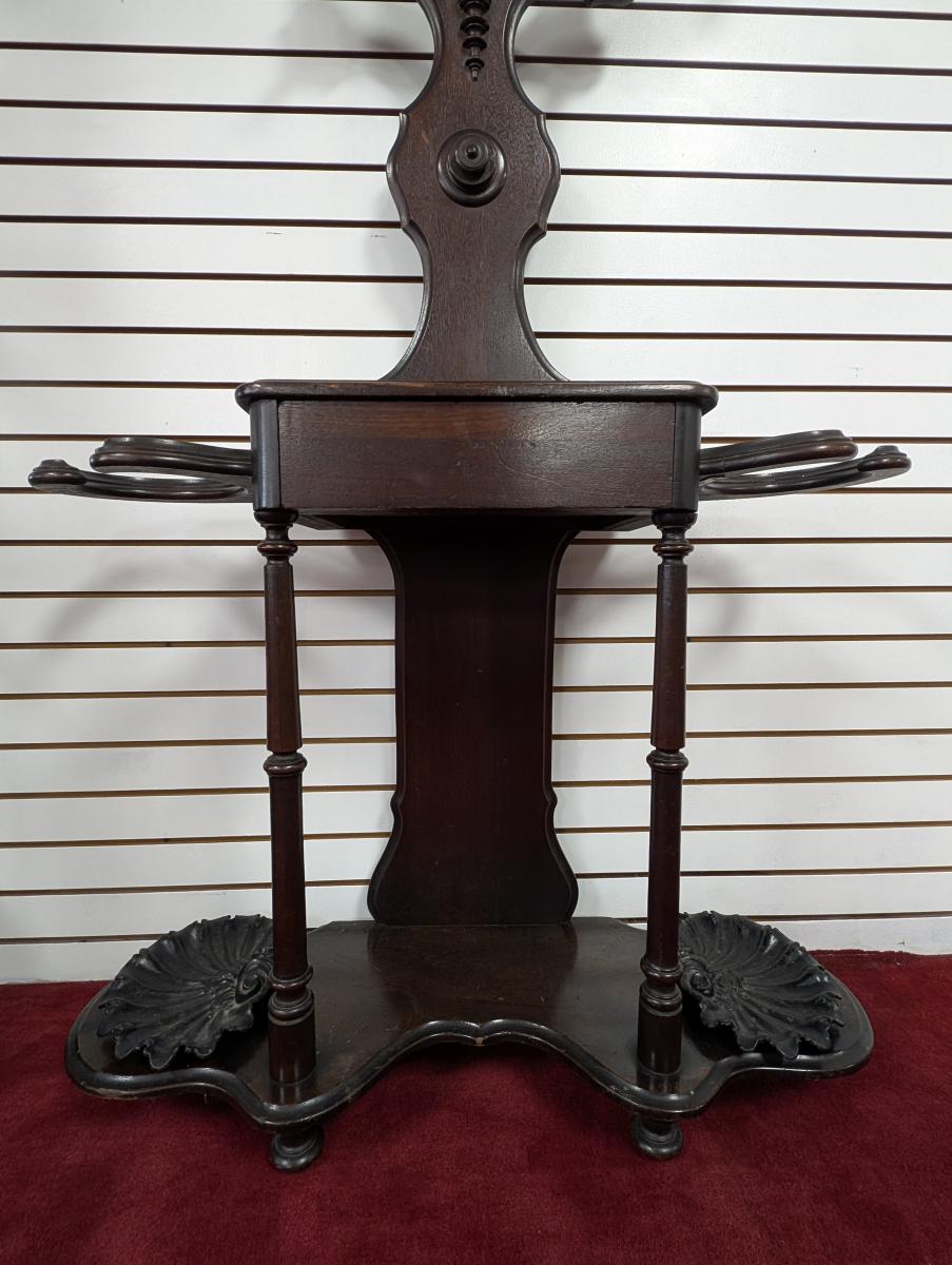 Early 19th Century, Solid Walnut, Victorian, Top has a 4 point design, 6 Wooden extended pieces for hanging items, Small dovetailed underneath flat surface, Umbrella stands on either side, Heavy, shell shaped cast iron drip pans. Overall good condition, expected age wear, Missing medallion on very top point, mirror missing in center, some wear and scratches. See all photos. Measures: 83″H x 40.5″W x 14″D.