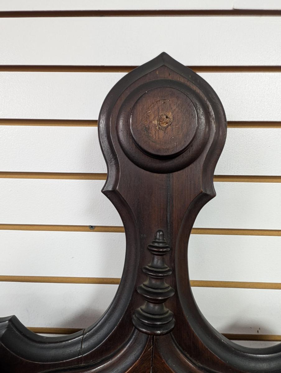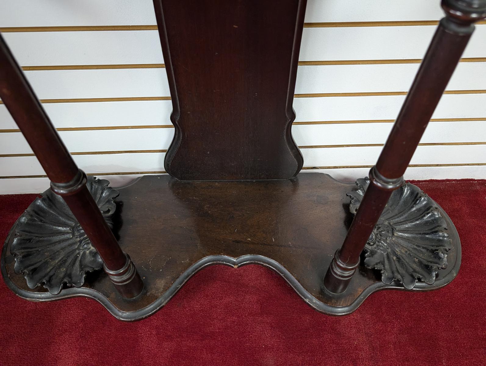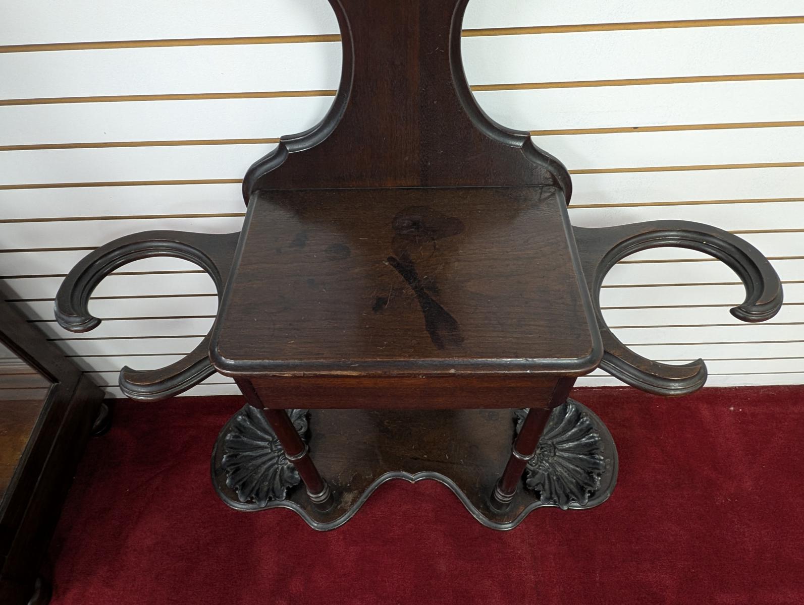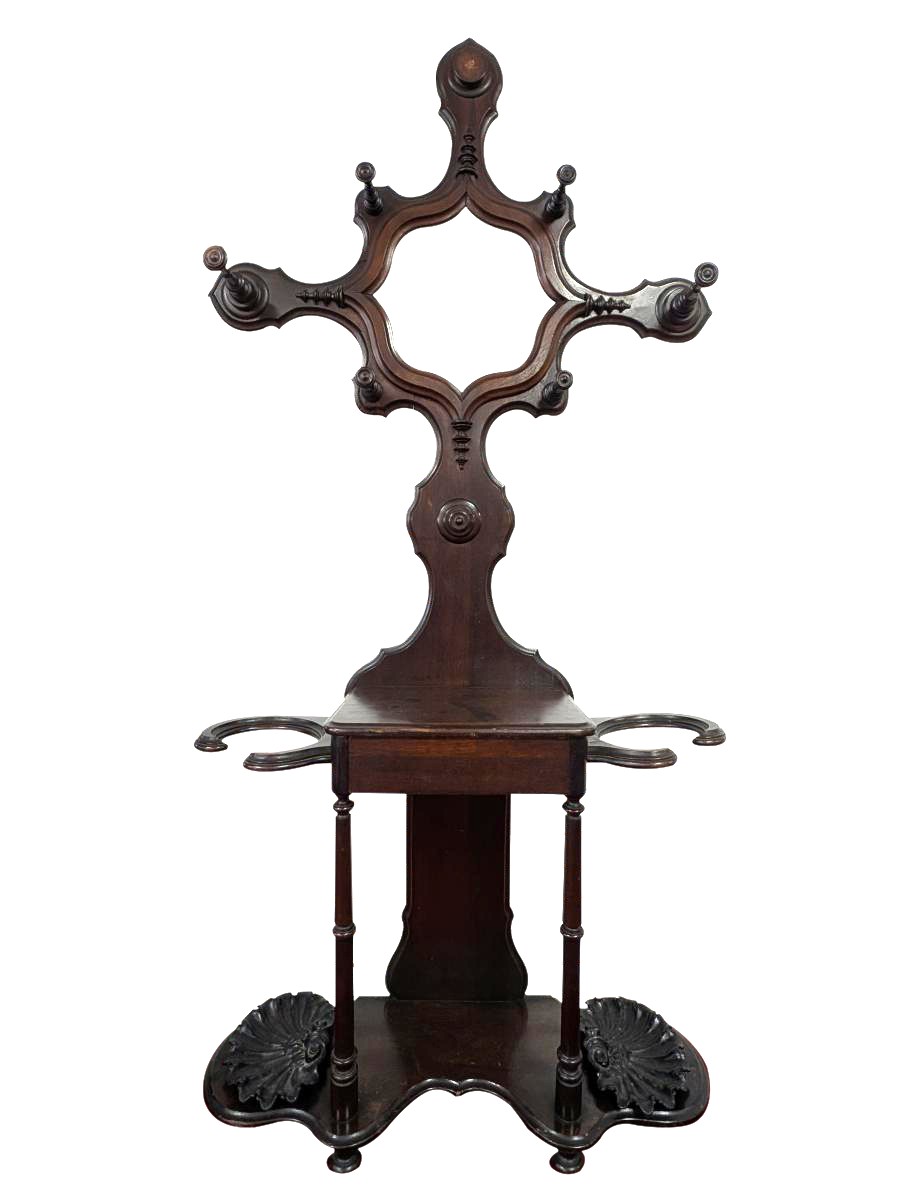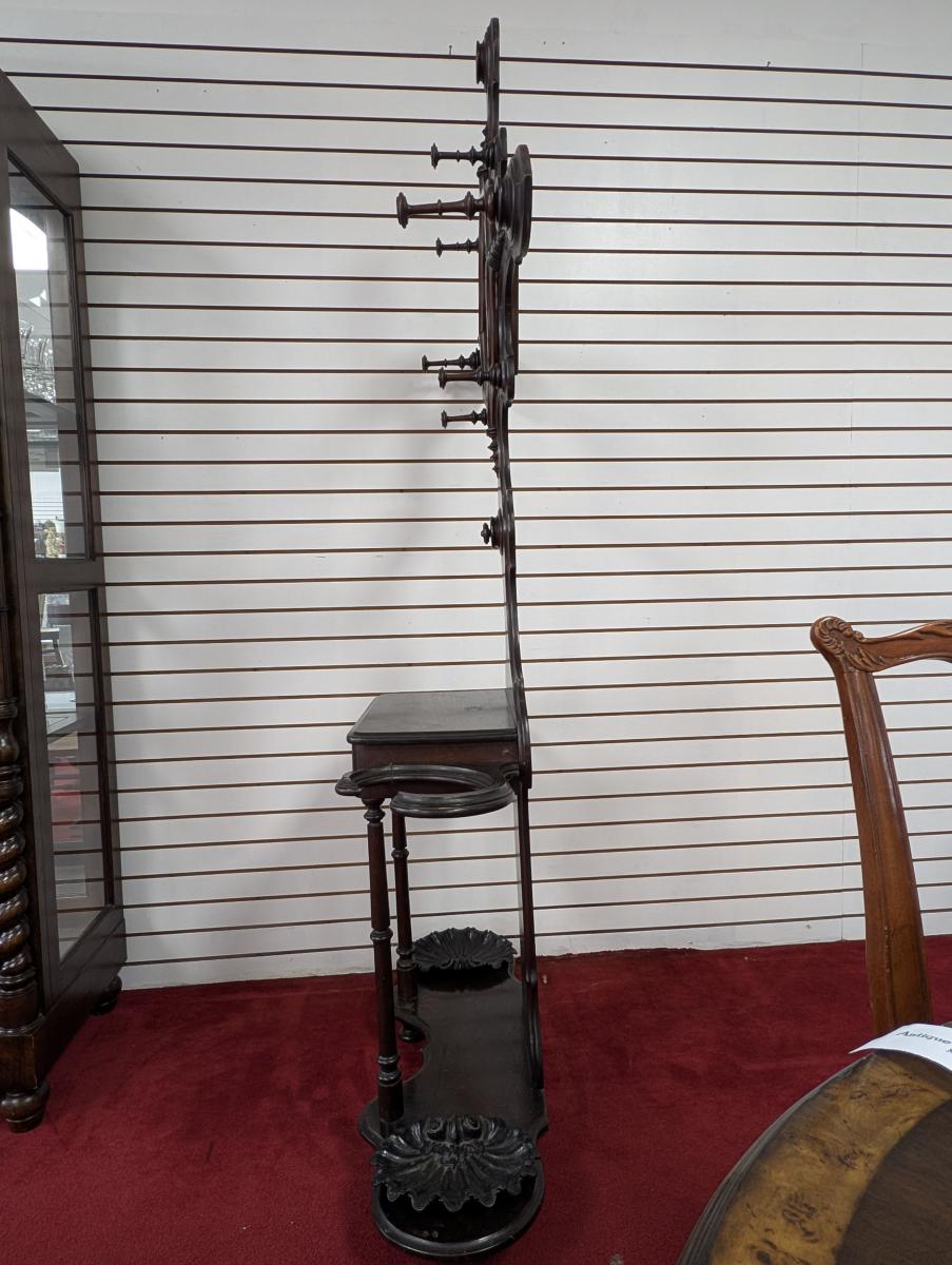 Early 19th Century, Solid Walnut, Victorian, Top has a 4 point design, 6 Wooden extended pieces for hanging items, Small dovetailed underneath flat surface, Umbrella stands on either side, Heavy, shell shaped cast iron drip pans. Overall good condition, expected age wear, Missing medallion on very top point, mirror missing in center, some wear and scratches. See all photos. Measures: 83″H x 40.5″W x 14″D.