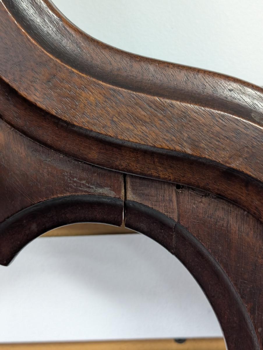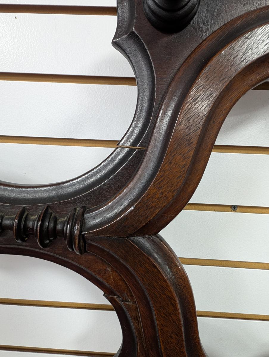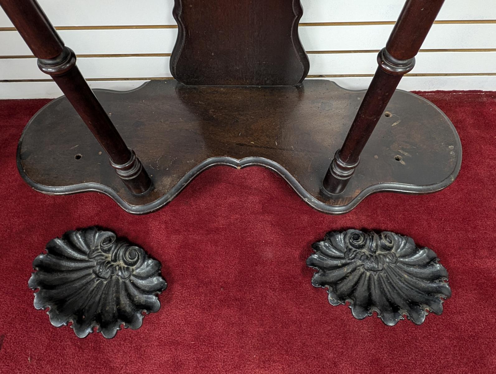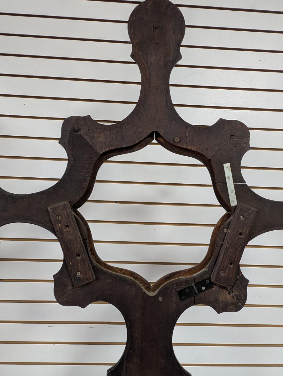 Early 19th Century, Solid Walnut, Victorian, Top has a 4 point design, 6 Wooden extended pieces for hanging items, Small dovetailed underneath flat surface, Umbrella stands on either side, Heavy, shell shaped cast iron drip pans. Overall good condition, expected age wear, Missing medallion on very top point, mirror missing in center, some wear and scratches. See all photos. Measures: 83″H x 40.5″W x 14″D.