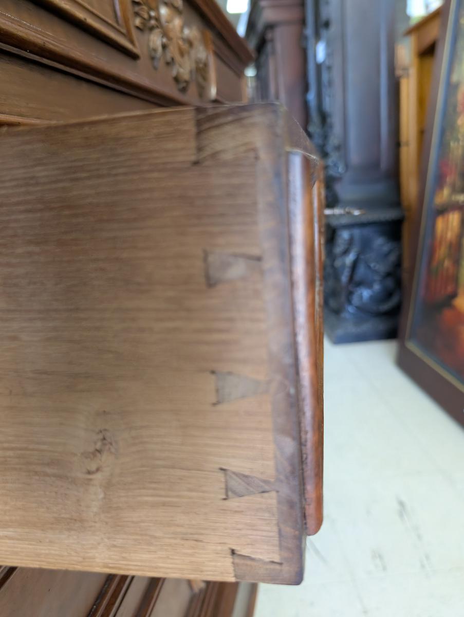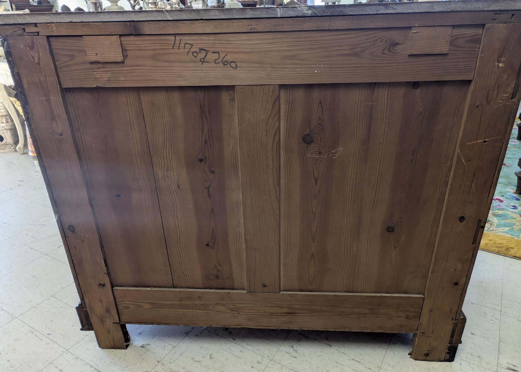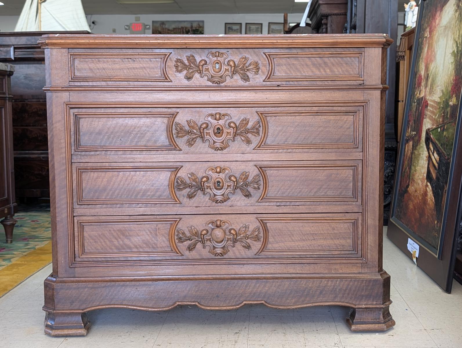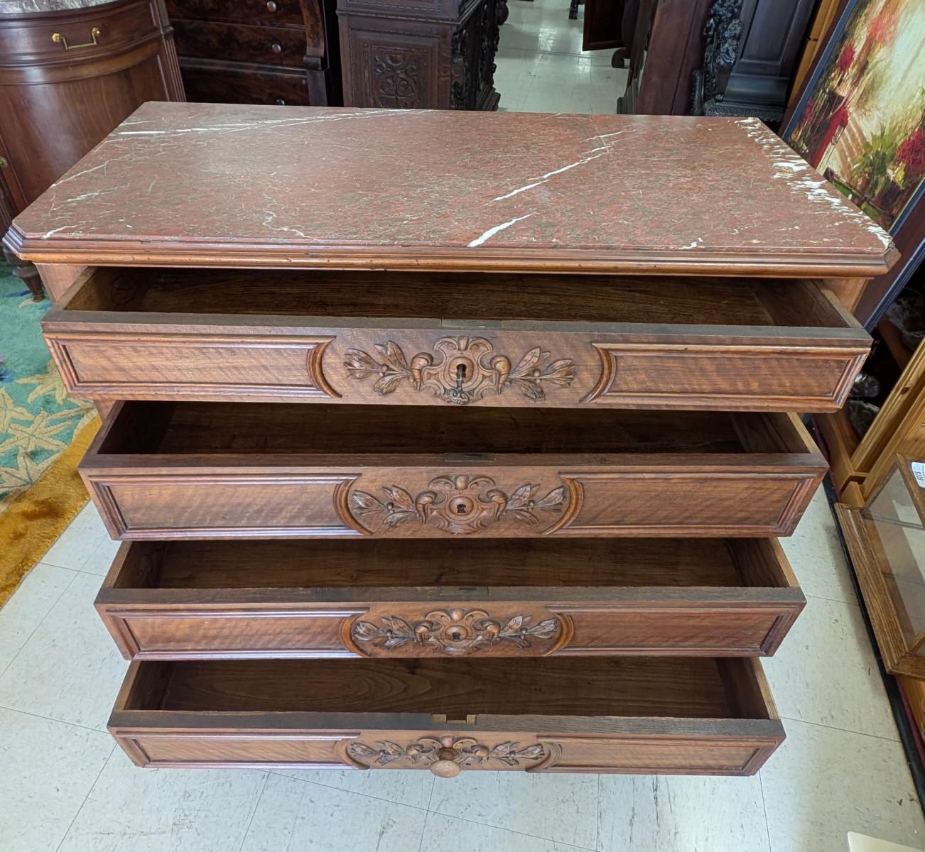Antique, Circa 1870’s, Marble Top, Walnut, 4 Dovetailed drawers, Raised design on front center of each drawer, Rest on bracket feet. Overall good, sturdy condition, expected age wear, the feet show quite a bit of wear and use. See all photos for condition. Measures: 40″H x 48″W x 21.5″D.