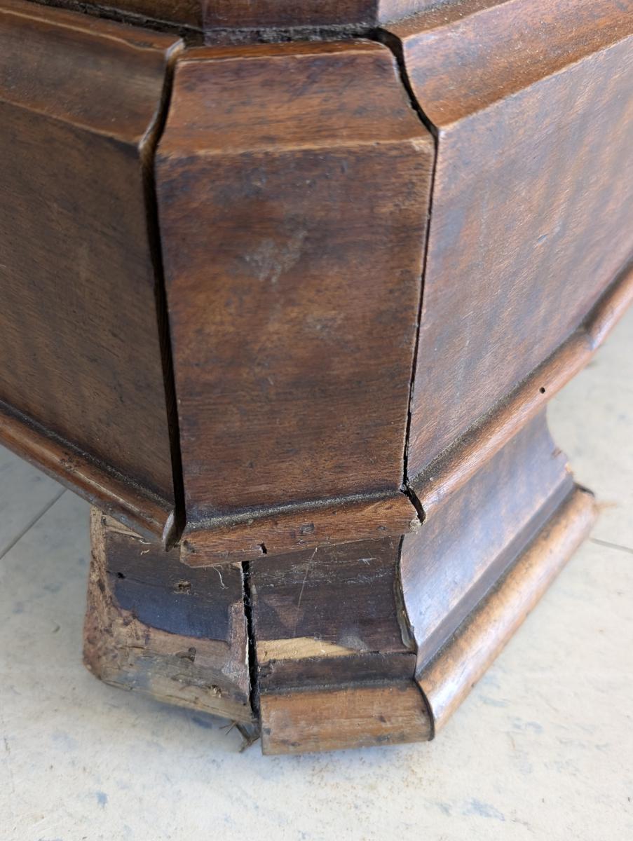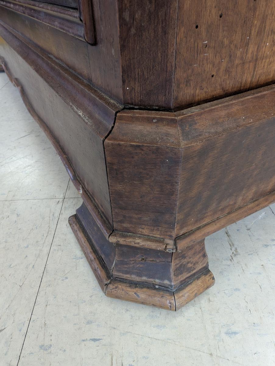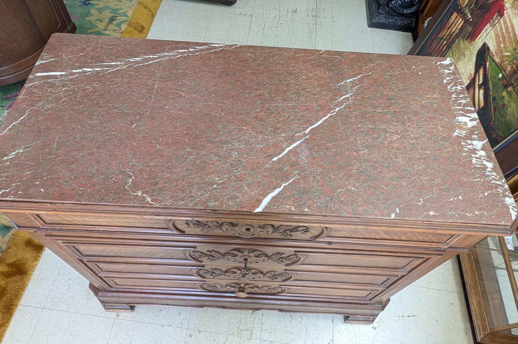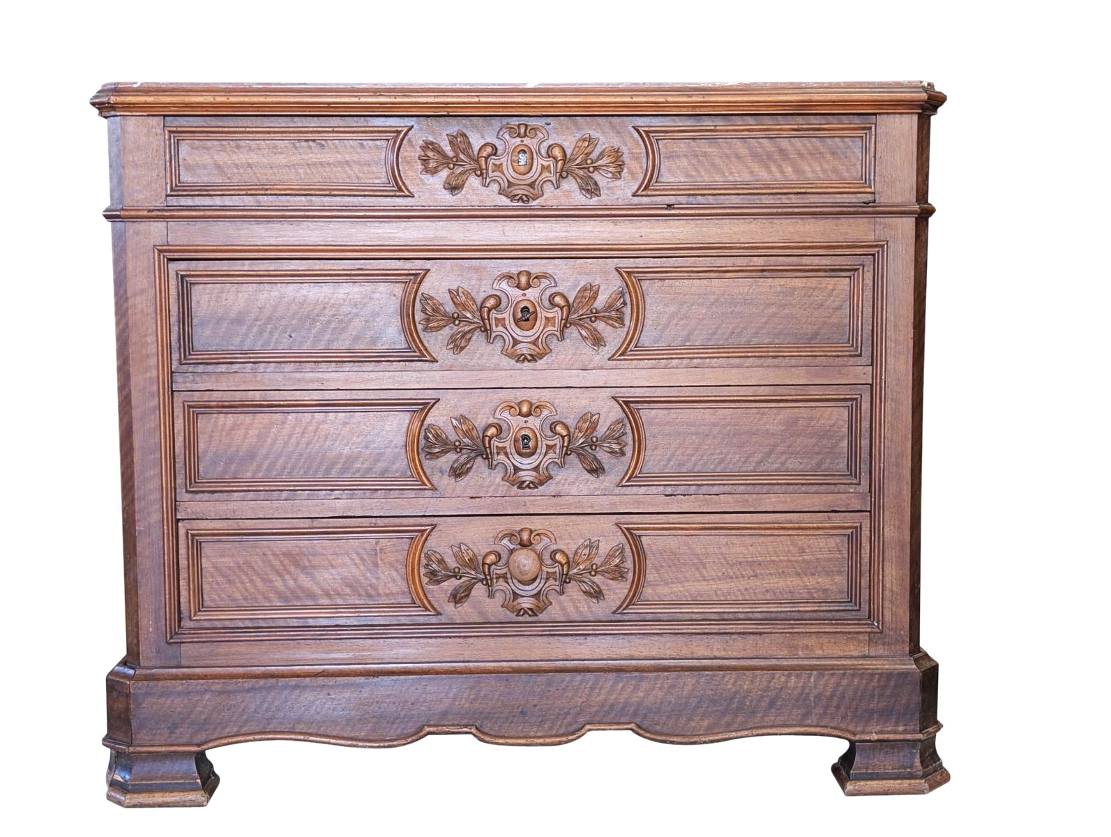 Antique, Circa 1870’s, Marble Top, Walnut, 4 Dovetailed drawers, Raised design on front center of each drawer, Rest on bracket feet. Overall good, sturdy condition, expected age wear, the feet show quite a bit of wear and use. See all photos for condition. Measures: 40″H x 48″W x 21.5″D.