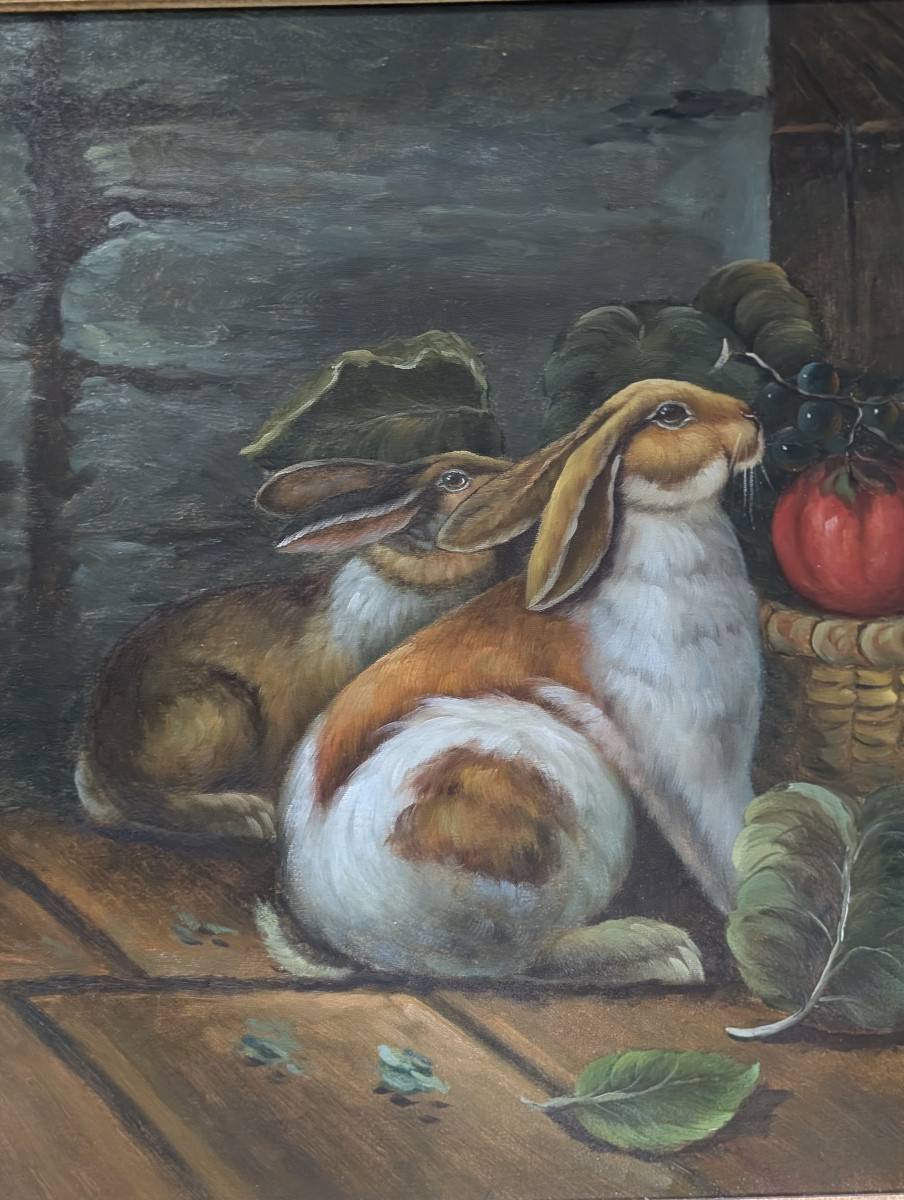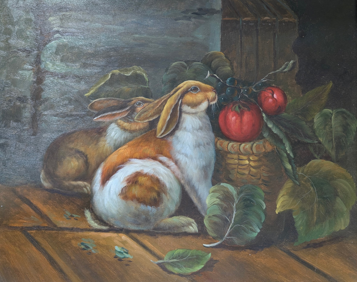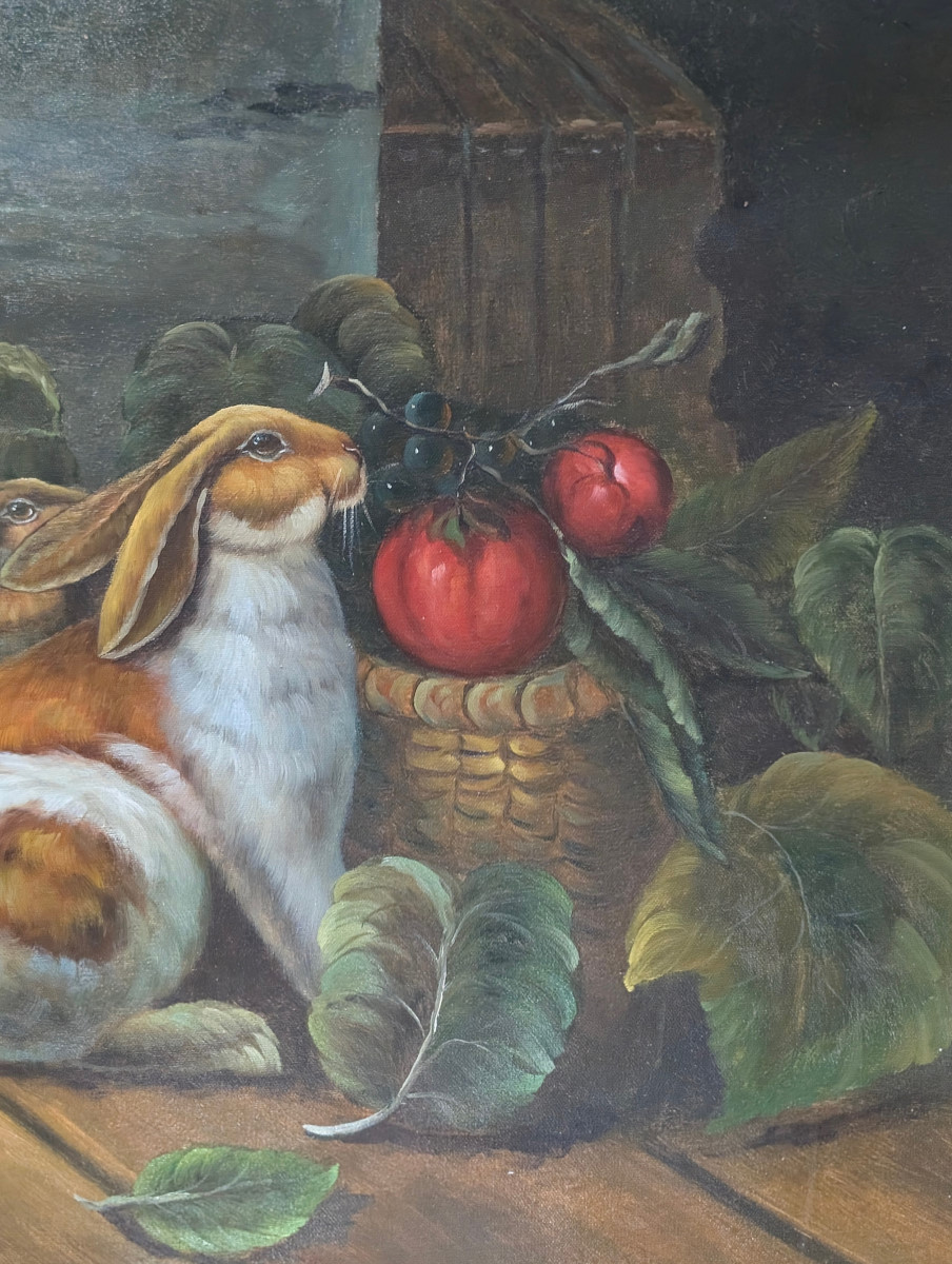 Bunnies Painting, Unsigned Oil On Canvas, 20 x 24.25