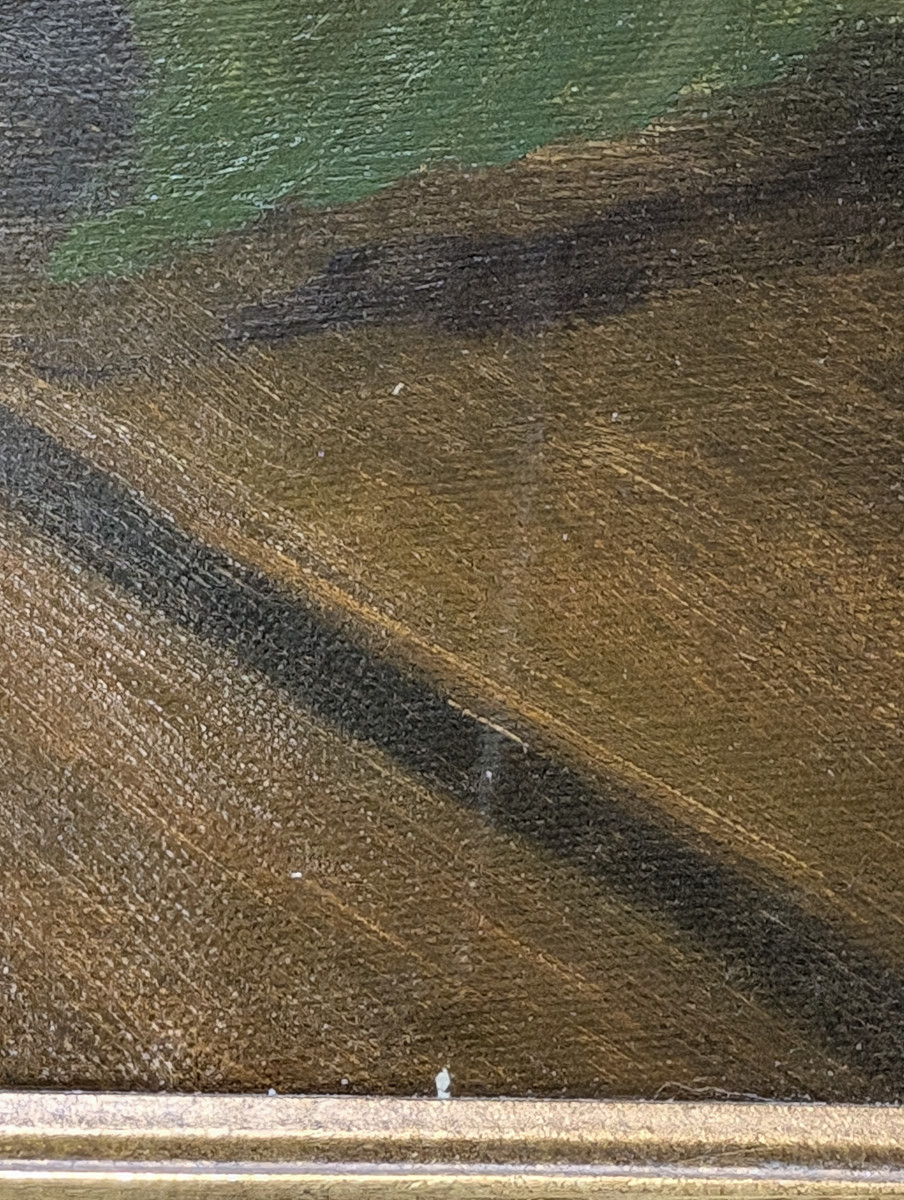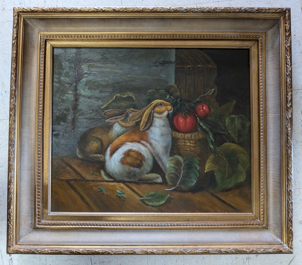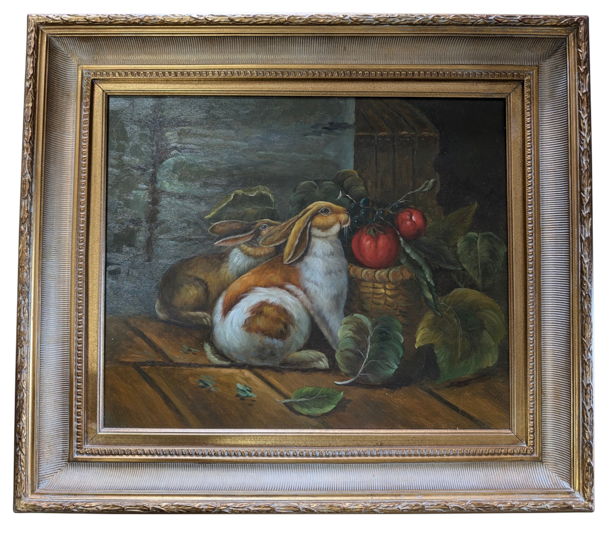 Bunnies Painting, Unsigned Oil On Canvas, 20 x 24.25