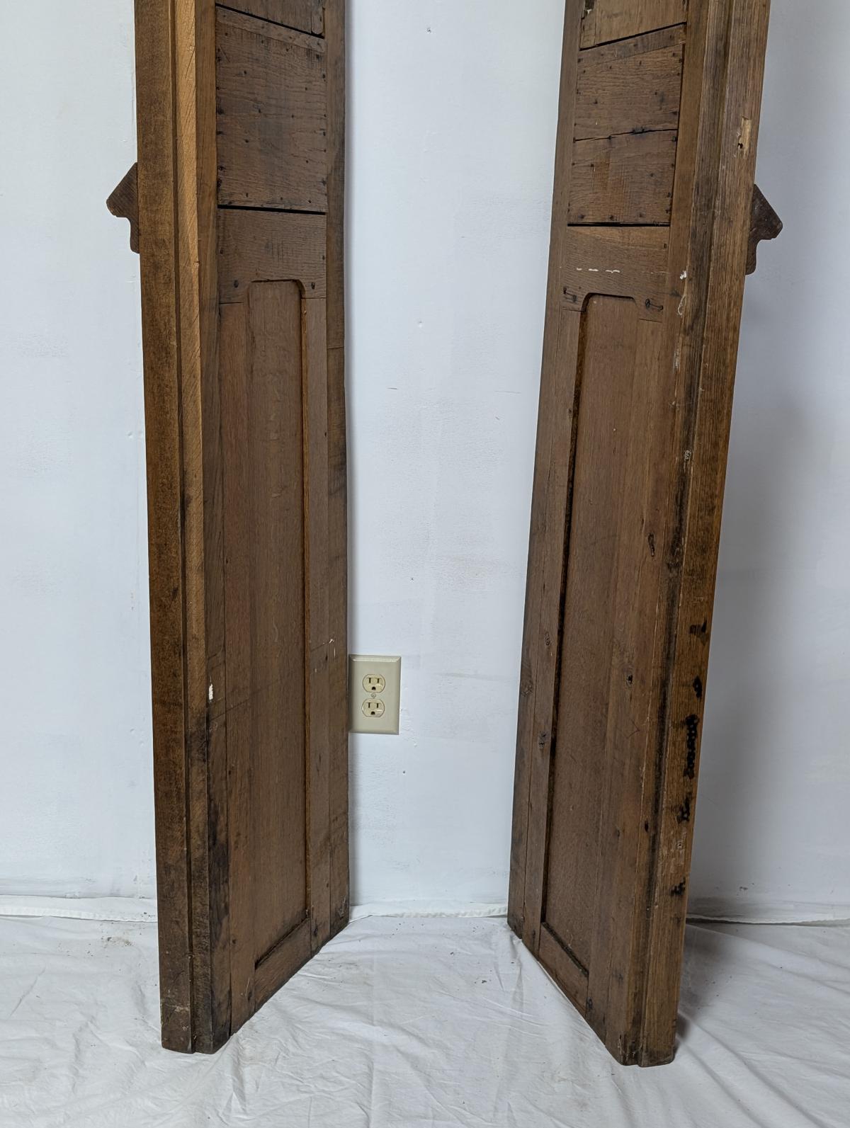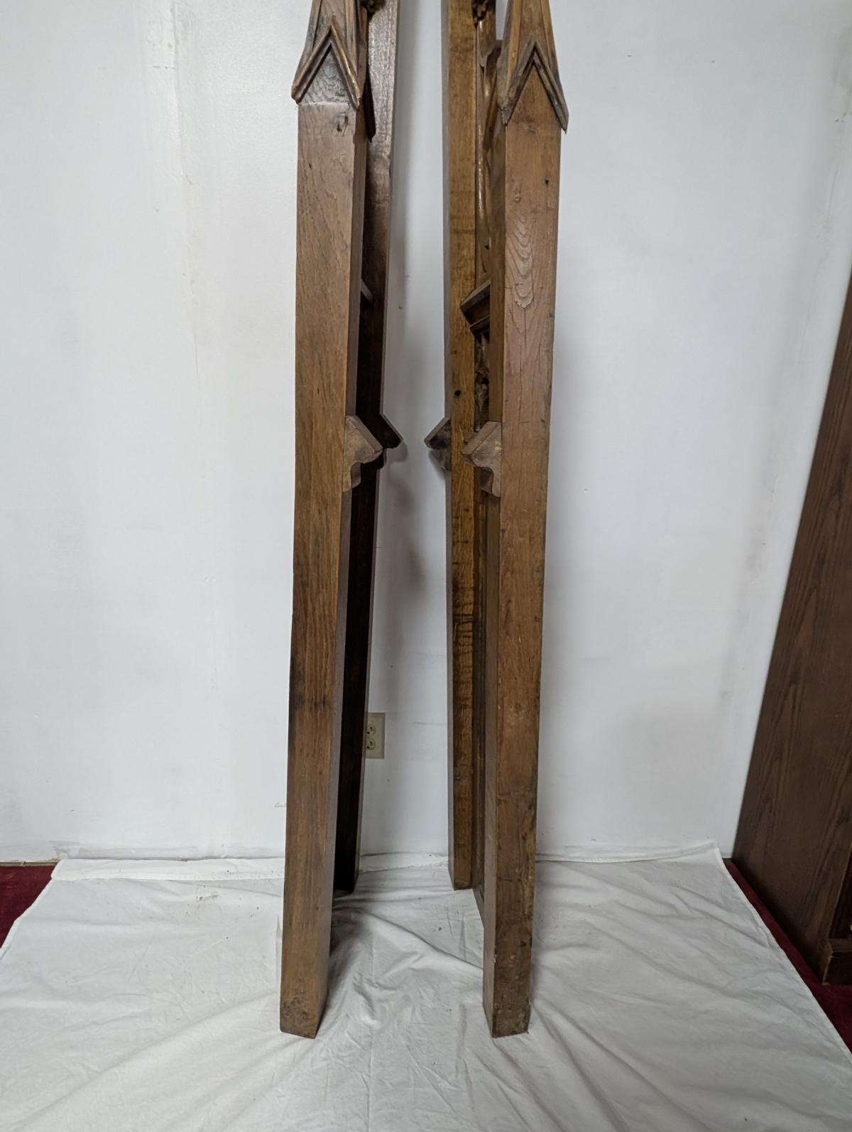 Gorgeous pieces! Set of 2, Gothic Revival, Architectural Salvage pieces, Possibly from a church, Solid Oak, These pieces can be used for so many things. Overall great condition, some cracks, chips and wear due to age and handling. Measures: 109″H x 16″W x 4.5″D. We have other available pairs similiar to these, see last photos.