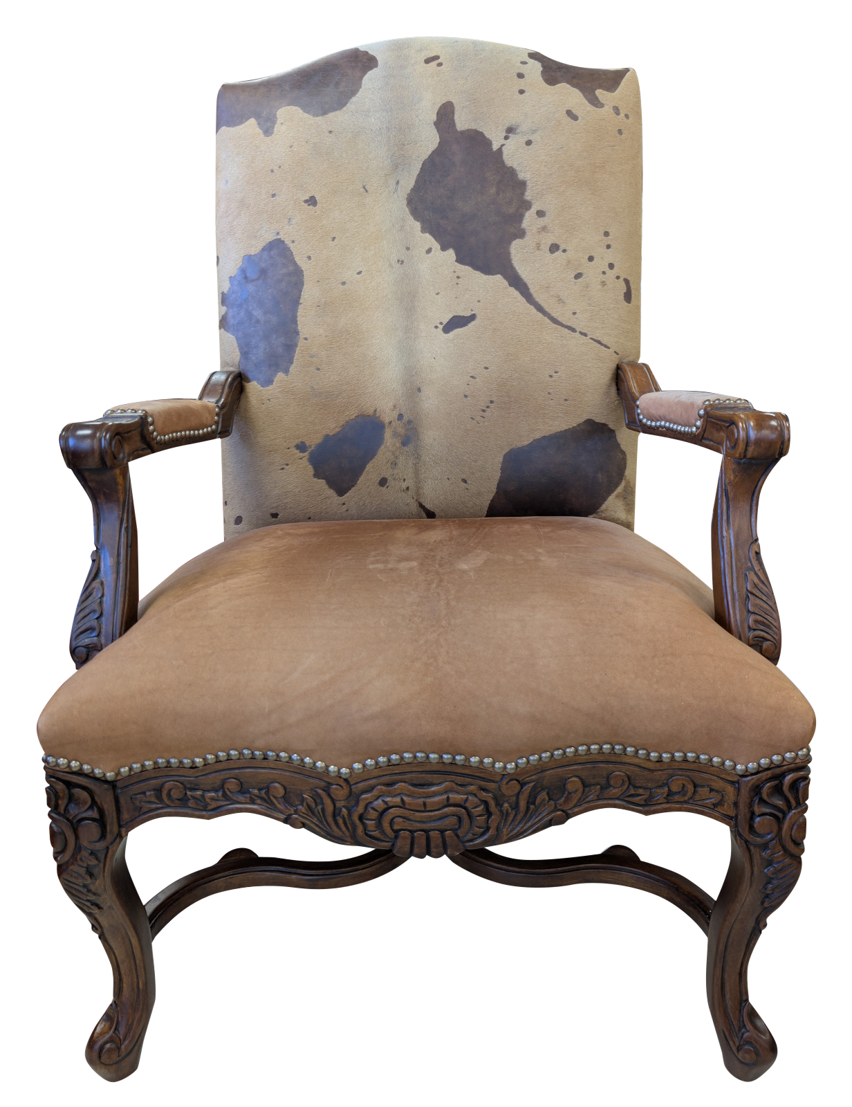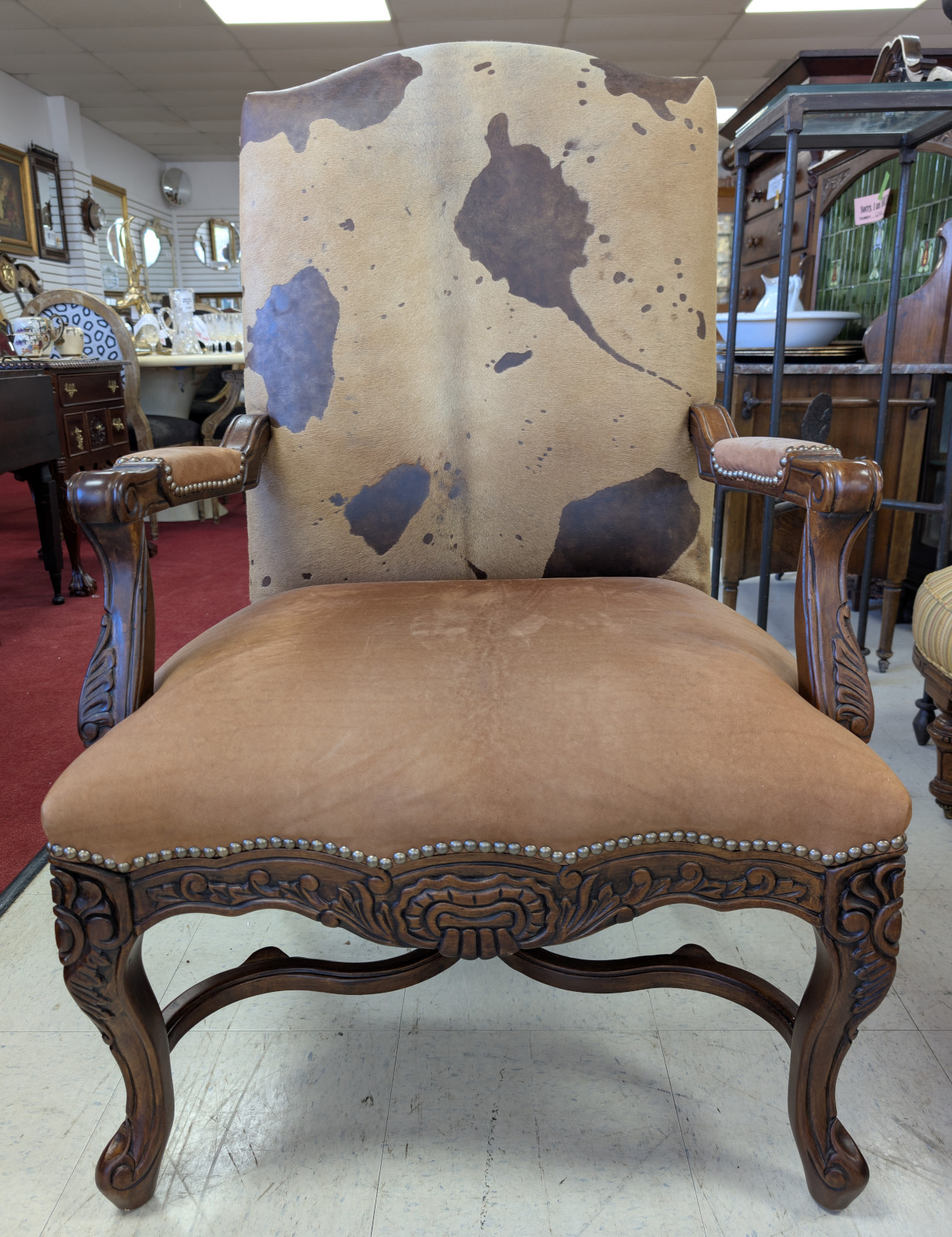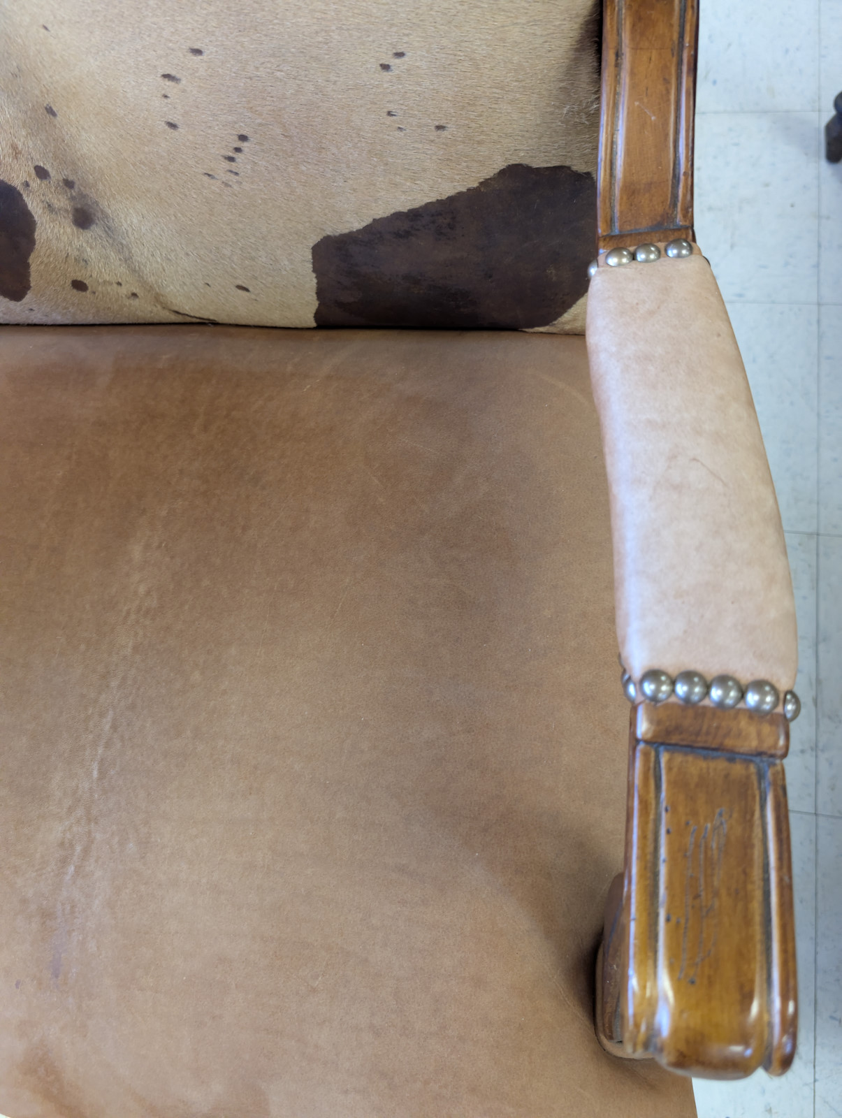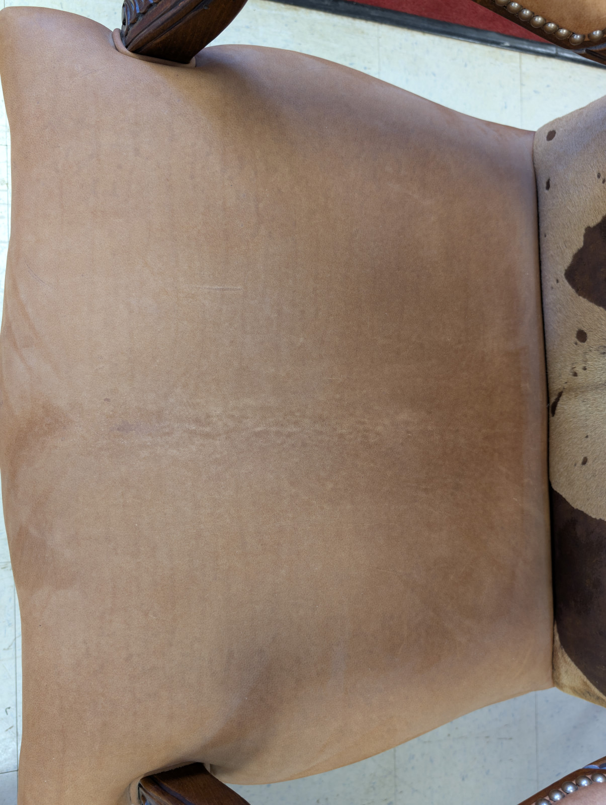 The upholstery is where this piece truly distinguishes itself: a luxurious combination of smooth, supple leather seat and armrests paired with a dramatic natural cowhide backrest. The organic patterning of the hide creates a one-of-a-kind visual statement, making each chair entirely unique. Finished with nailhead trim detailing, the chair offers both tactile richness and refined structure.