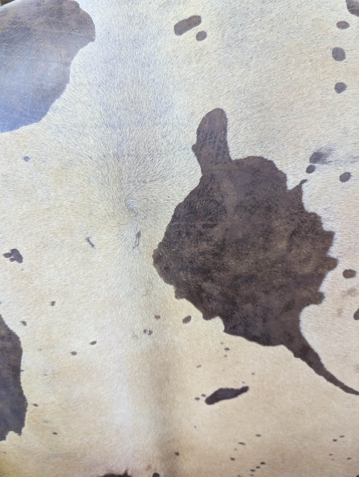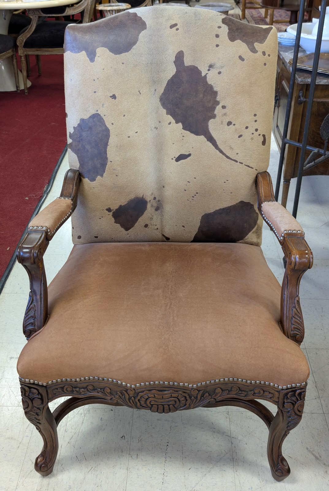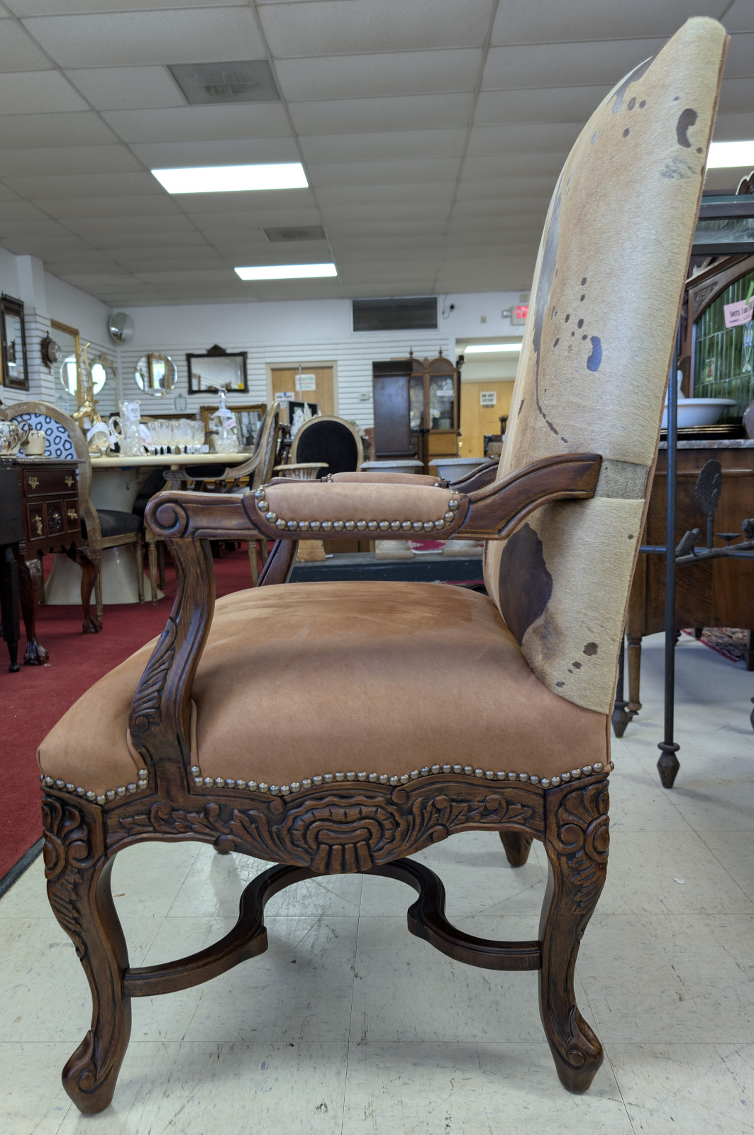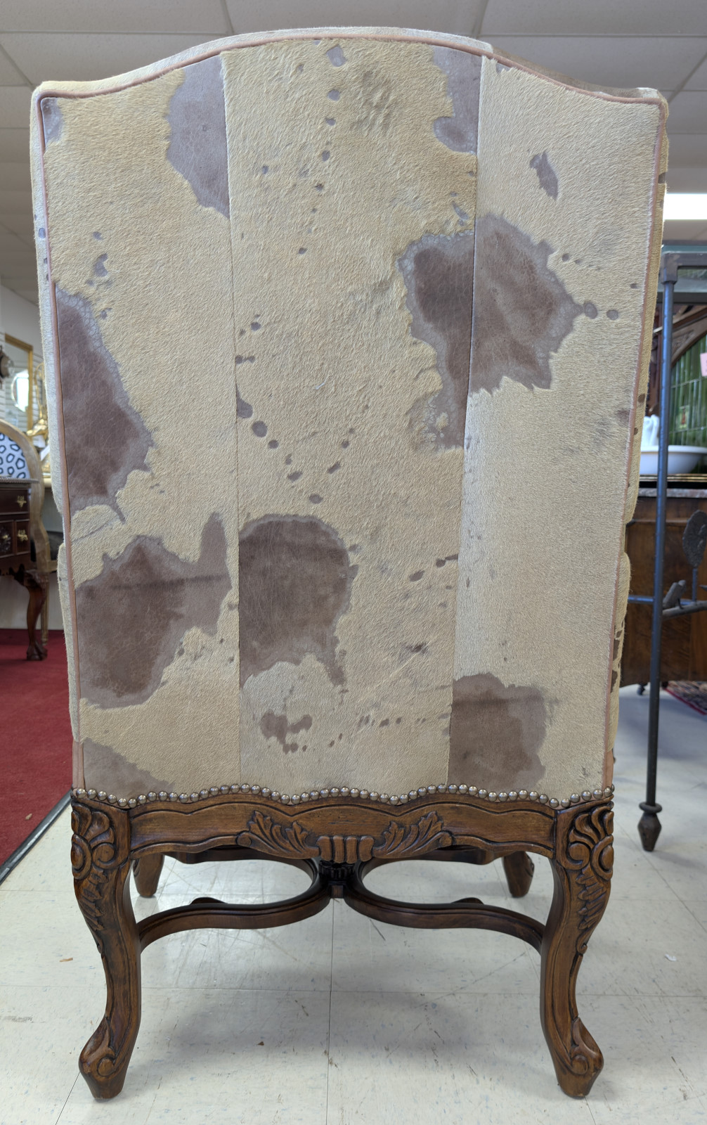 The upholstery is where this piece truly distinguishes itself: a luxurious combination of smooth, supple leather seat and armrests paired with a dramatic natural cowhide backrest. The organic patterning of the hide creates a one-of-a-kind visual statement, making each chair entirely unique. Finished with nailhead trim detailing, the chair offers both tactile richness and refined structure.