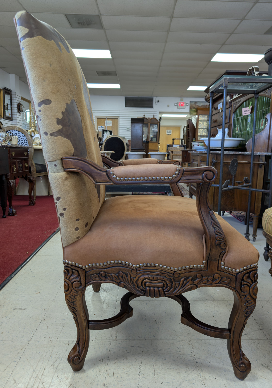 A striking and sophisticated accent chair by Fairfield, masterfully blending classic craftsmanship with bold, Western-inspired design. The finely carved hardwood frame features elegant scrolling arms, acanthus and foliate motifs, and a shaped apron, all resting on graceful cabriole legs joined by a shaped stretcher—hallmarks of traditional European influence reinterpreted for modern interiors.