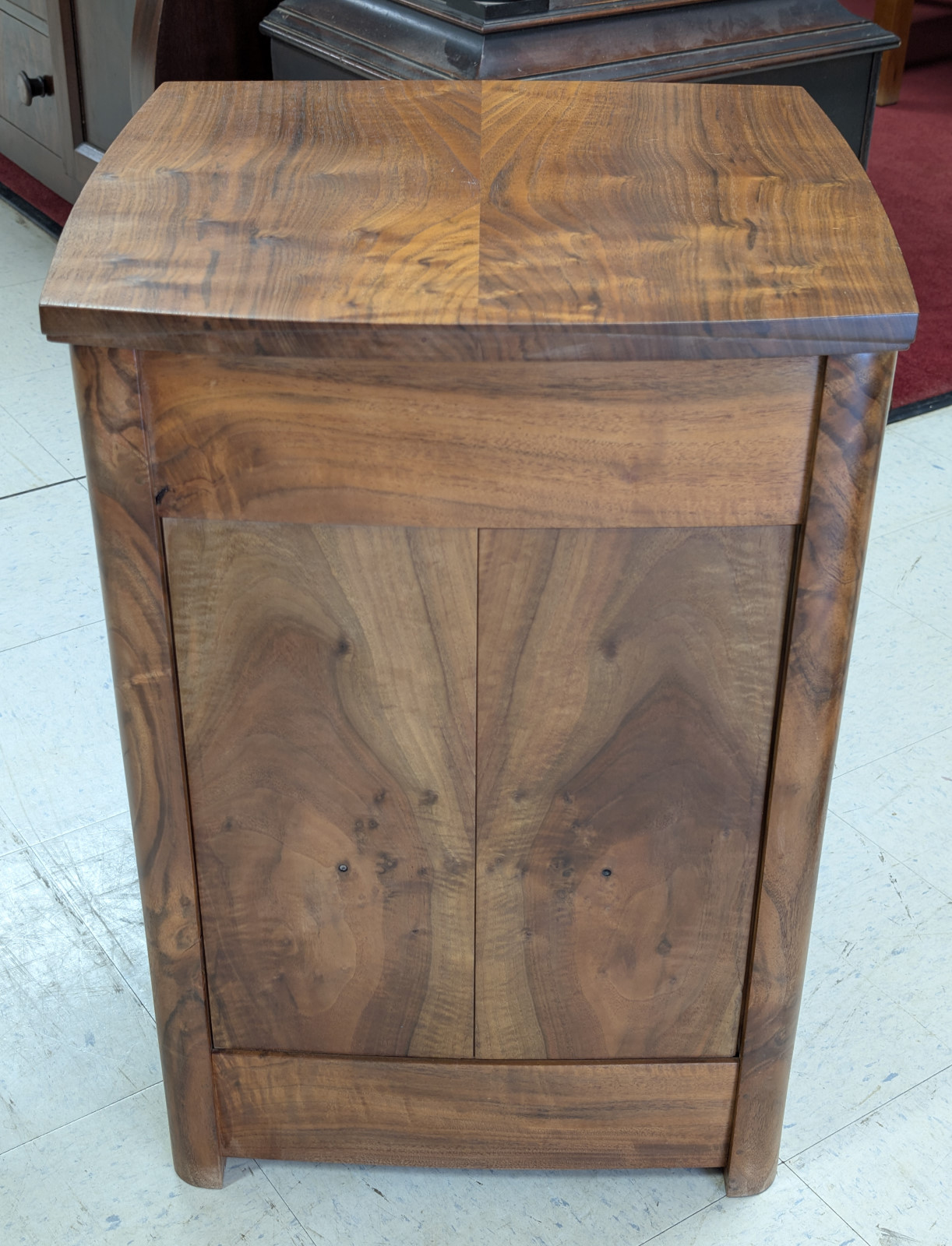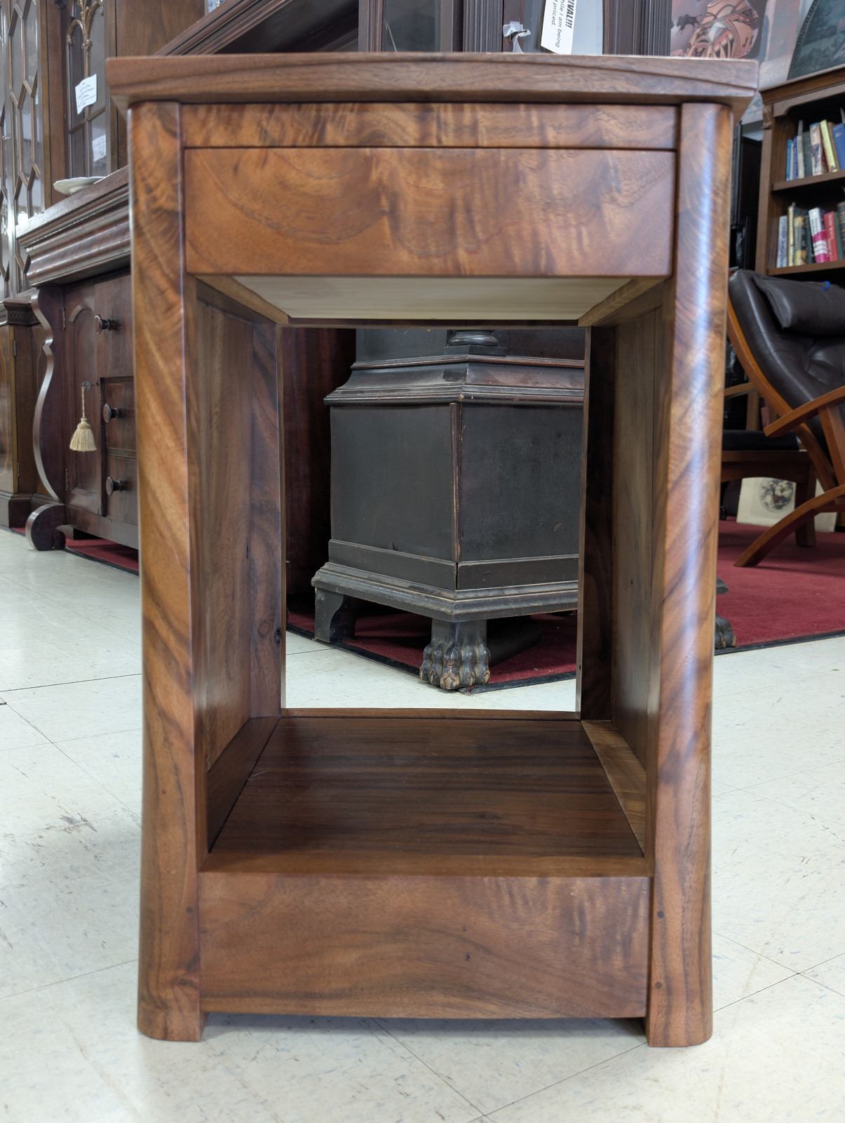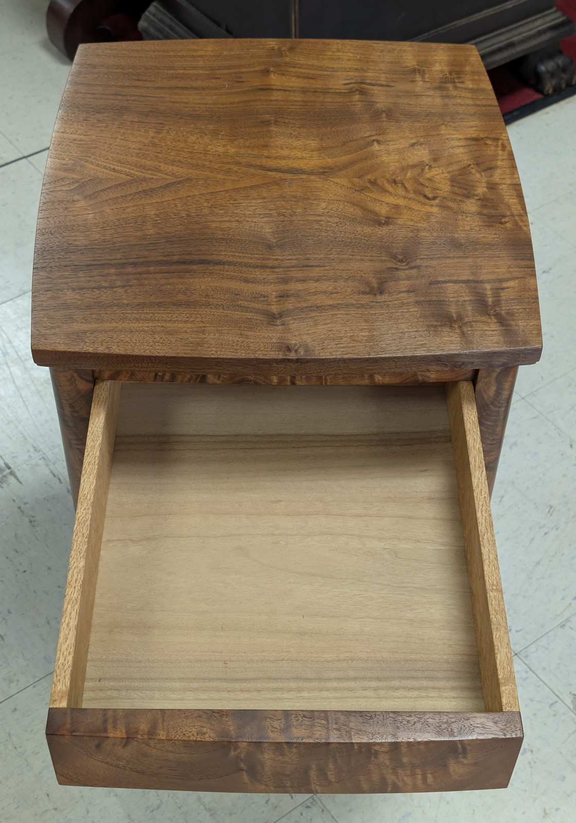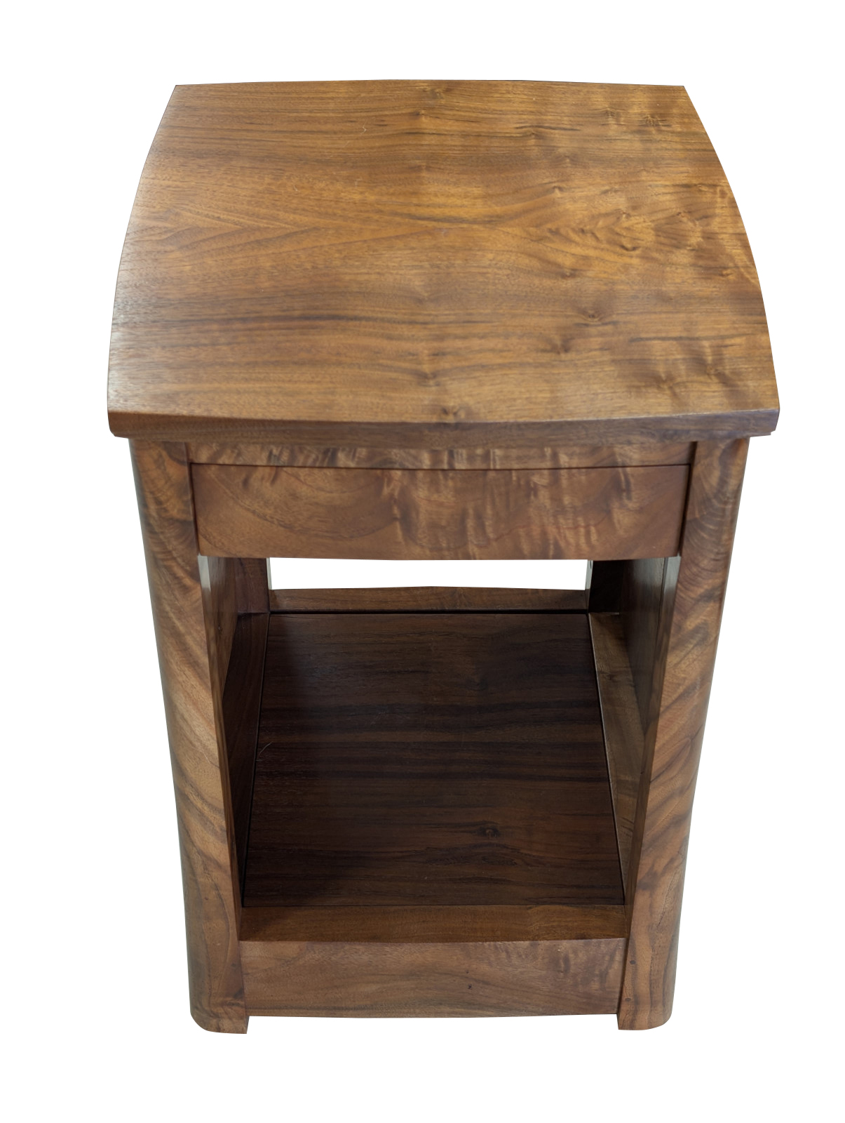 A finely crafted solid walnut end table, distinguished by its rich, highly figured grain and softly sculpted, architectural form. Clean, minimalist case featuring a single dovetailed drawer—executed with quality joinery—and an open lower compartment ideal for display or storage. Modern organic feel, while the deep, hand-rubbed finish enhances the natural warmth and movement of the wood. Substantial yet refined, this piece bridges contemporary craftsmanship with classic studio furniture aesthetics, making it an exceptional accent beside a sofa or chair.