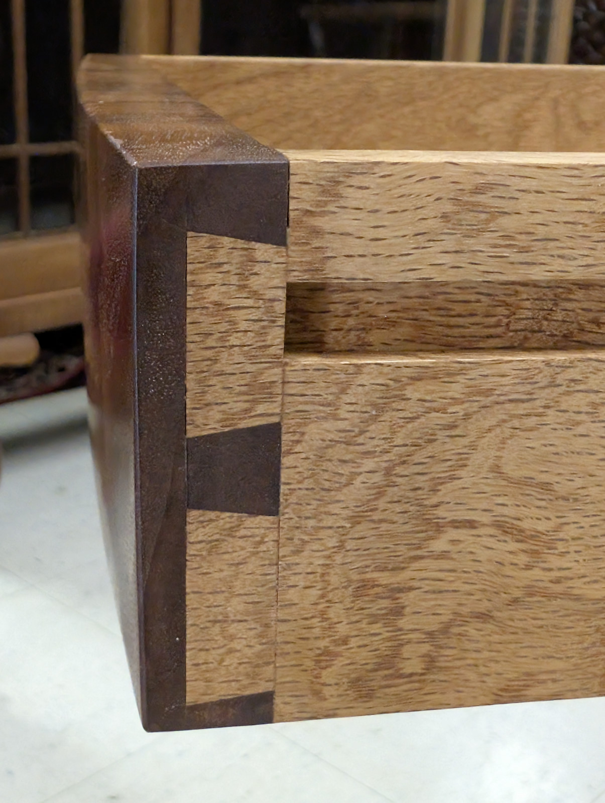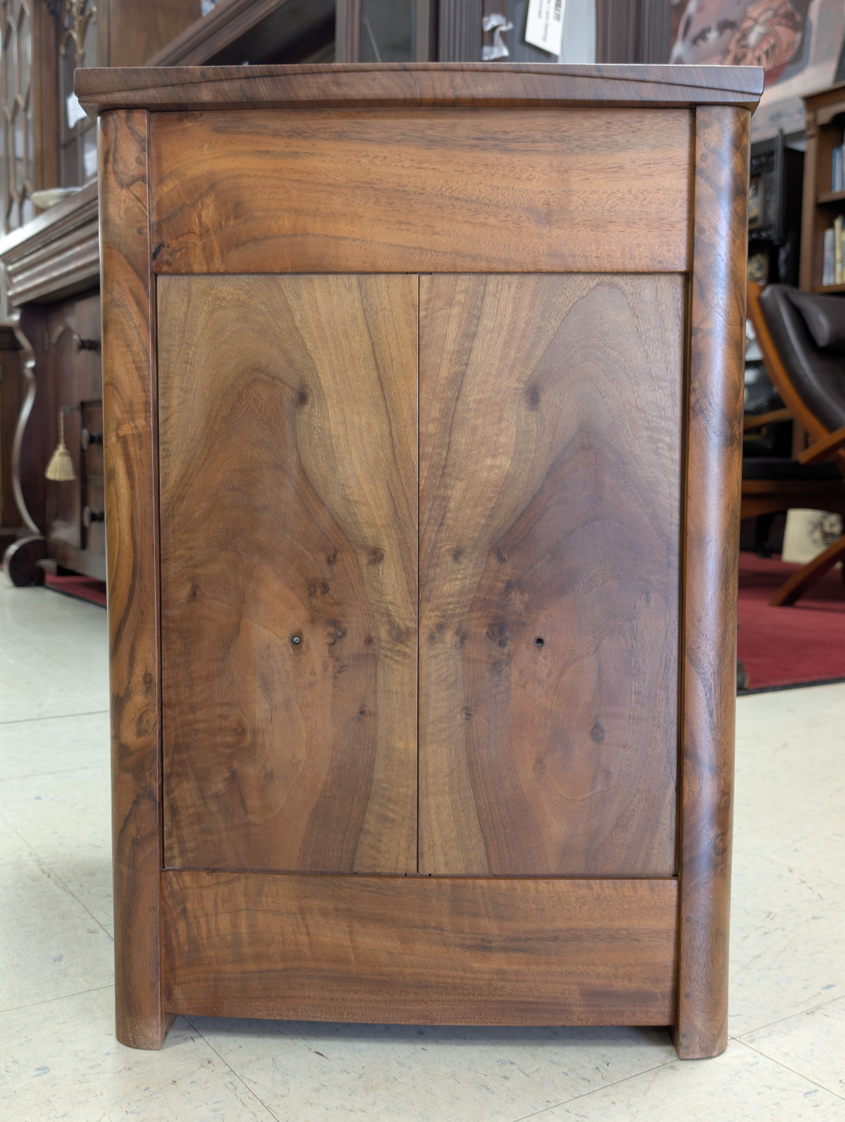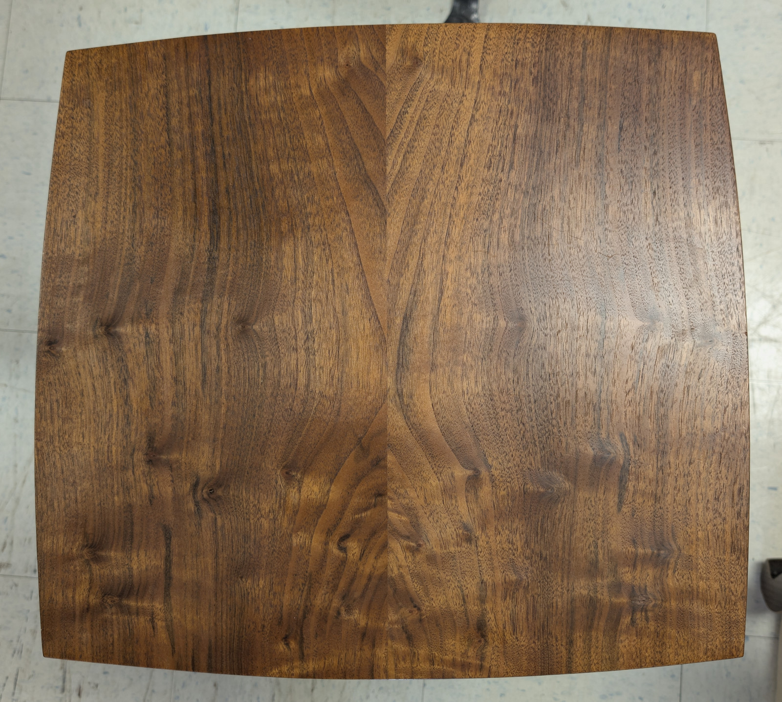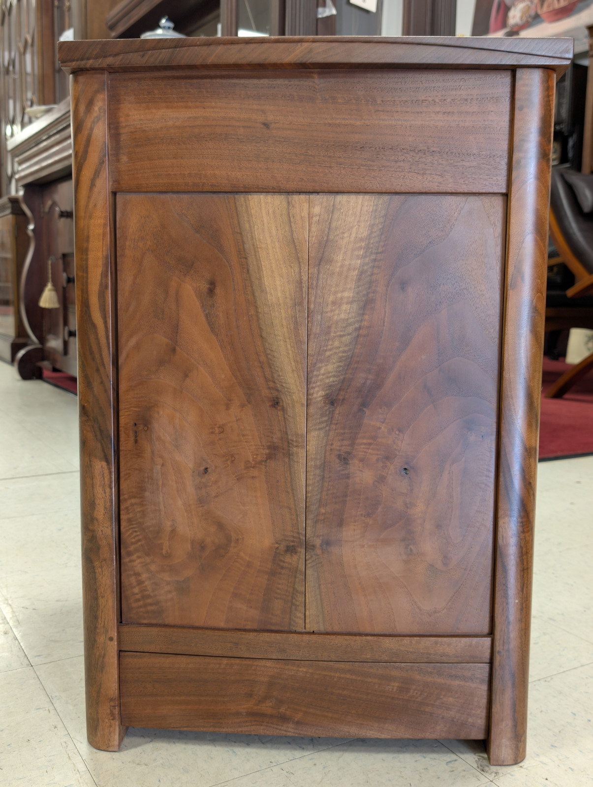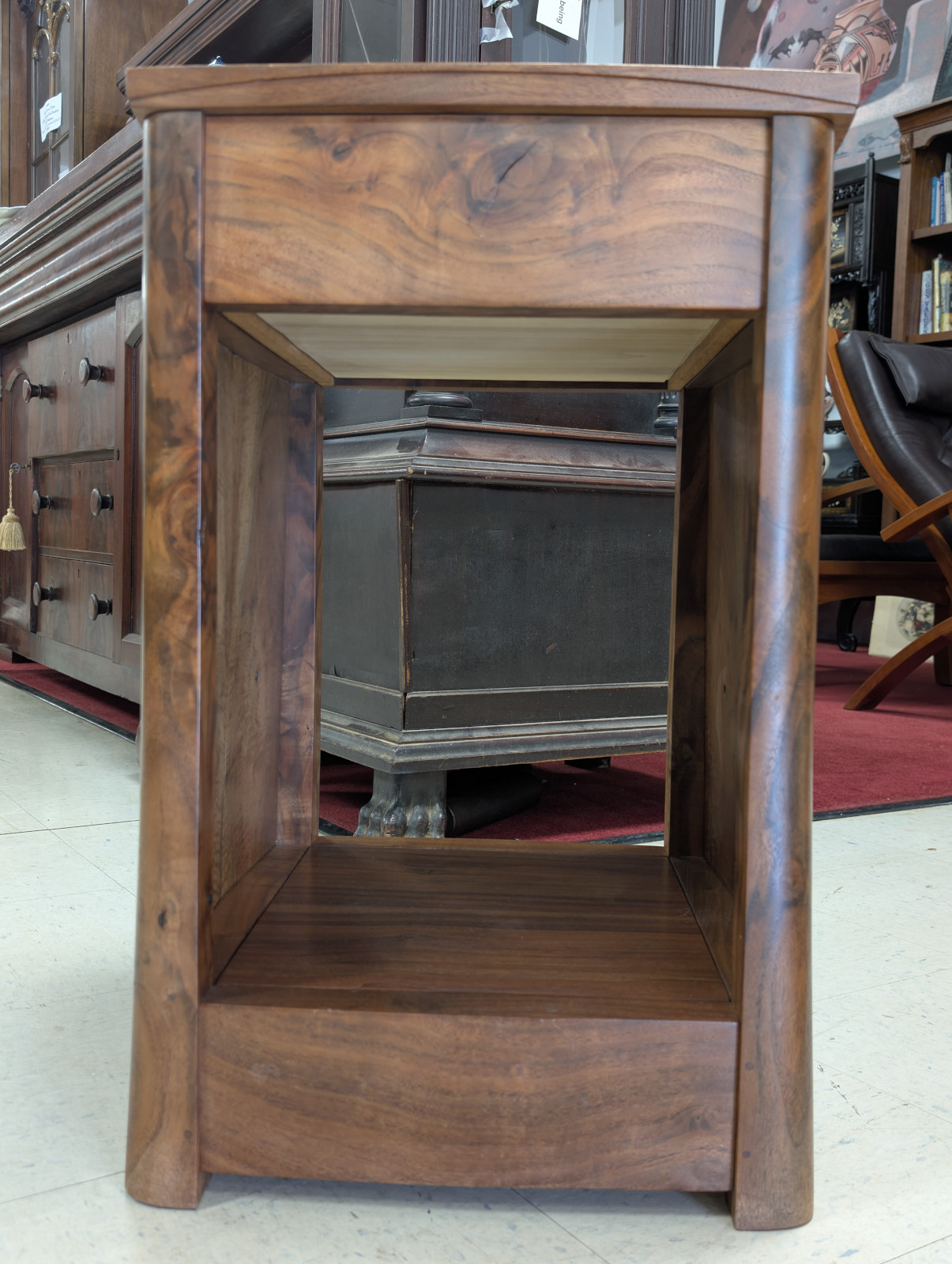 A finely crafted solid walnut end table, distinguished by its rich, highly figured grain and softly sculpted, architectural form. Clean, minimalist case featuring a single dovetailed drawer—executed with quality joinery—and an open lower compartment ideal for display or storage. Modern organic feel, while the deep, hand-rubbed finish enhances the natural warmth and movement of the wood. Substantial yet refined, this piece bridges contemporary craftsmanship with classic studio furniture aesthetics, making it an exceptional accent beside a sofa or chair.