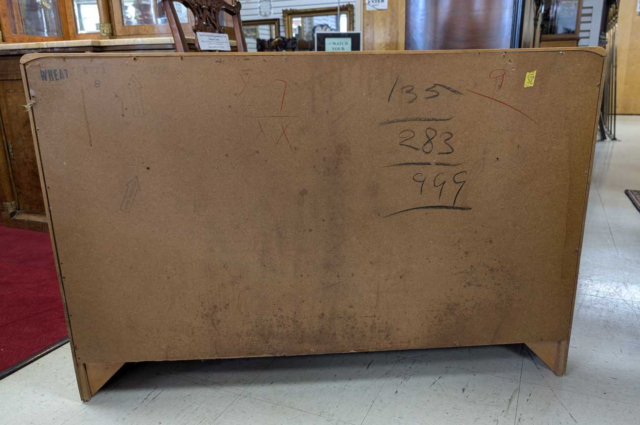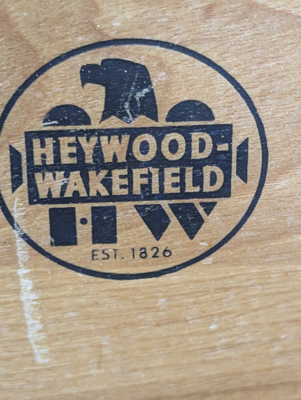 Amazing piece from Heywood Wakefield, In wheat finish, Sculptura collection, sculpted front design, 3 large dovetailed drawers. In great condition, expected age and use wear. Minor scratches and dents. See all photos for condition. Measures: 30.5″H x 46″W x 19.25″D. We also have the 4 drawer dresser available.