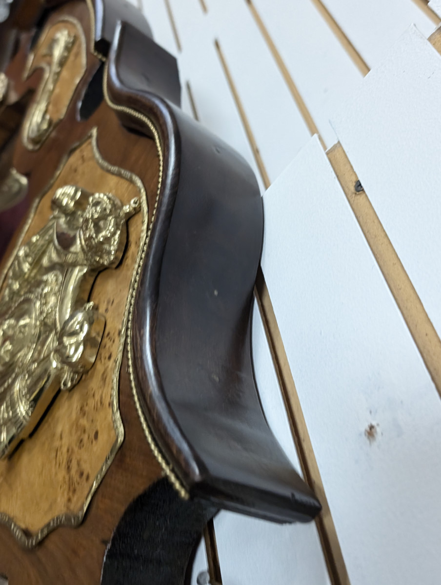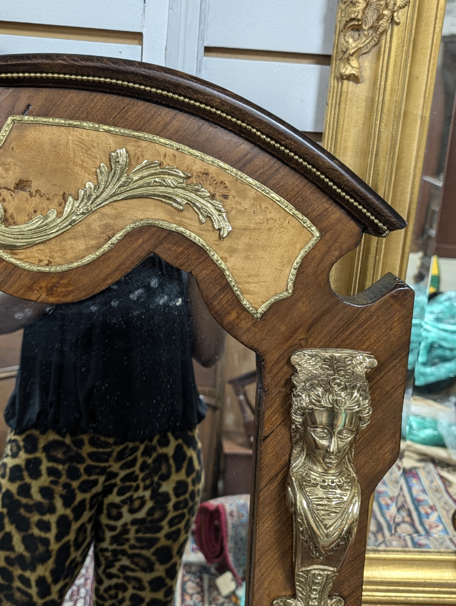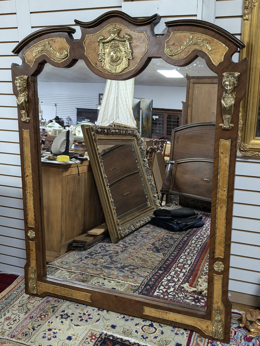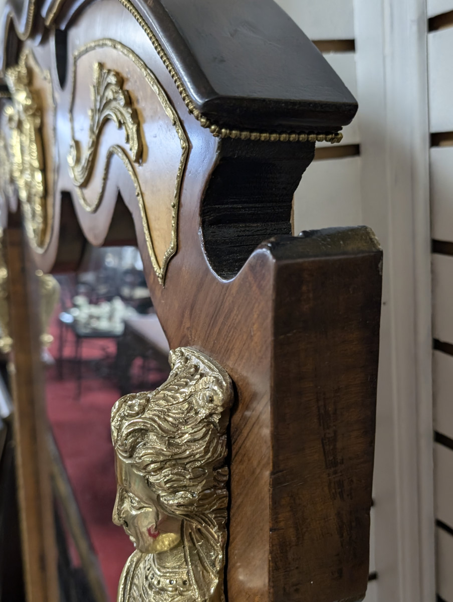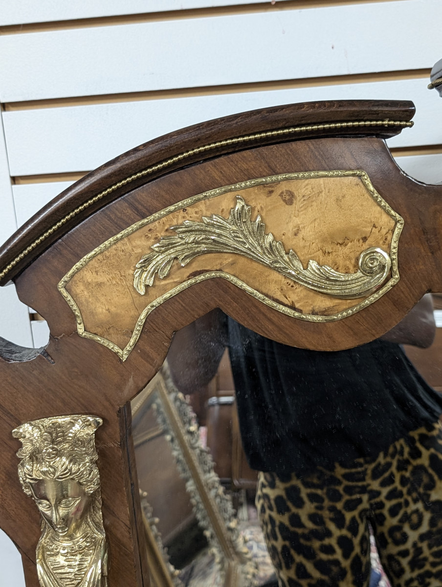 Gorgeous!!! Wood frame, Burl and Walnut, Brass ormolu, very heavy. Great overall condition, very minor wear. See all photos. Measures: 61″H x 47.5″W x 2.5″D.
