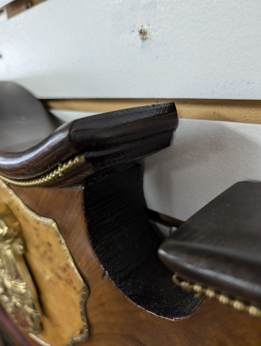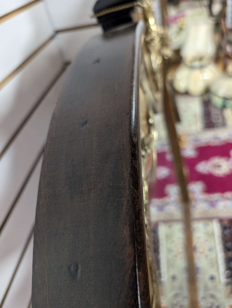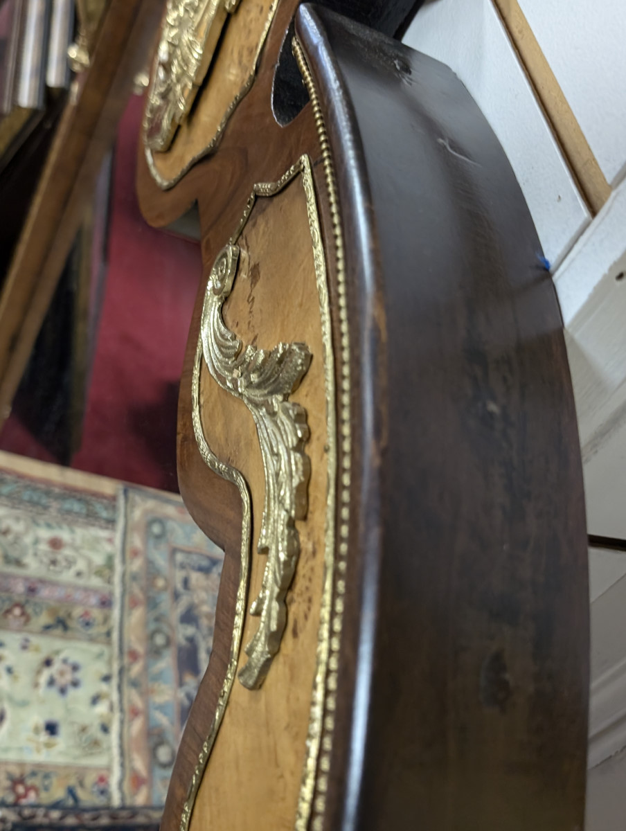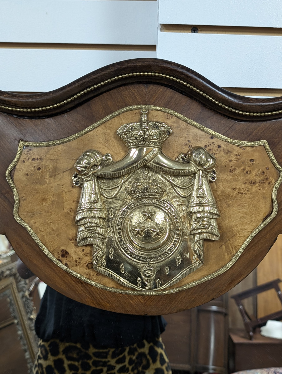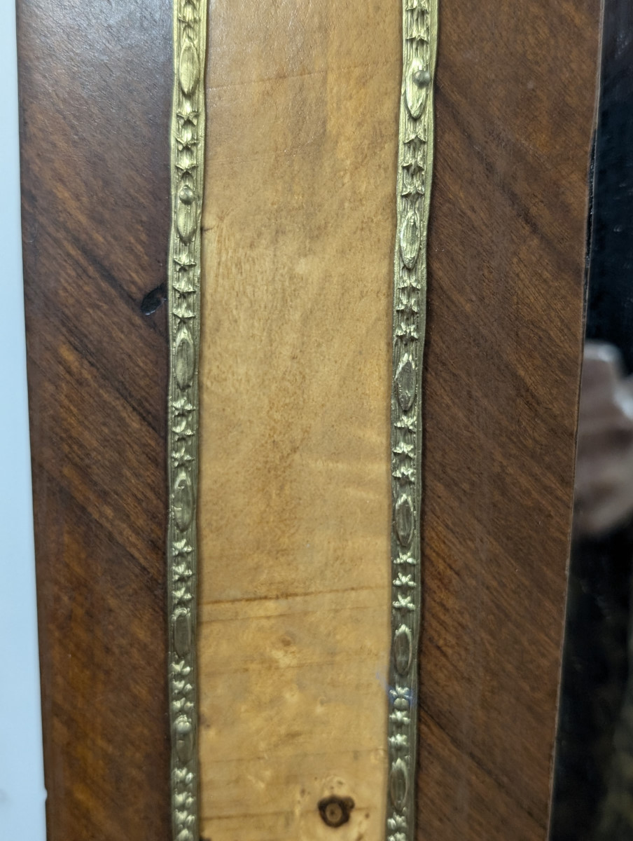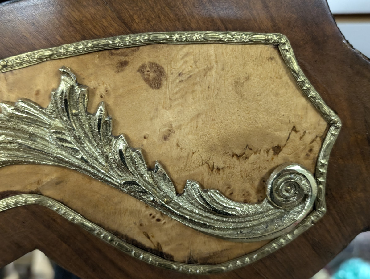 Gorgeous!!! Wood frame, Burl and Walnut, Brass ormolu, very heavy. Great overall condition, very minor wear. See all photos. Measures: 61″H x 47.5″W x 2.5″D.