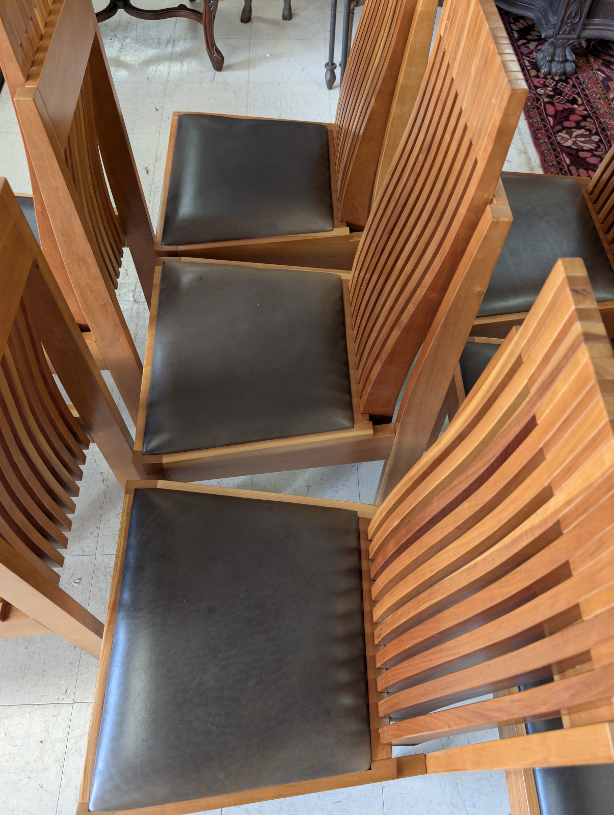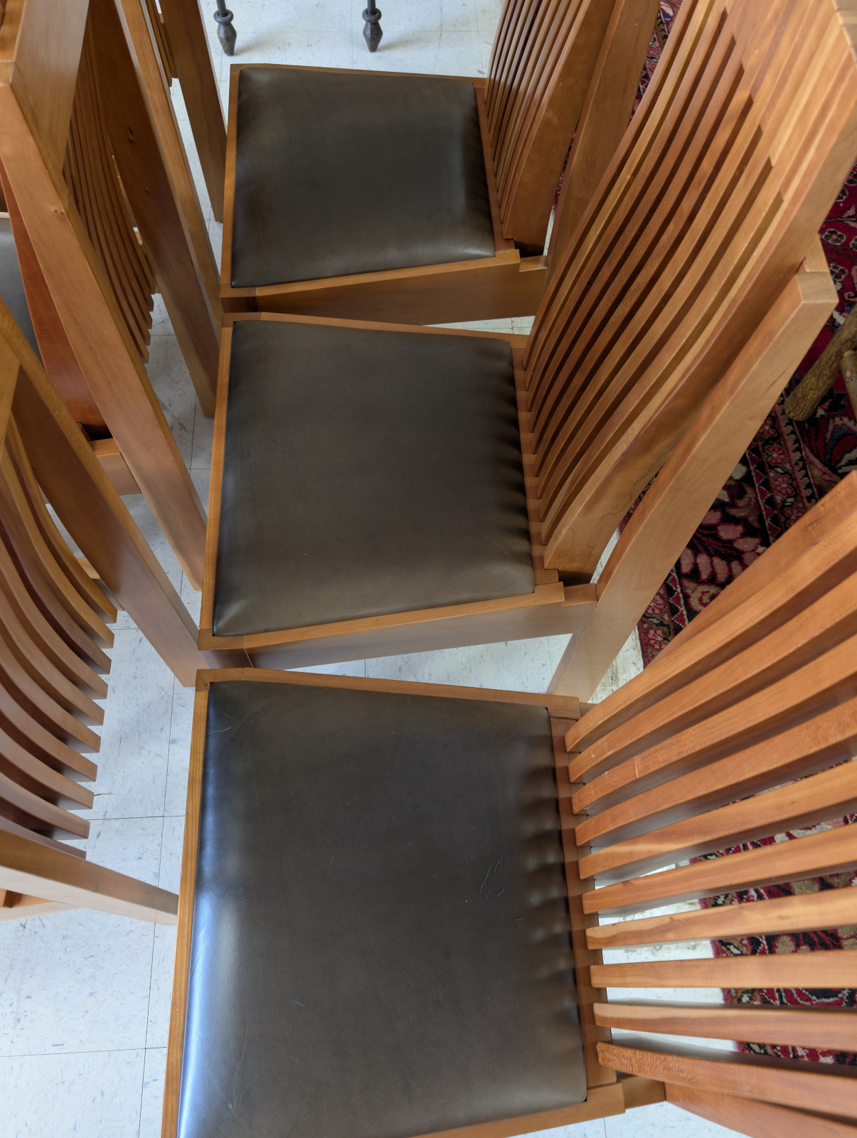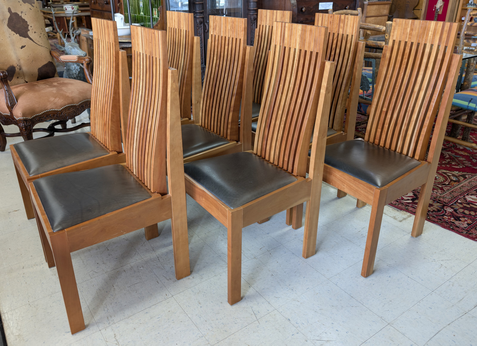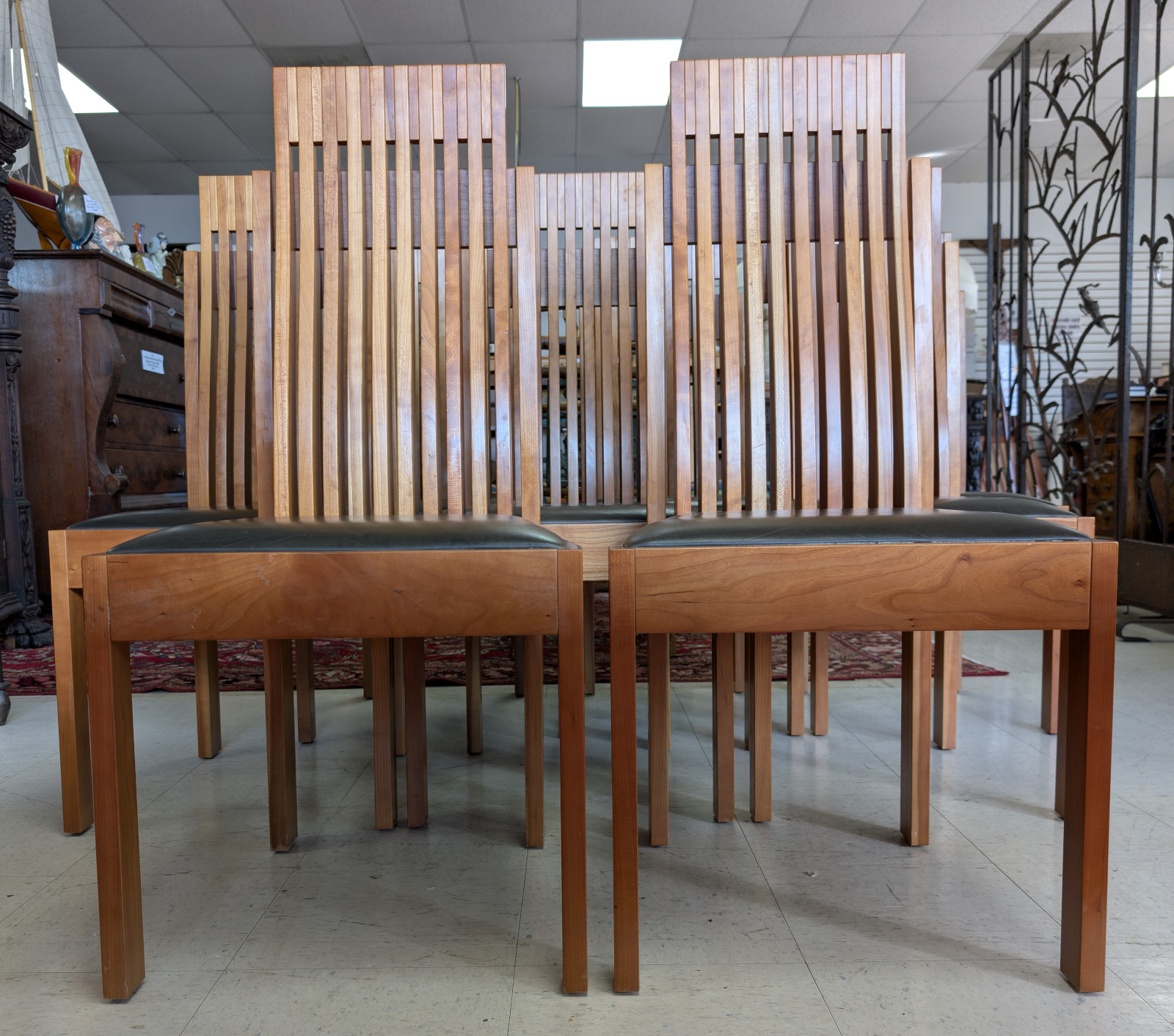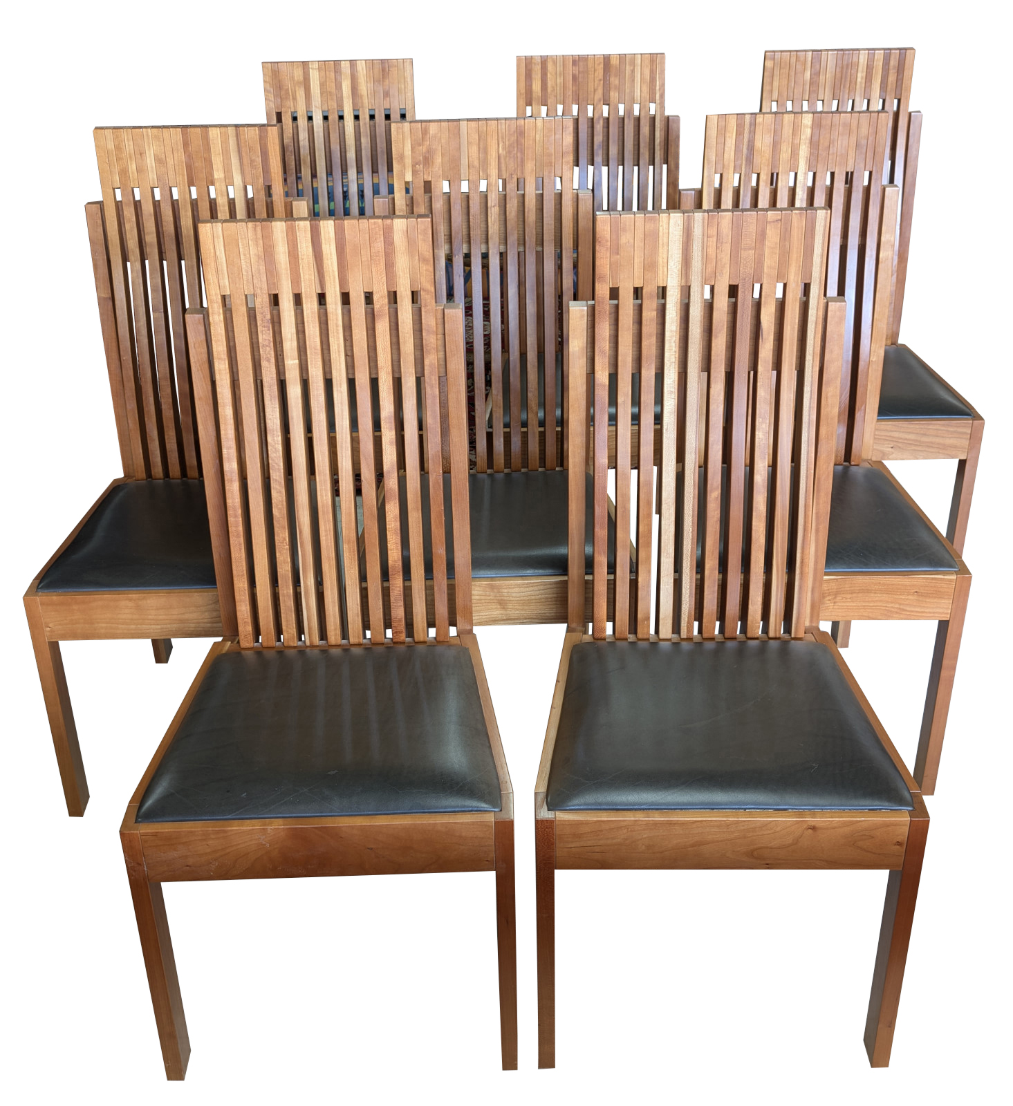 Accompanying the table are eight high-back dining chairs, each meticulously constructed with vertical slat backs in the manner reminiscent of Prairie School and Arts & Crafts traditions. The chairs feature finely joined frames and upholstered seats in dark leather, providing both visual contrast and comfortable support. The overall aesthetic is one of disciplined design—clean lines, refined proportions, and superior material selection.