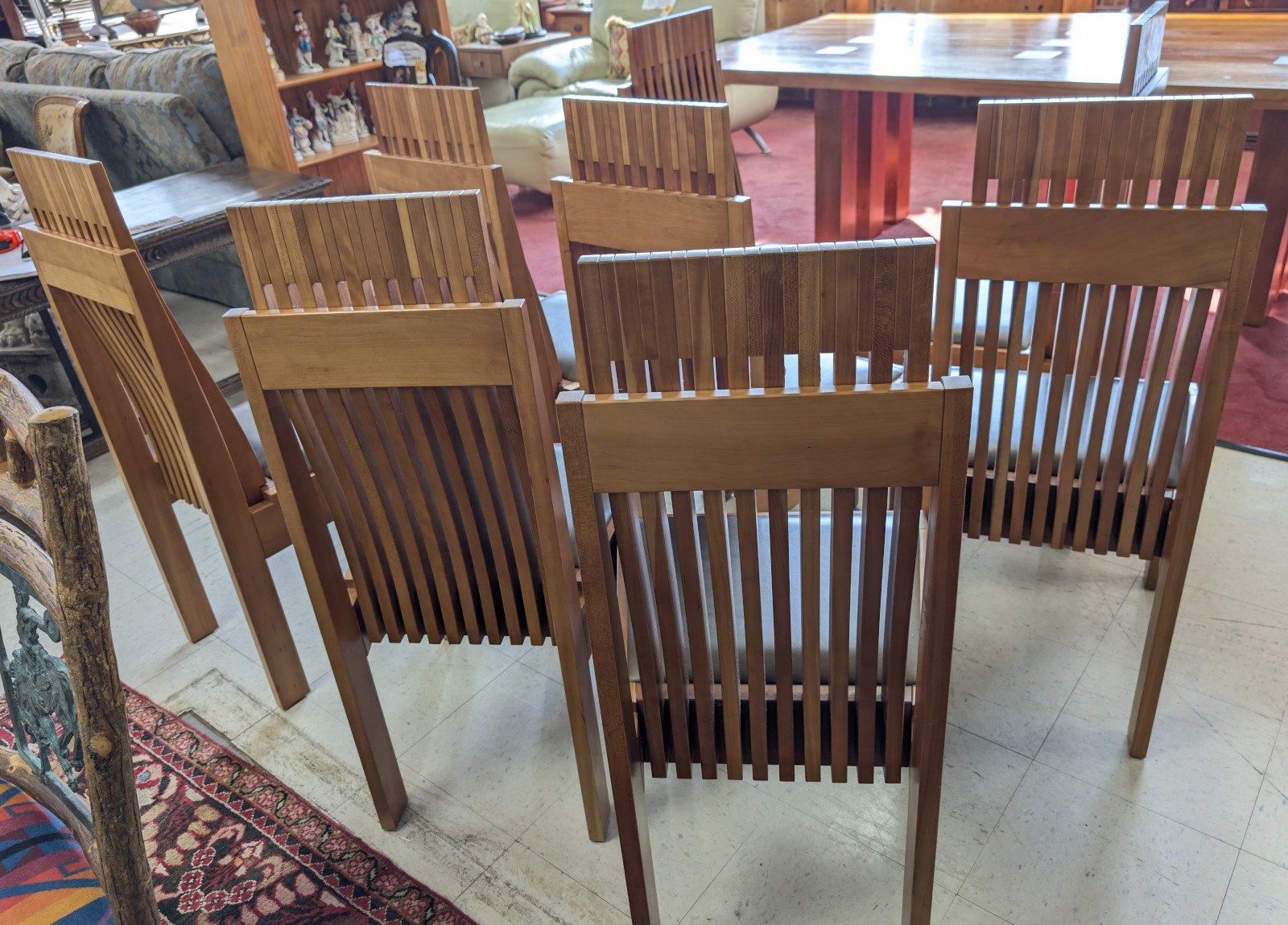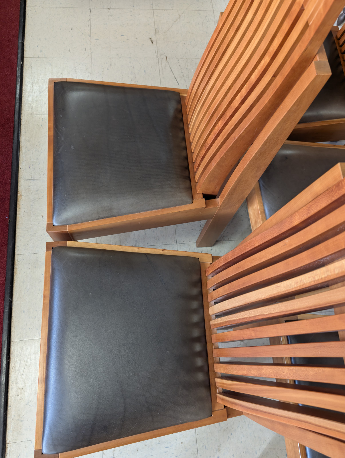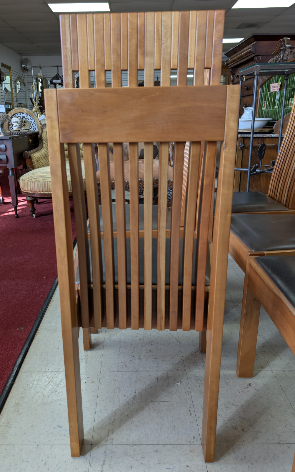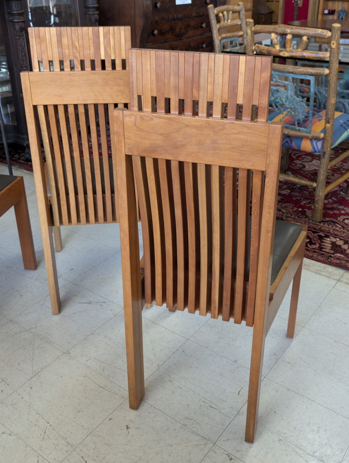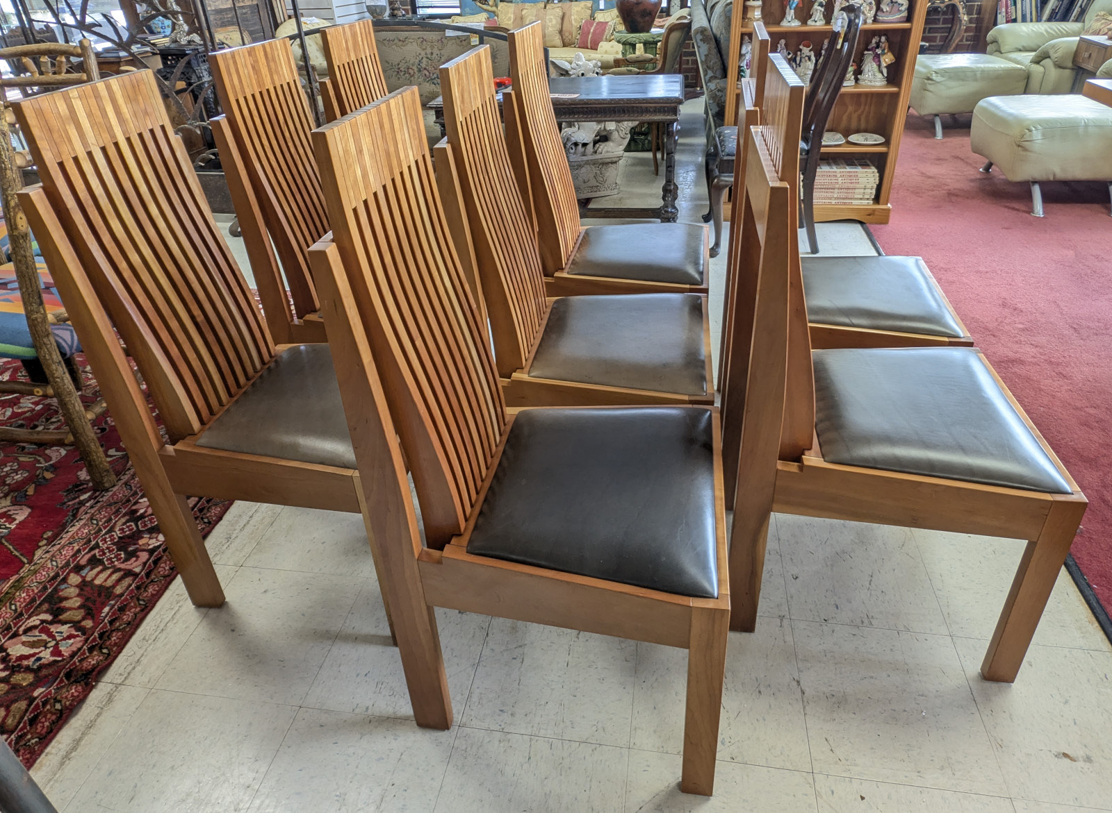 Accompanying the table are eight high-back dining chairs, each meticulously constructed with vertical slat backs in the manner reminiscent of Prairie School and Arts & Crafts traditions. The chairs feature finely joined frames and upholstered seats in dark leather, providing both visual contrast and comfortable support. The overall aesthetic is one of disciplined design—clean lines, refined proportions, and superior material selection.