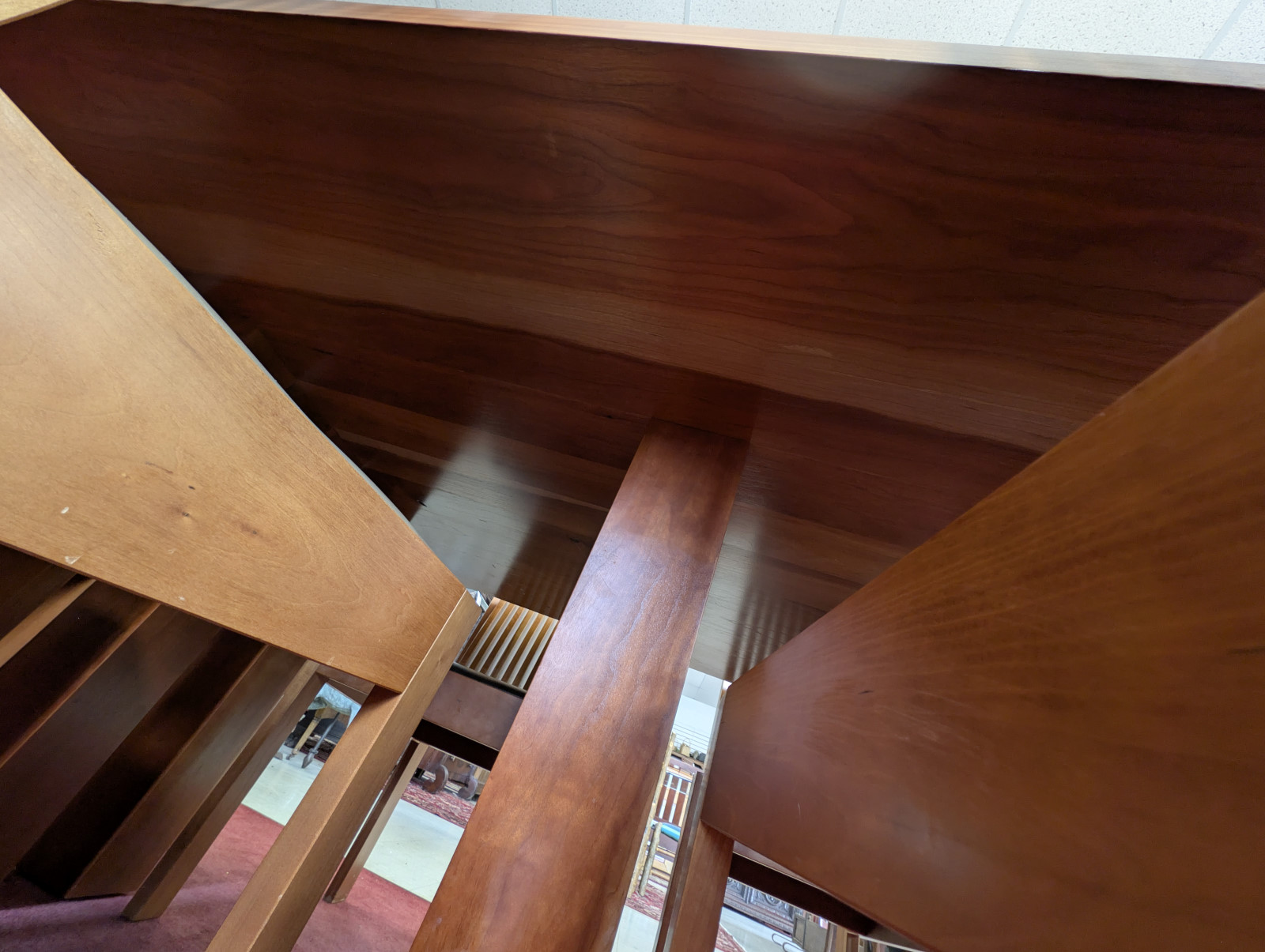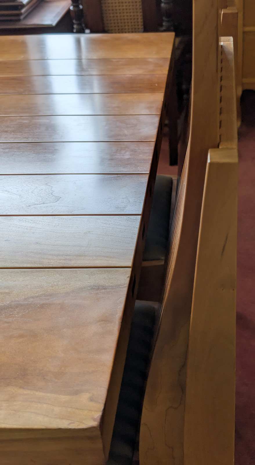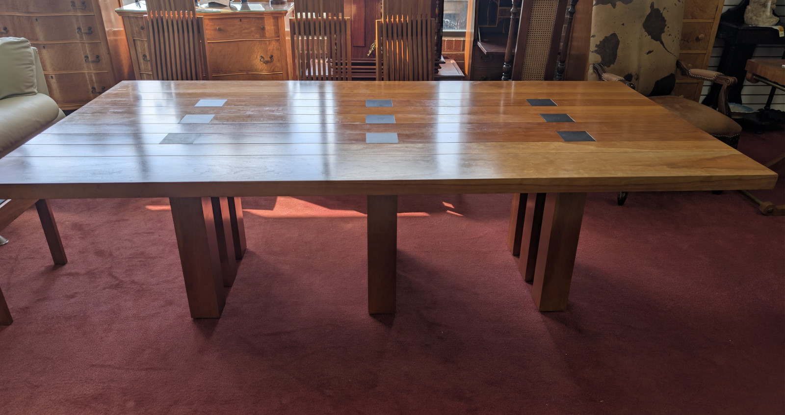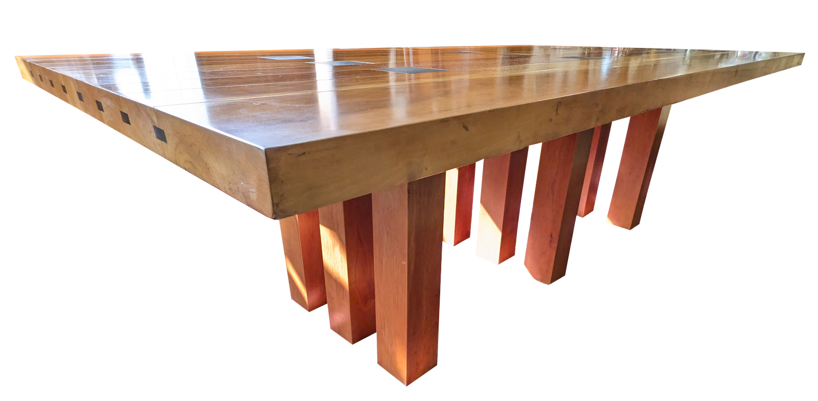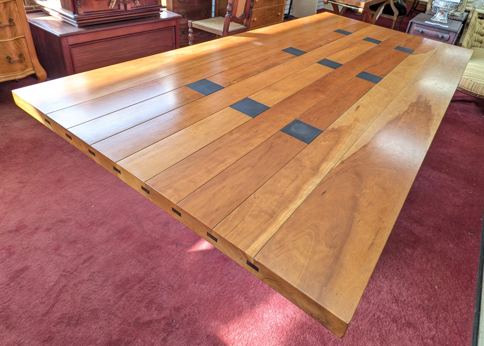 Executed in richly figured Cherry hardwood the expansive eight-foot table is constructed with a substantial plank top, subtly articulated with linear inlay and contrasting square accents that lend a quiet geometric rhythm across the surface. The thick, rectilinear top is supported by a bold, multi-pedestal base, offering both exceptional stability and generous seating capacity.