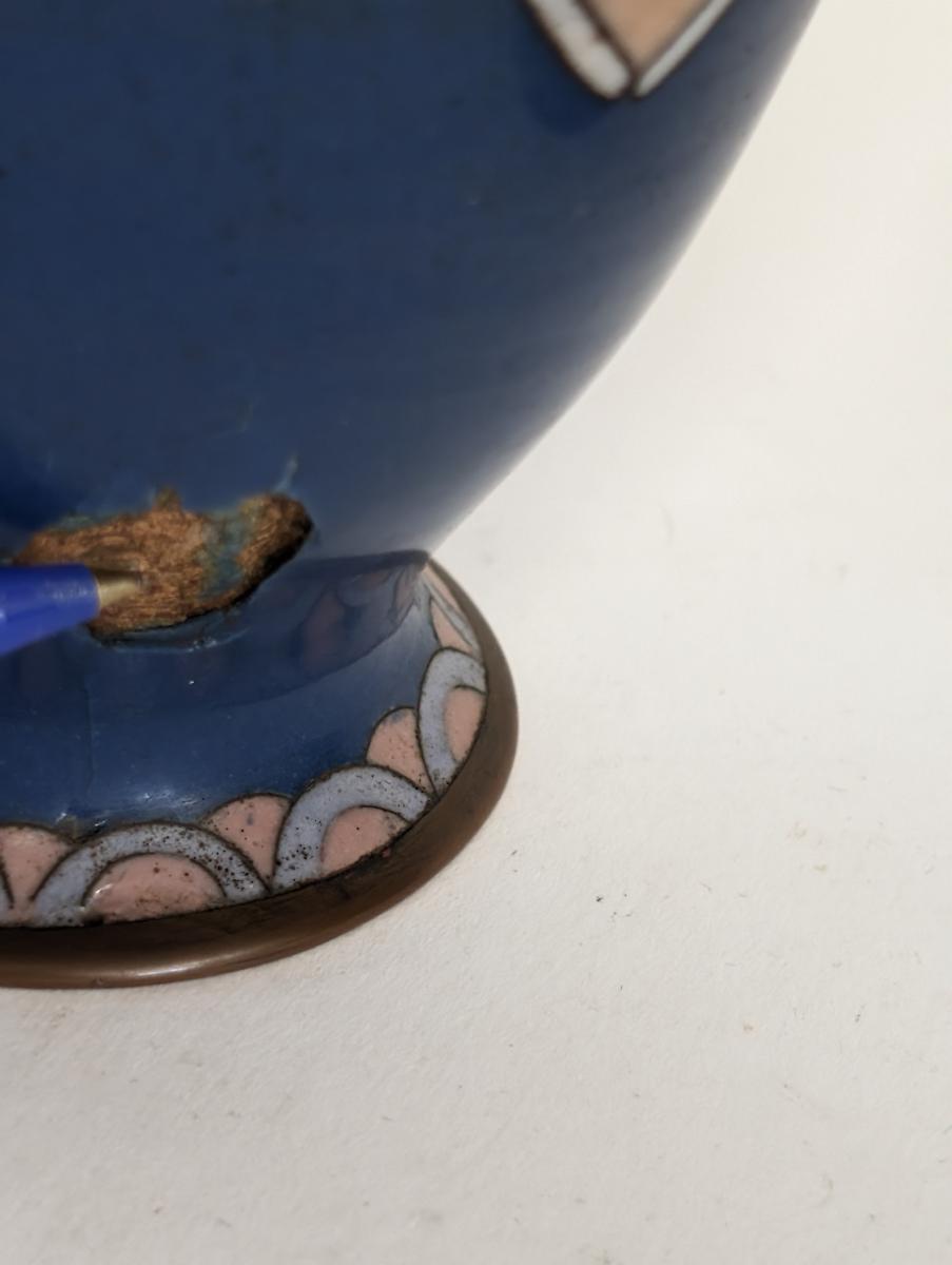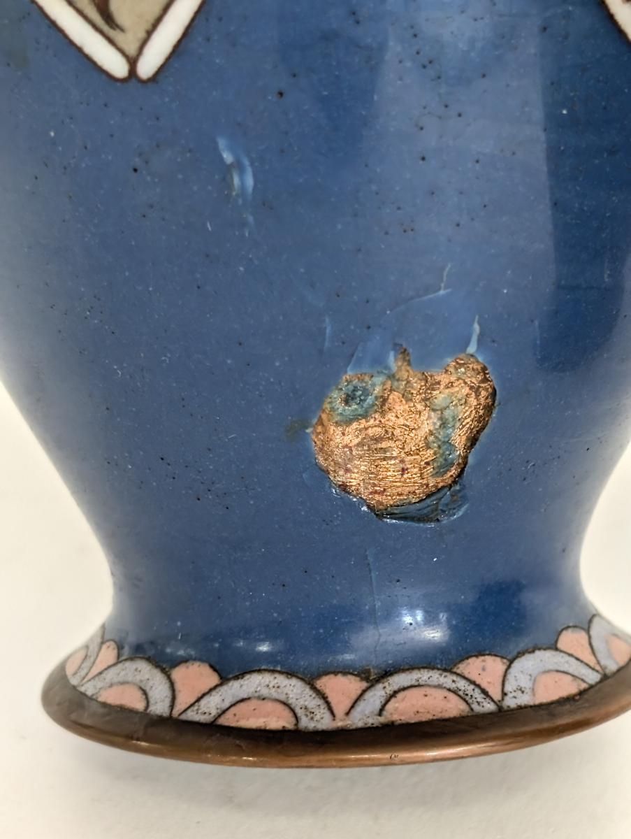 Antique, MeijiPeriod, Pair of Vases, Blue Background, Brass, Copper and enamel, Very good condition, expected age wear, one vase does have an obvious ding which has chipped the enamel, see all photos for condition. Measures: 10″H x 4″W. Shipping within US $24.95. No shipping outside the US.
