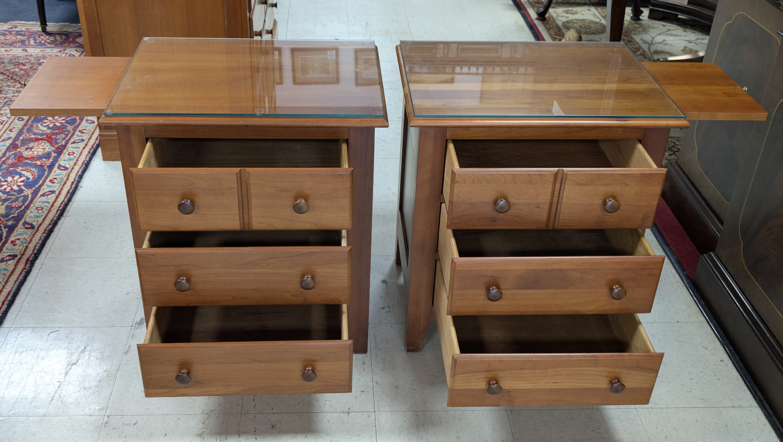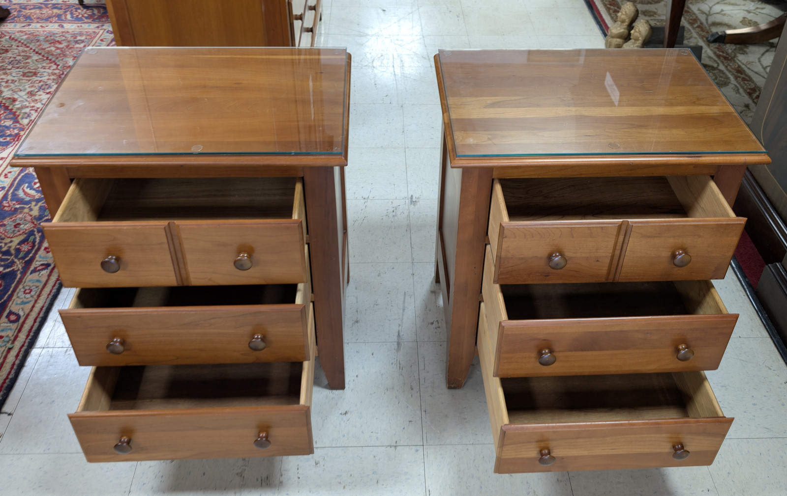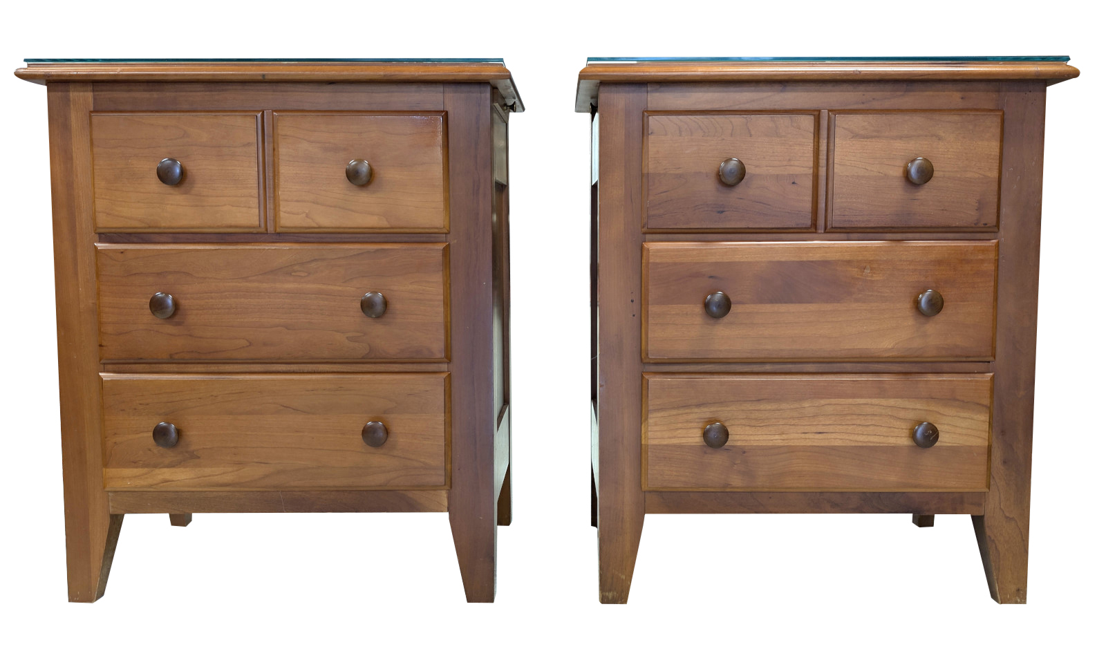Very good, sturdy condition. Light surface wear consistent with use. Glass tops intact except for one very small chip. Drawers operate smoothly with tight dovetail construction. Please view all photos for condition.