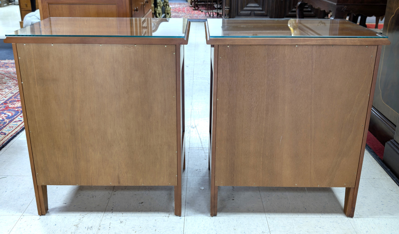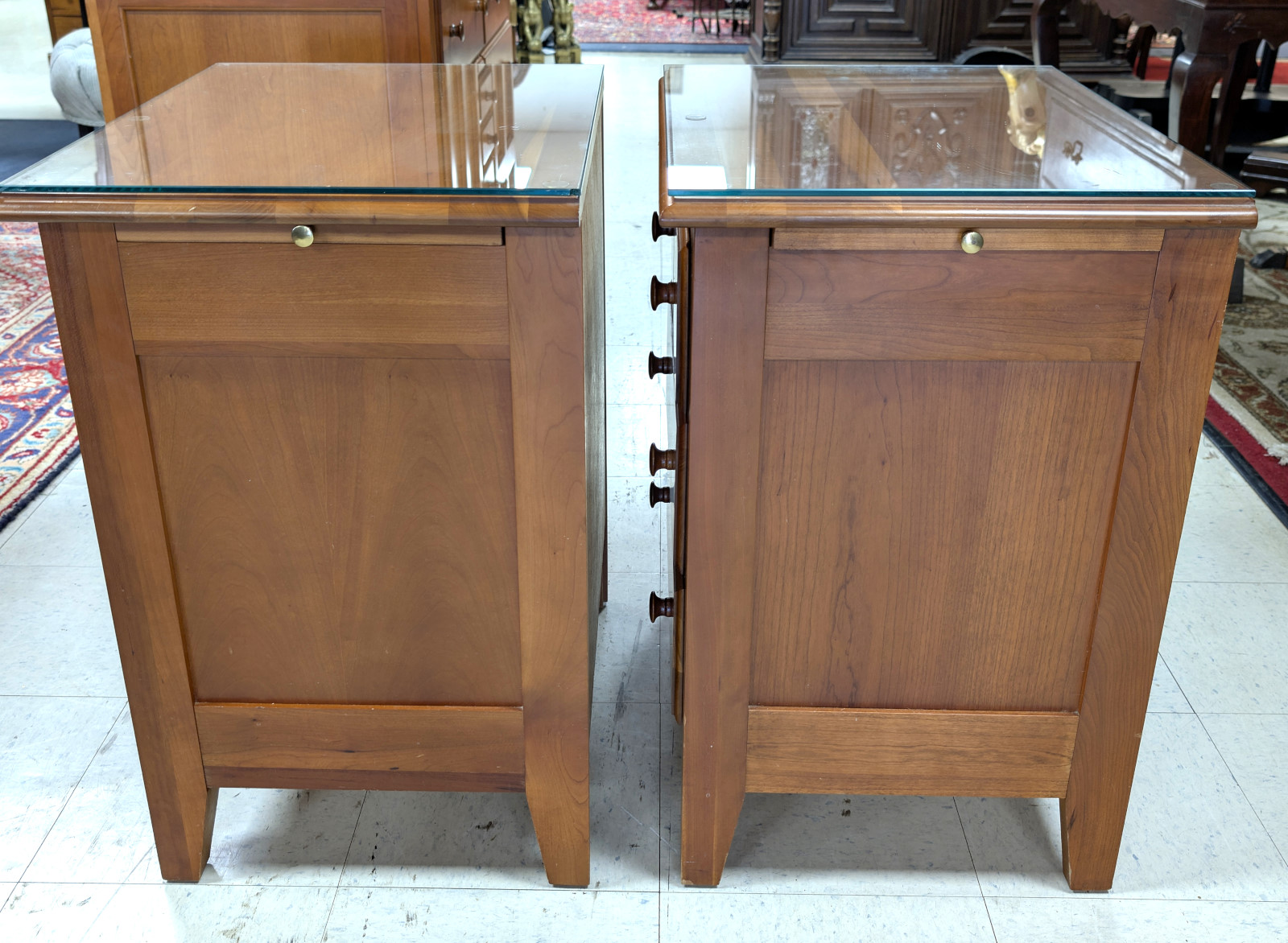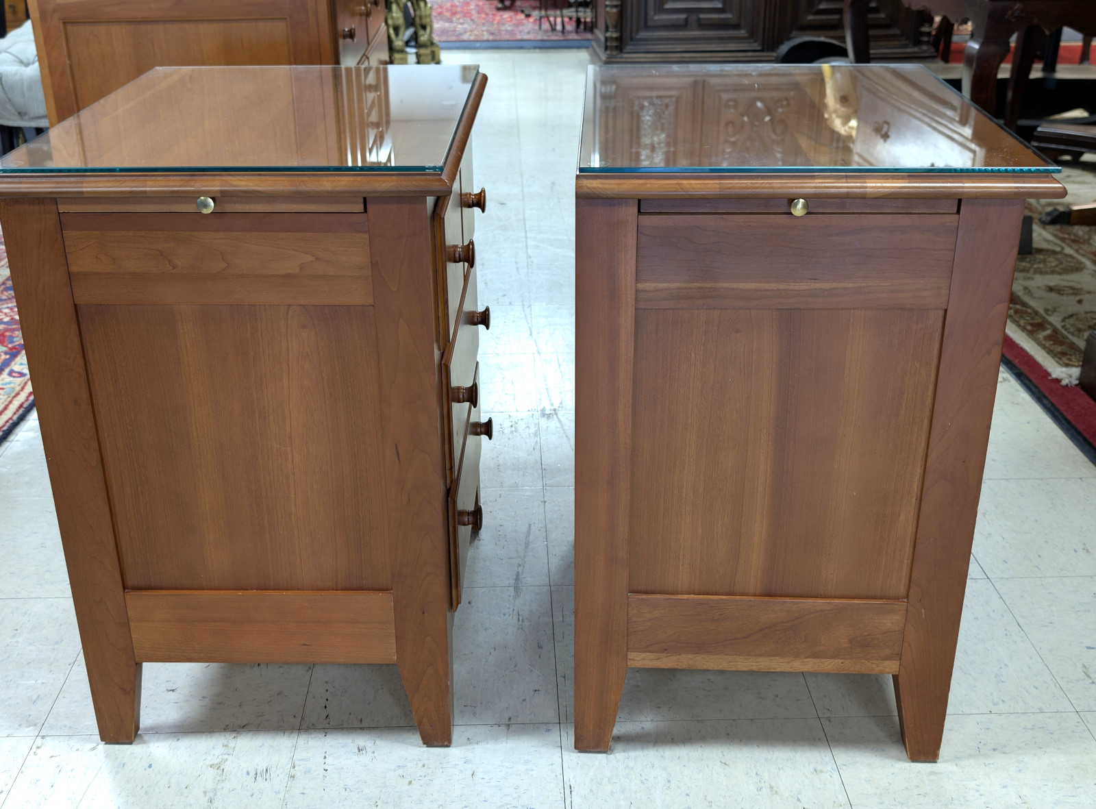 Very good, sturdy condition. Light surface wear consistent with use. Glass tops intact except for one very small chip. Drawers operate smoothly with tight dovetail construction. Please view all photos for condition.