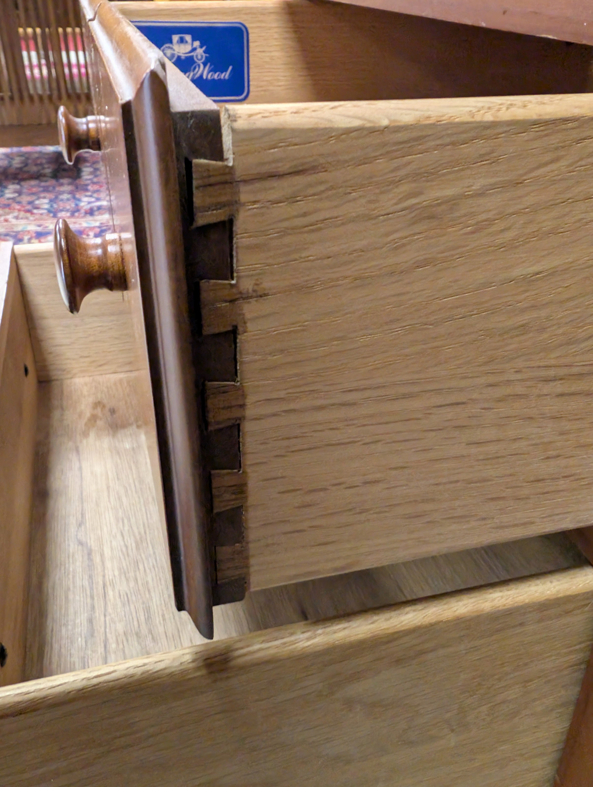 The case design includes three drawers, all fitted with classic turned wooden knobs. Notably, the drawers are constructed with dovetail joinery, a hallmark of quality craftsmanship and longevity. Pull-out side shelves provide additional surface area—ideal for reading materials or bedside essentials—enhancing both function and versatility.