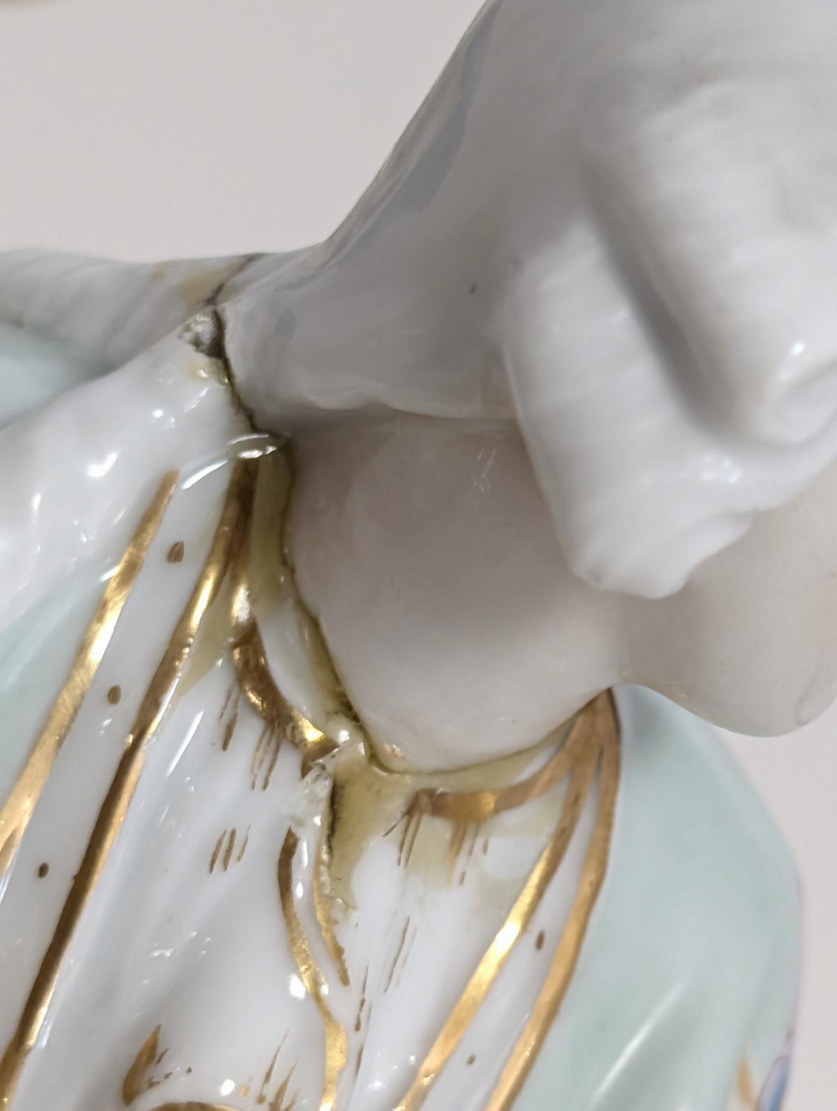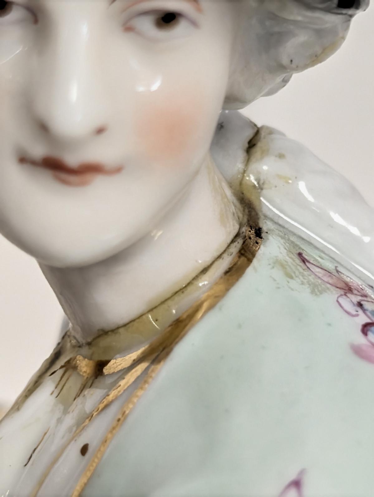 Pair of figures, Porcelain, Meissen-Style, Lady and Gentleman, They have the look of Meissen, but not the markings. Very nice set. Good condition, Head of male figure glued back on (not immediately noticeable, Chip on front base bottom of male figure, Missing pointer finger on right hand of lady figure. See all photos. Measures; 10.5:H x 5″W x 8″D each. Shipping: $34.95 within the US only. No shipping outside the US.