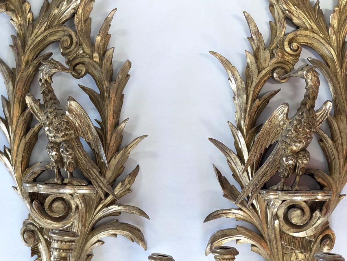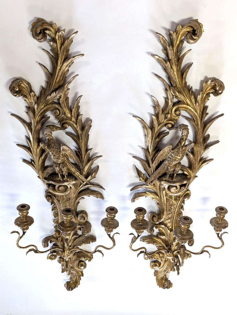 Large vintage sconces, Regency style, Hand carved, Wood, Gold gilt, Hand wrought iron. Overall beautiful condition. minor wear. Measures: 46″H x 15.5″W x 9″D ~ 46″H x 16″W x 8.5″D.