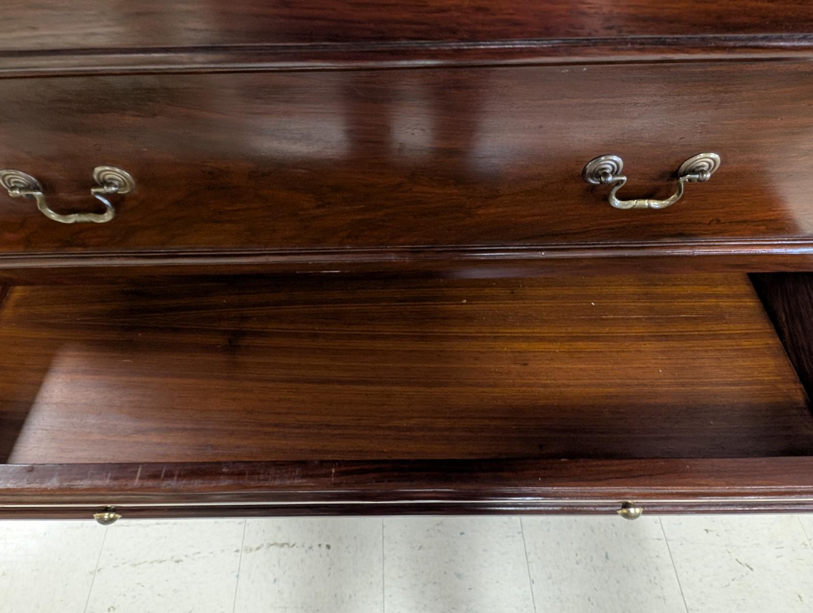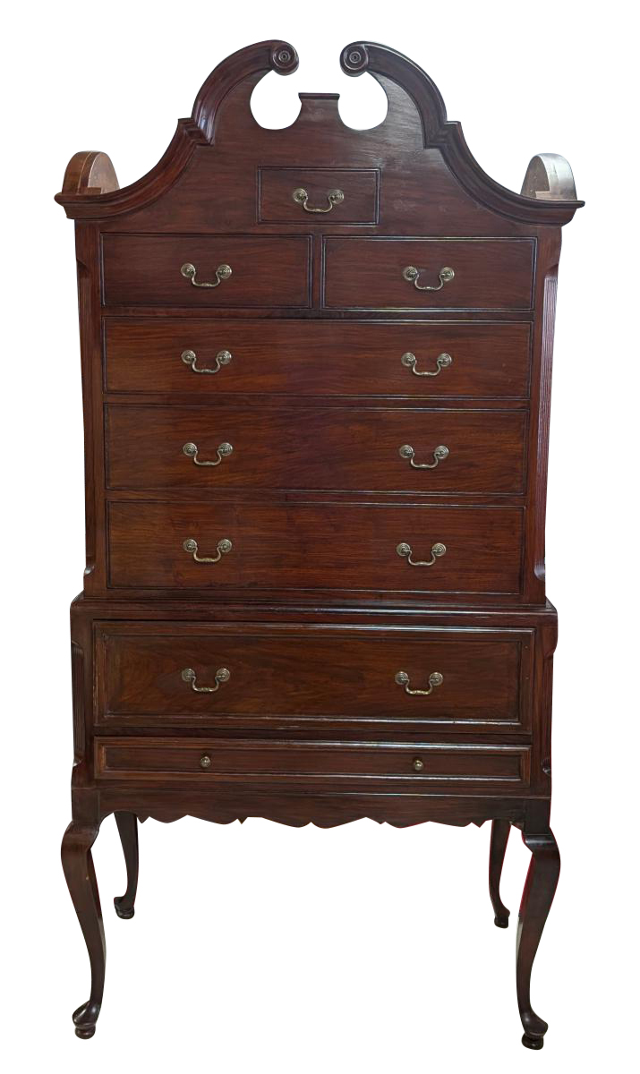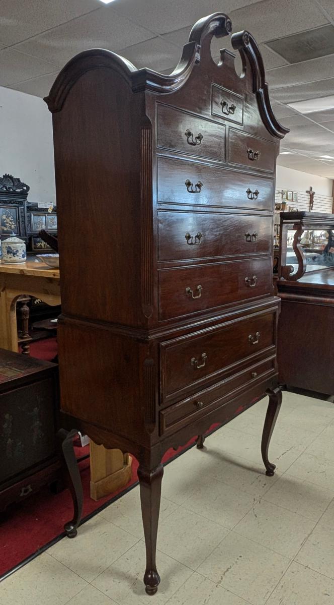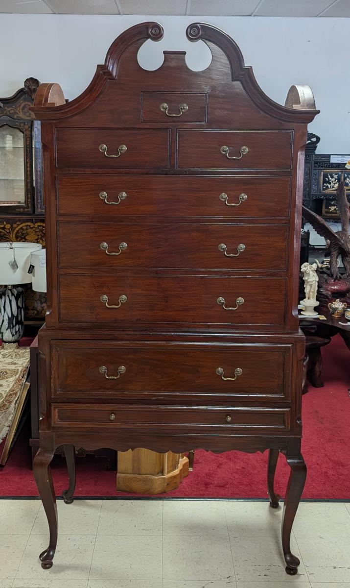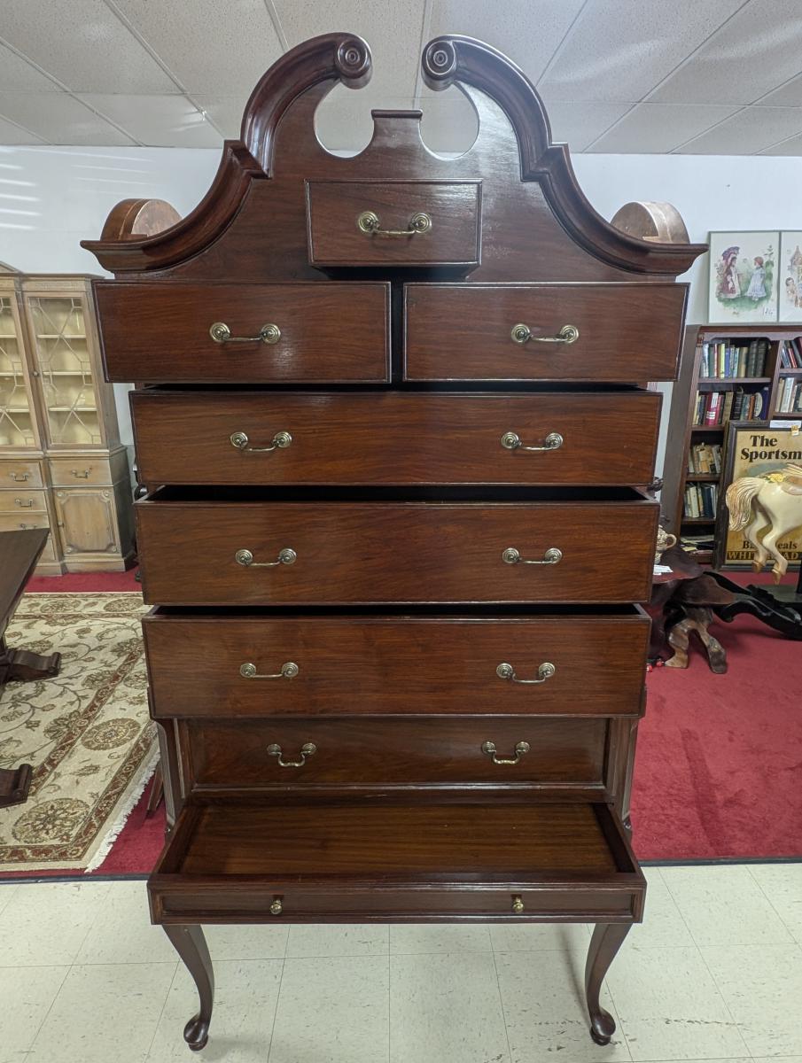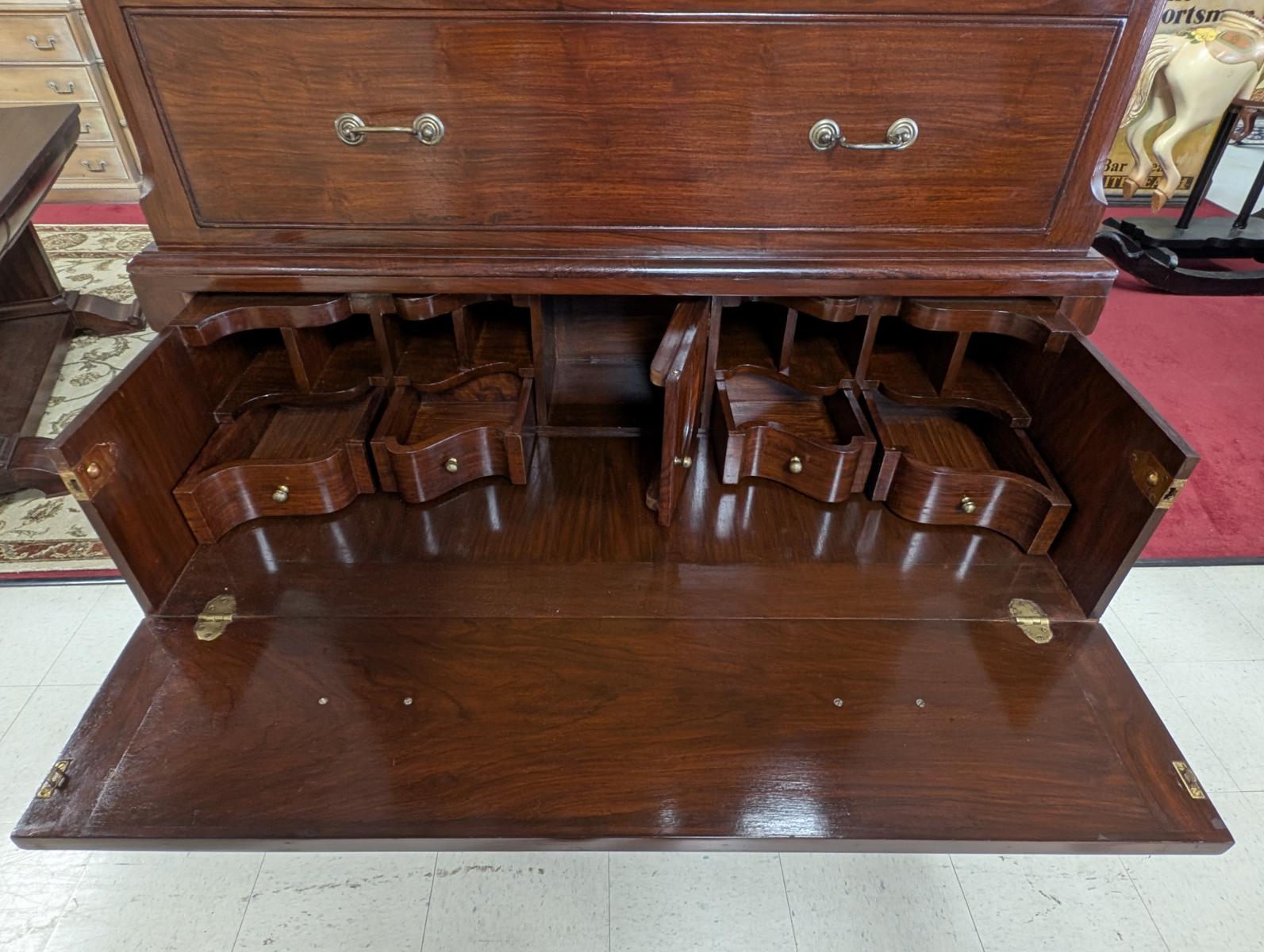Queen Anne Style, Solid Mahogany, Interrupted pediment top, 8 Drawers, One drawers is a pullout desk with pigeonholing, Entire case rest on Queen Anne legs with padded feet. Overall great condition, has some wear, chips and cracked areas due to miushandling. See all photos for condition. Measures: 87.25″H x 44″W x 23″D.