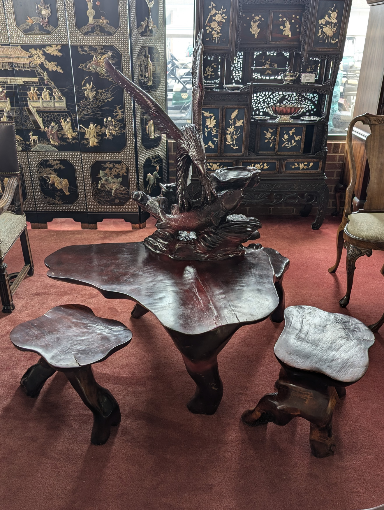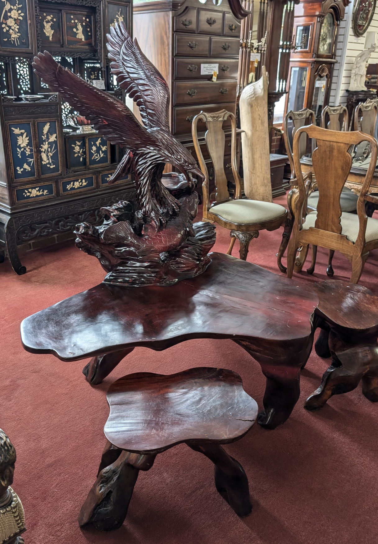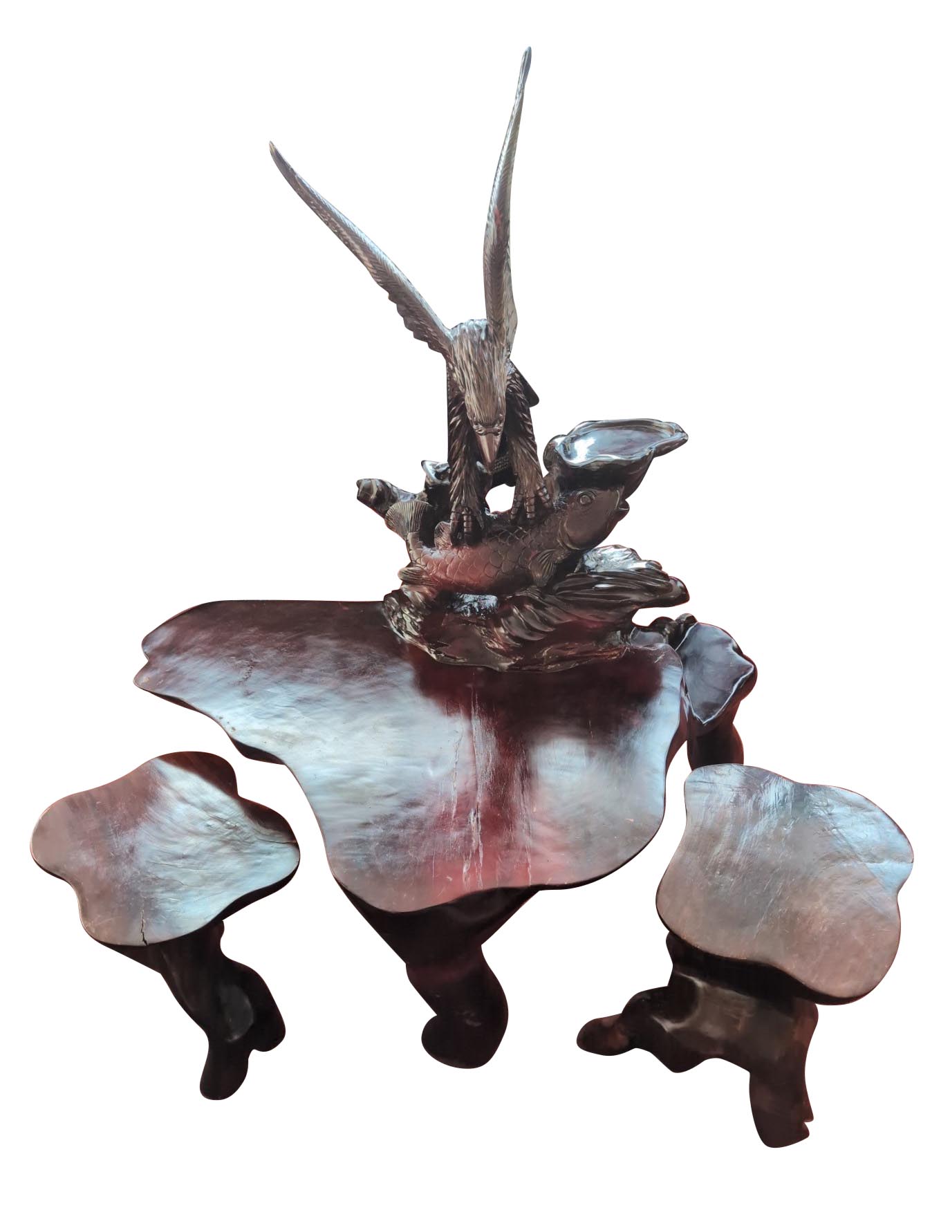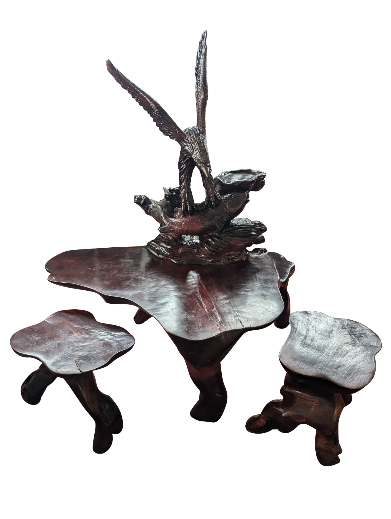 RARE Vintage Rosewood 3 Piece Tea Table Set, Eagle, Koi Fish