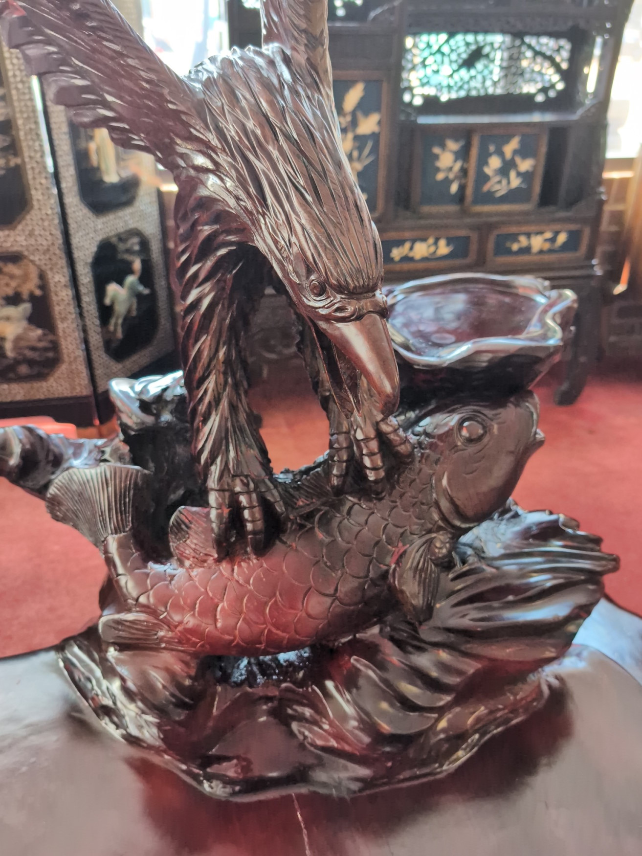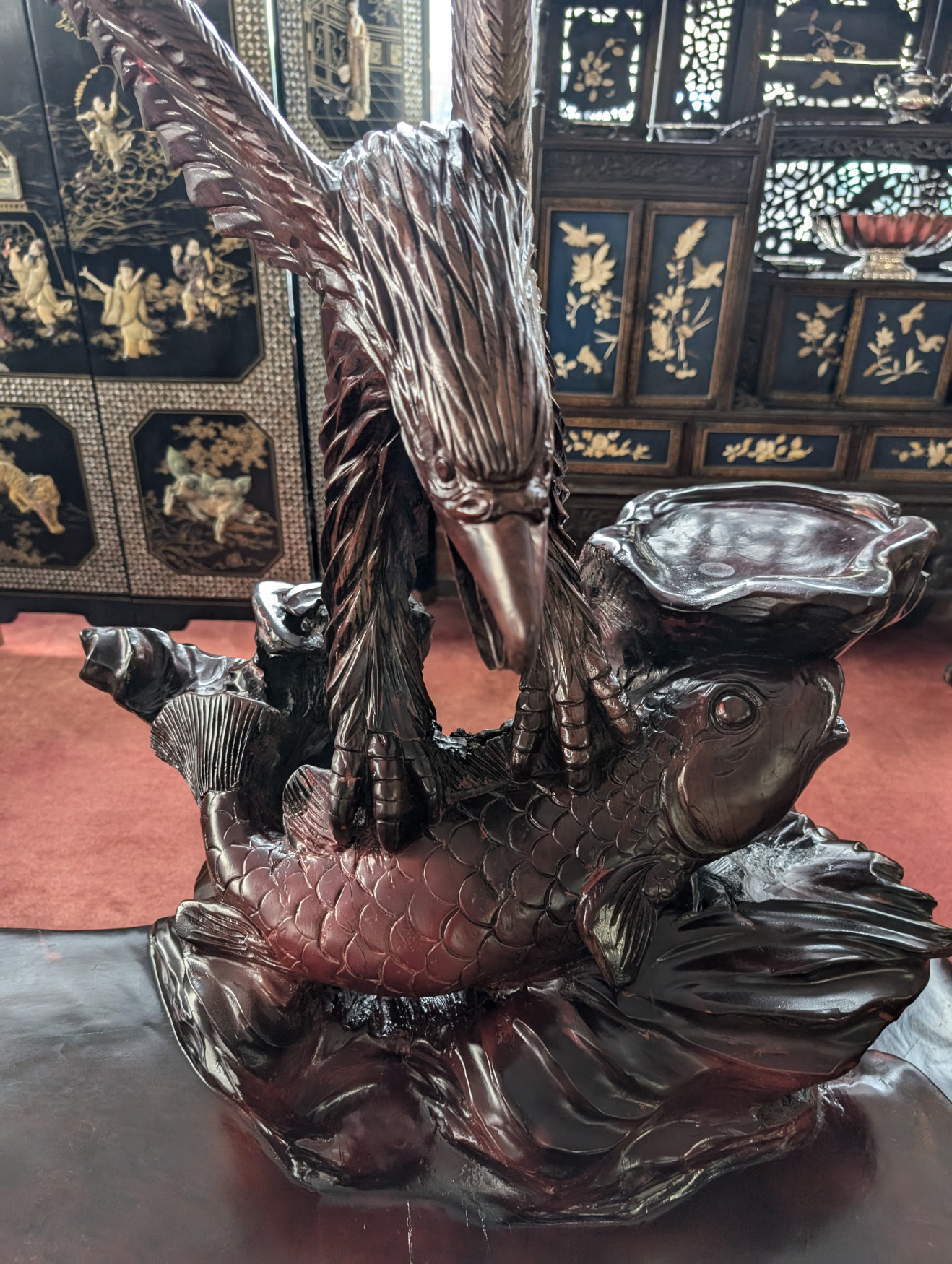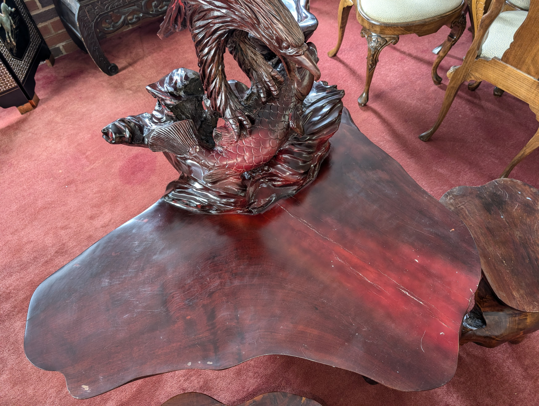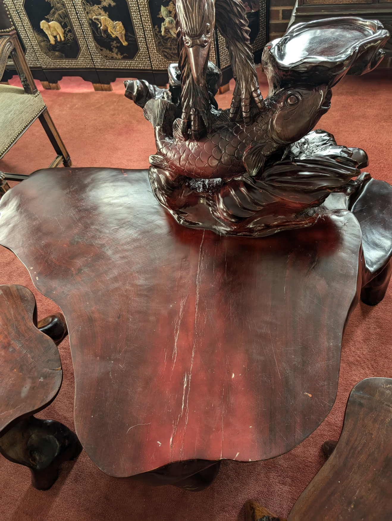 RARE Vintage Rosewood 3 Piece Tea Table Set, Eagle, Koi Fish