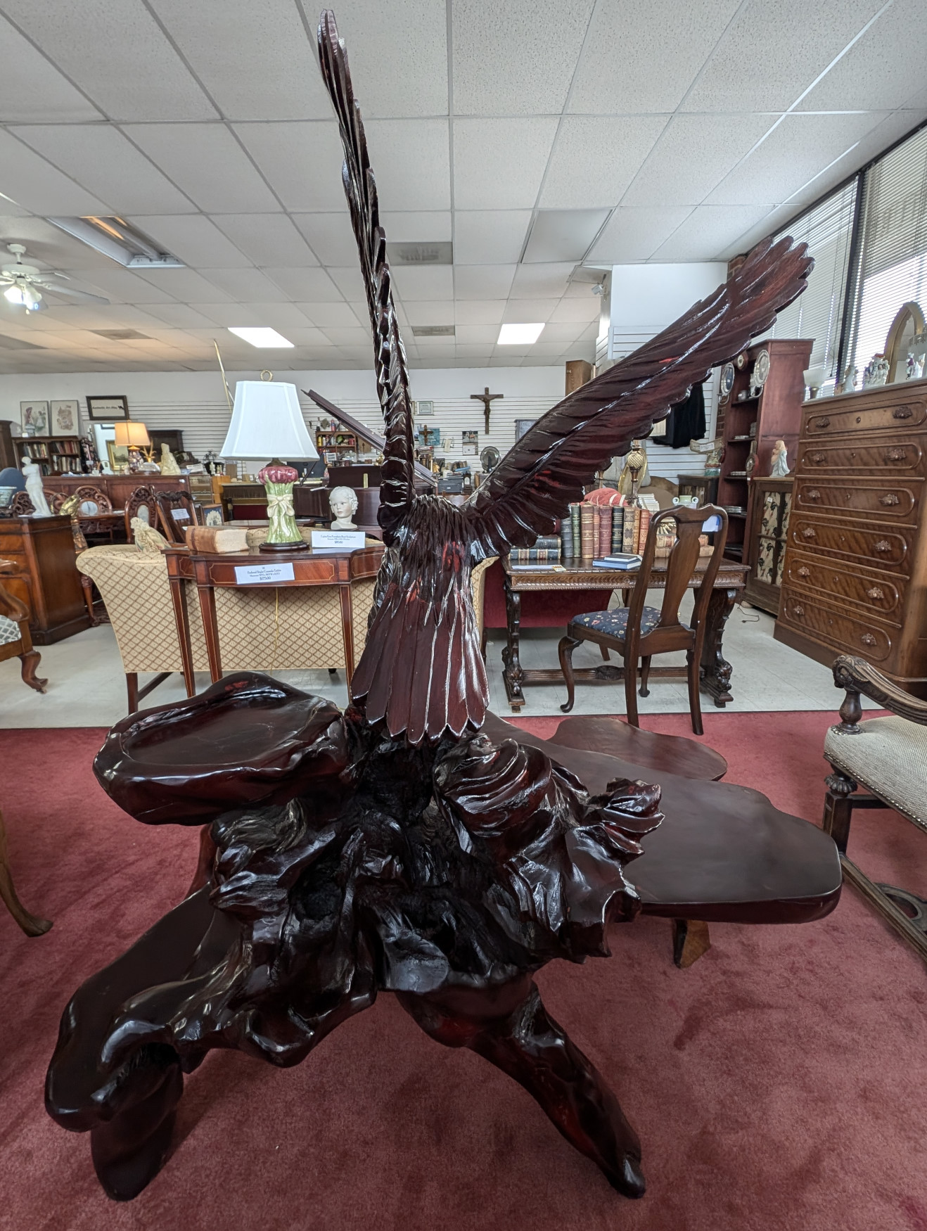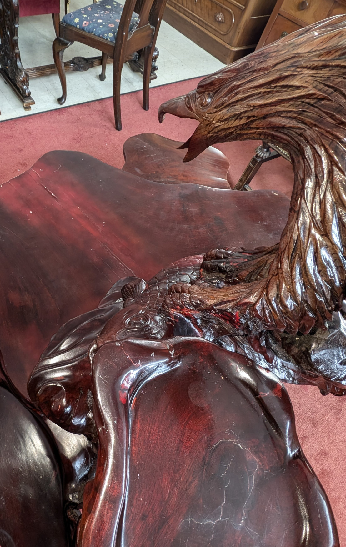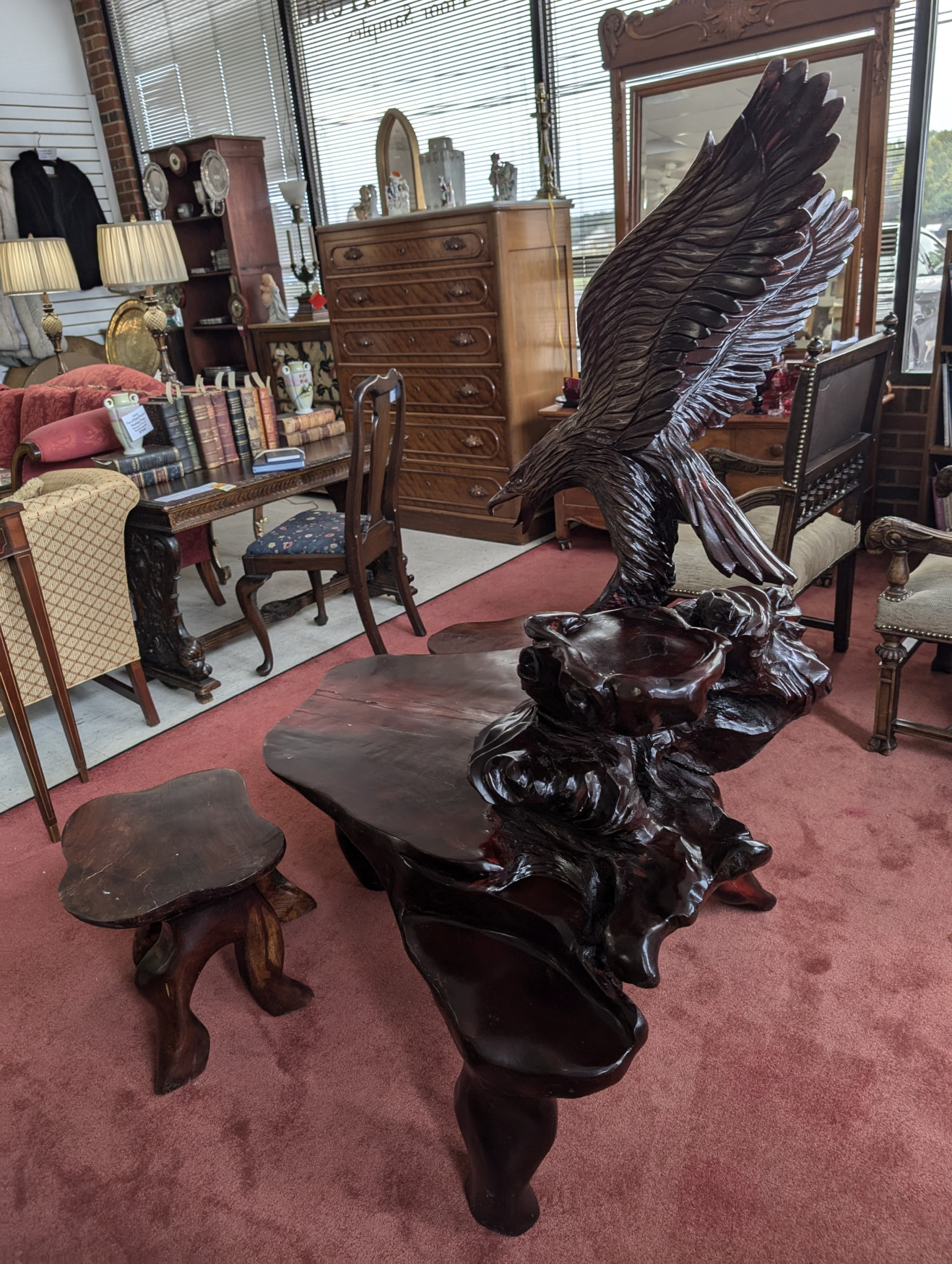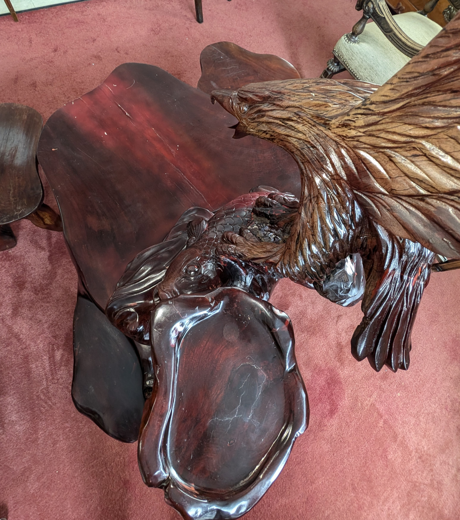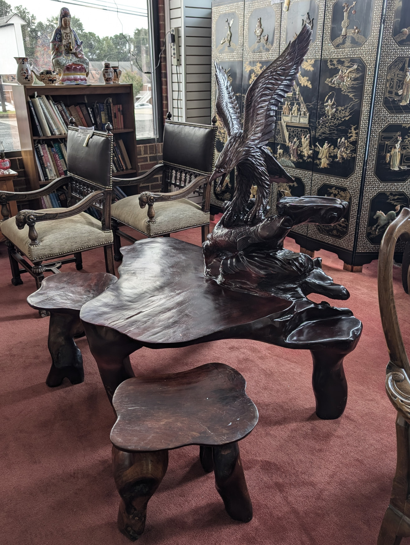 What a cool find! You don’t see this everywhere! Solid Rosewood, The table has a magnificent carved eagle holding a koi fish in his talons, a smaller flat surface next to sculpture for displaying a plant or any other piece you may have, Large flat table surface for displaying or eating, Comes with 2 matching, solid rosewood stools. The piece is very well made, heavy, solid and sturdy, It has some cracks in the wood due to the nature of wood, and a few scratches and nicks, does not affect the stability of the piece. Please see all photos for condition.