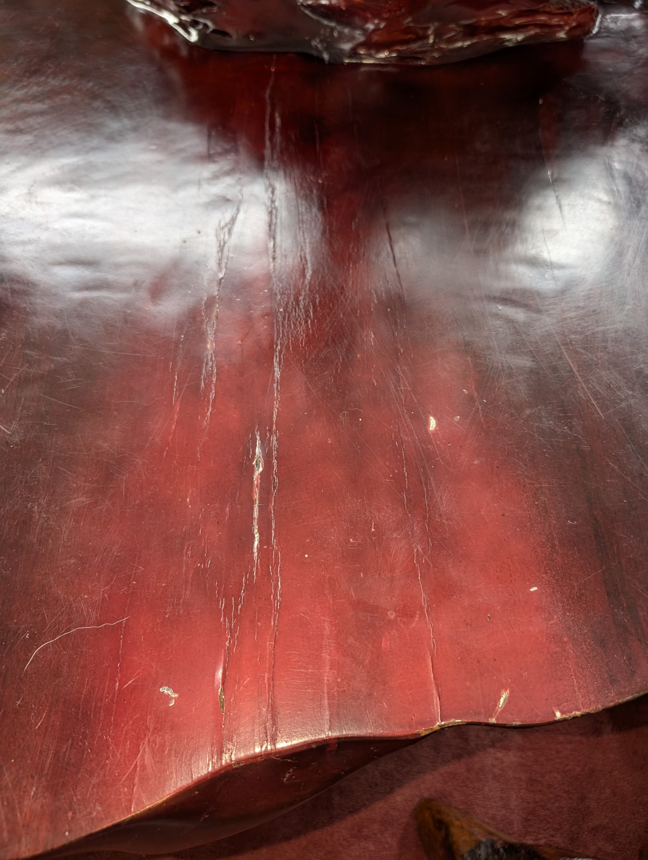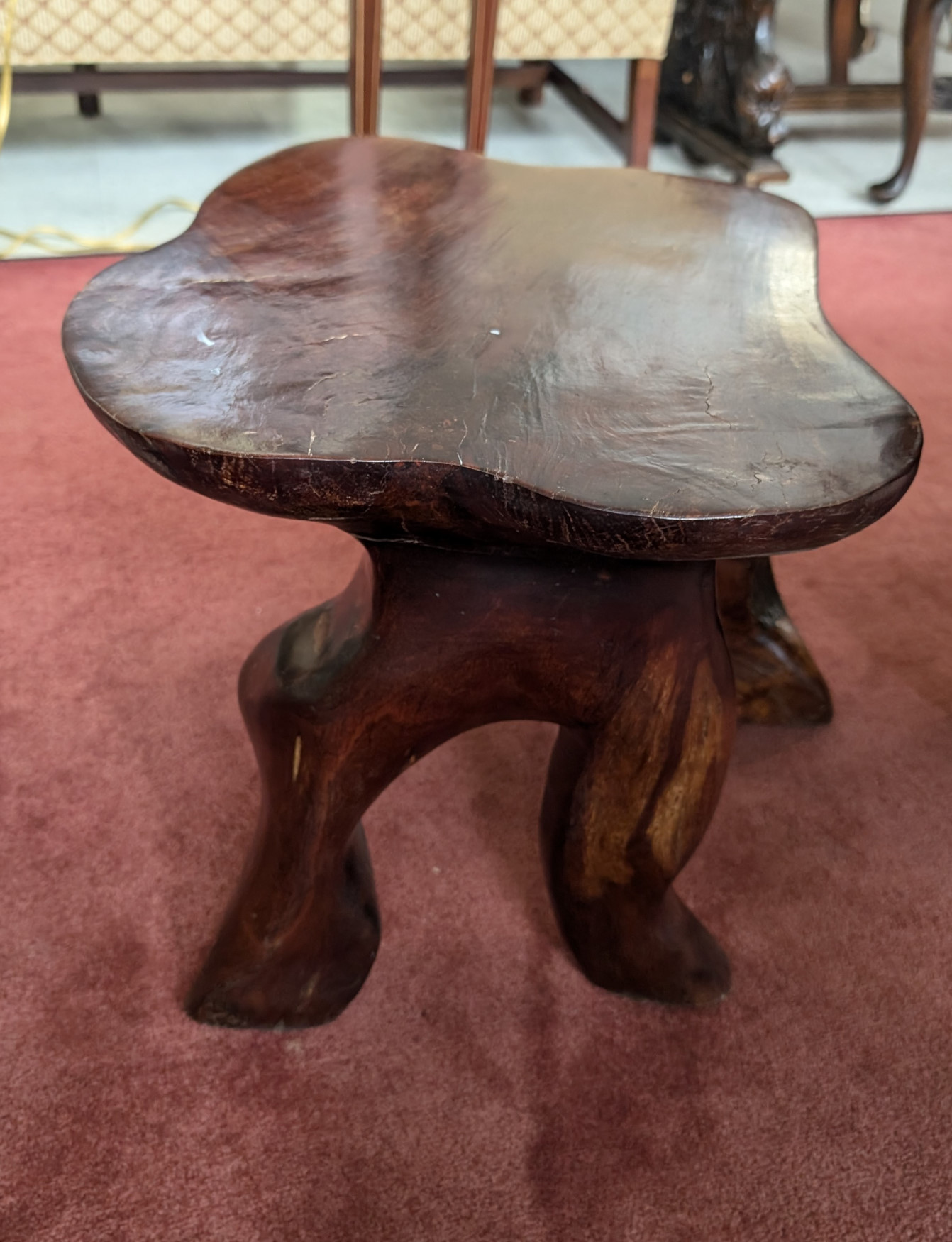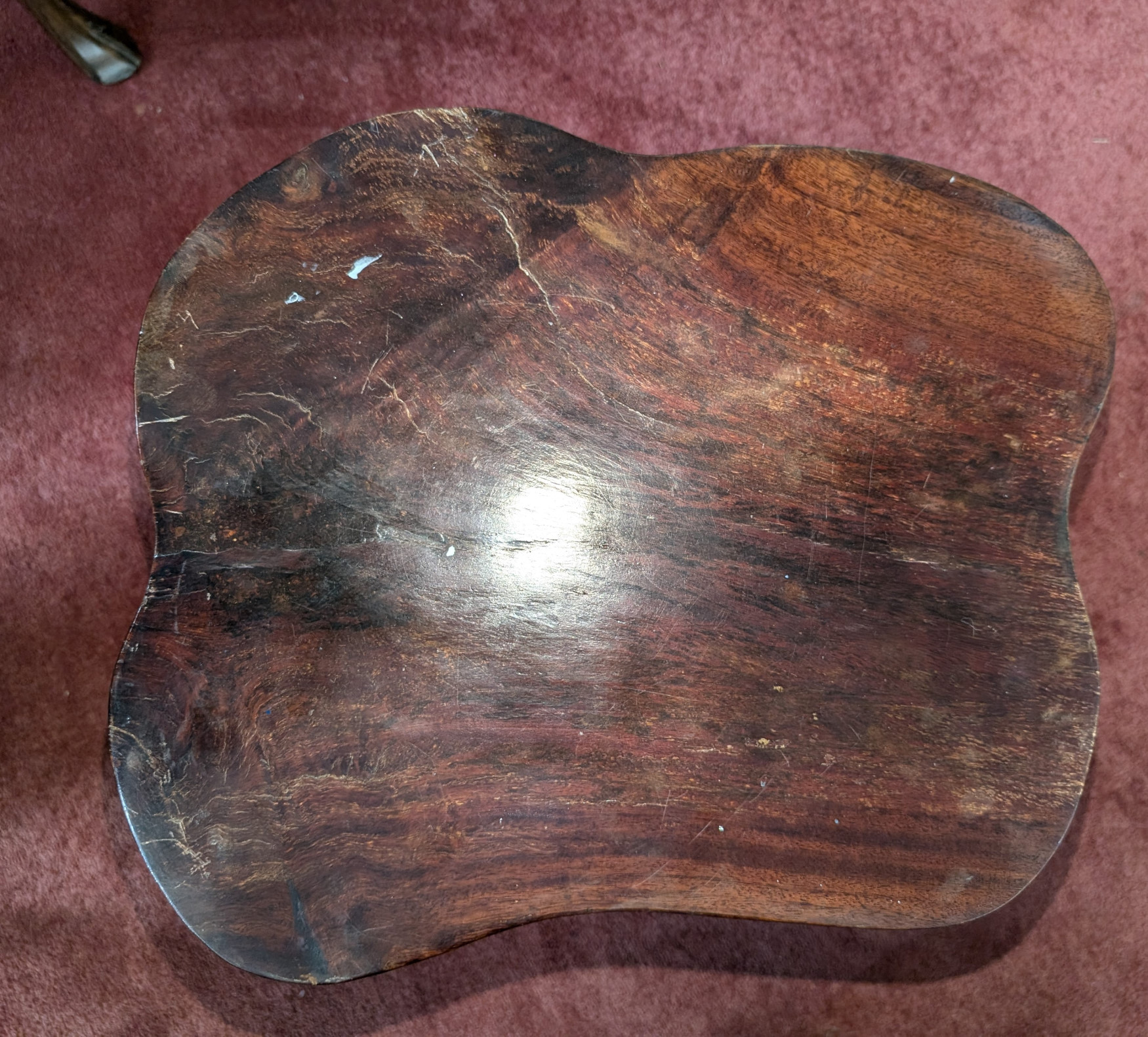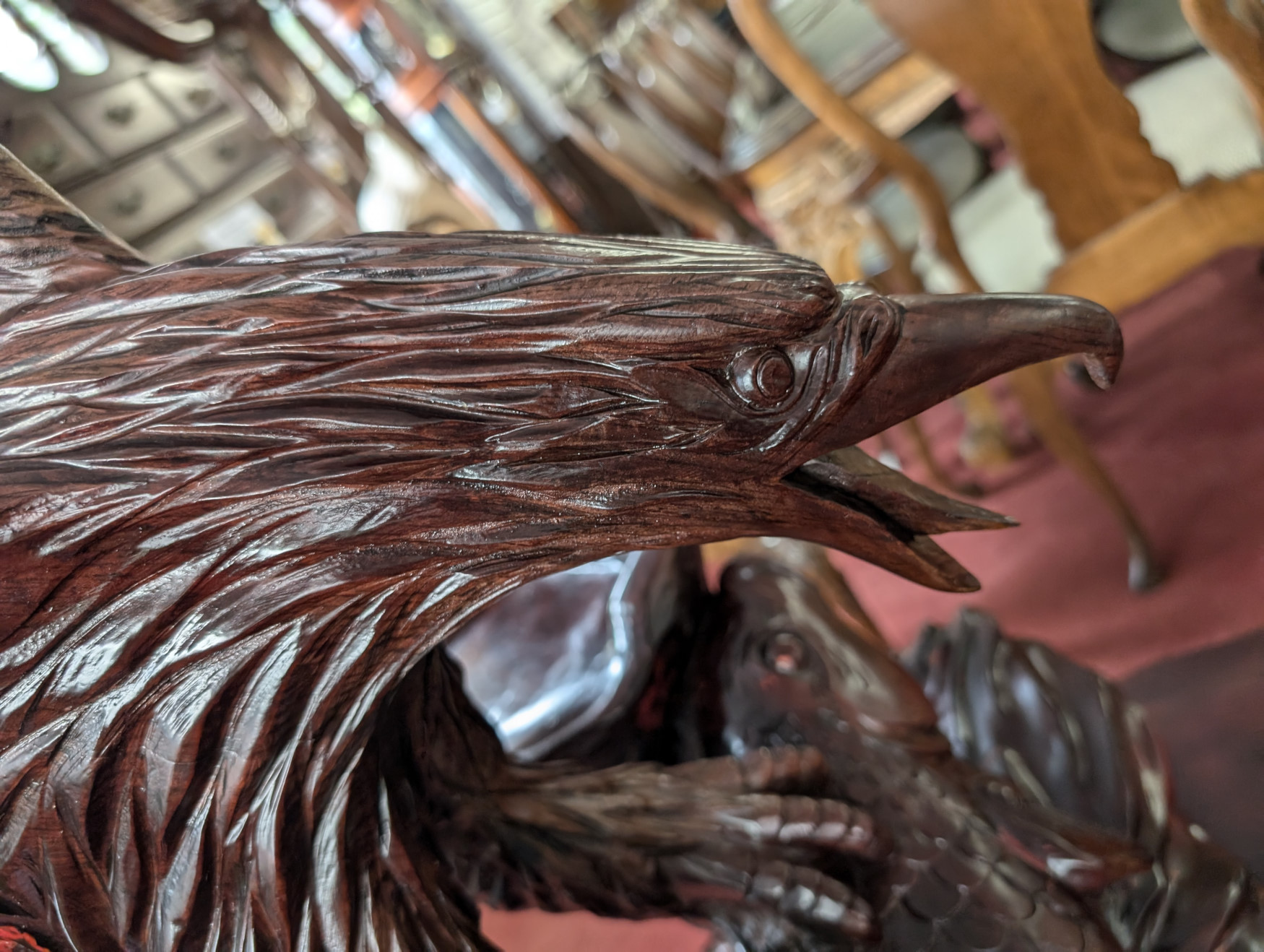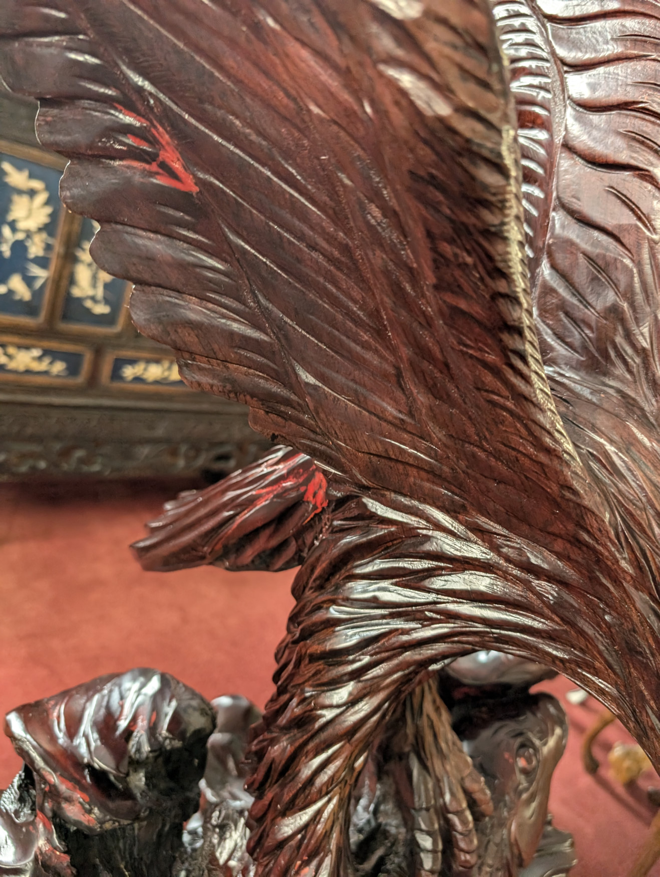 What a cool find! You don’t see this everywhere! Solid Rosewood, The table has a magnificent carved eagle holding a koi fish in his talons, a smaller flat surface next to sculpture for displaying a plant or any other piece you may have, Large flat table surface for displaying or eating, Comes with 2 matching, solid rosewood stools. The piece is very well made, heavy, solid and sturdy, It has some cracks in the wood due to the nature of wood, and a few scratches and nicks, does not affect the stability of the piece. Please see all photos for condition.